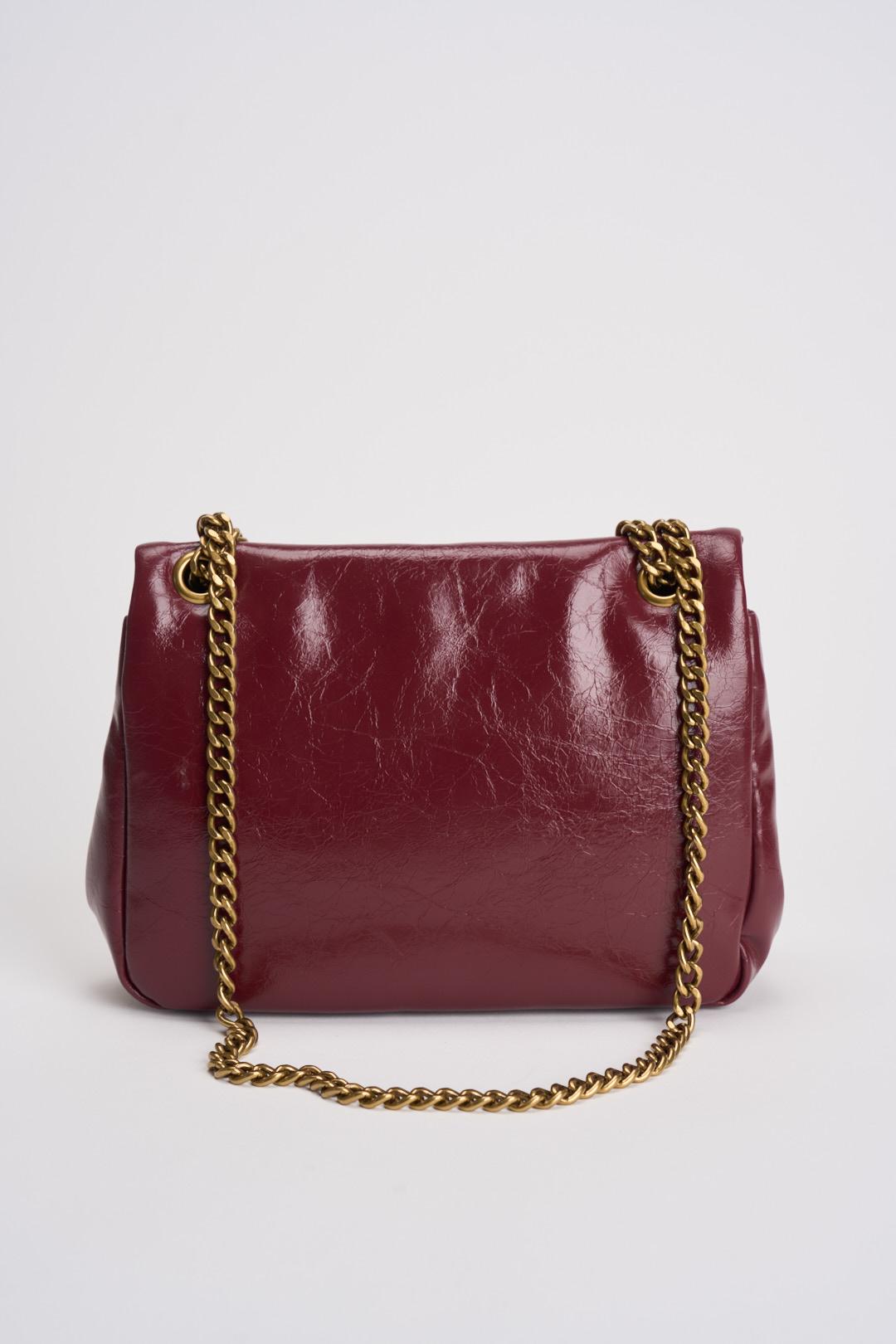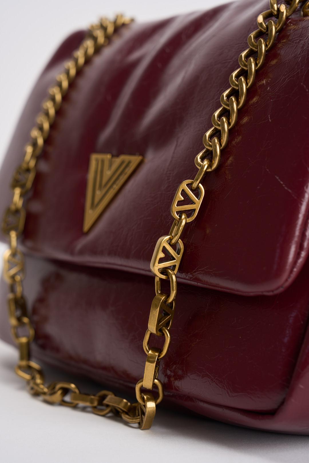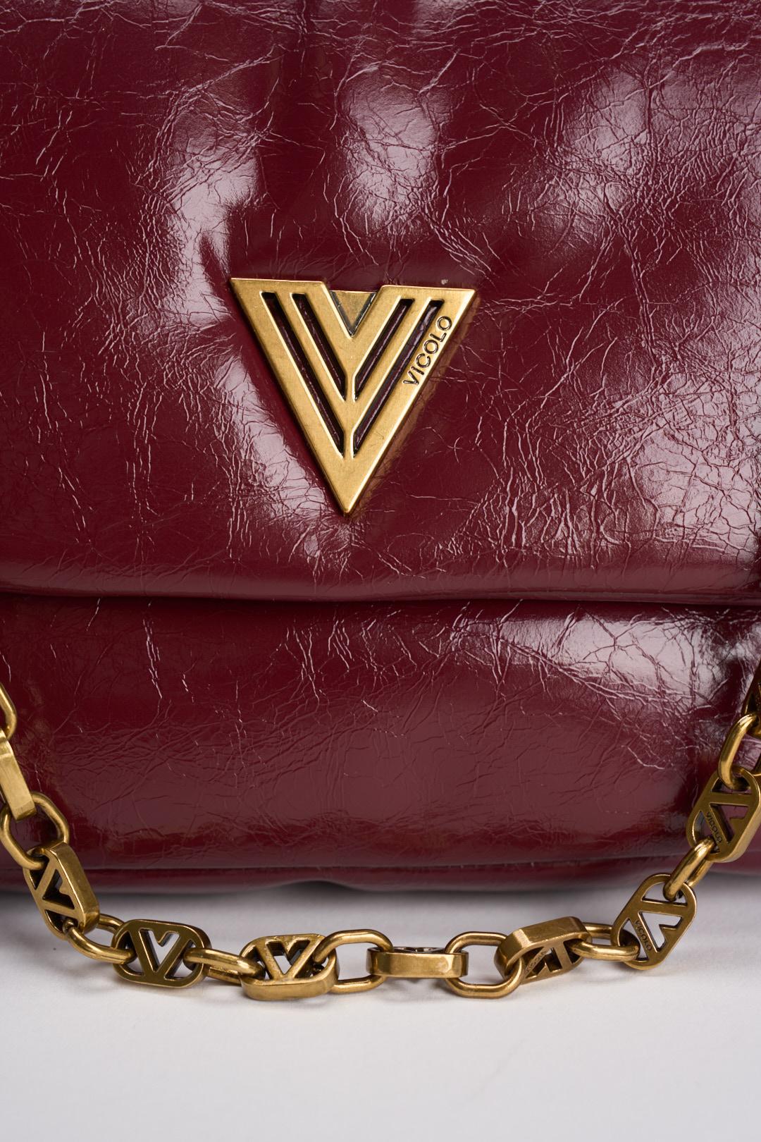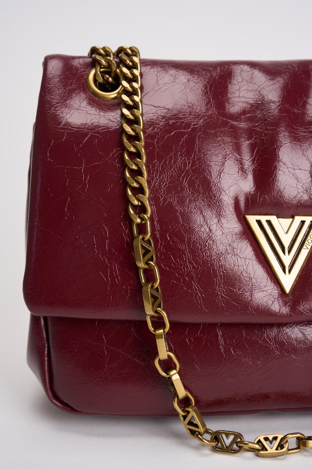 VICOLO Borsa donna semilucida bordeaux. Modello a spalla o a tracolla con chiusura con bottone a pressione con calamita. Dettaglio fibbia V metal plate Vicolo. Tracolla con catena scorrevole dorata. Tasca interna con cerniera, taschina e tasca esterna. Bottoni laterali per rendere la borsa ancora più capiente. Composizione: 100% Poliuretano.