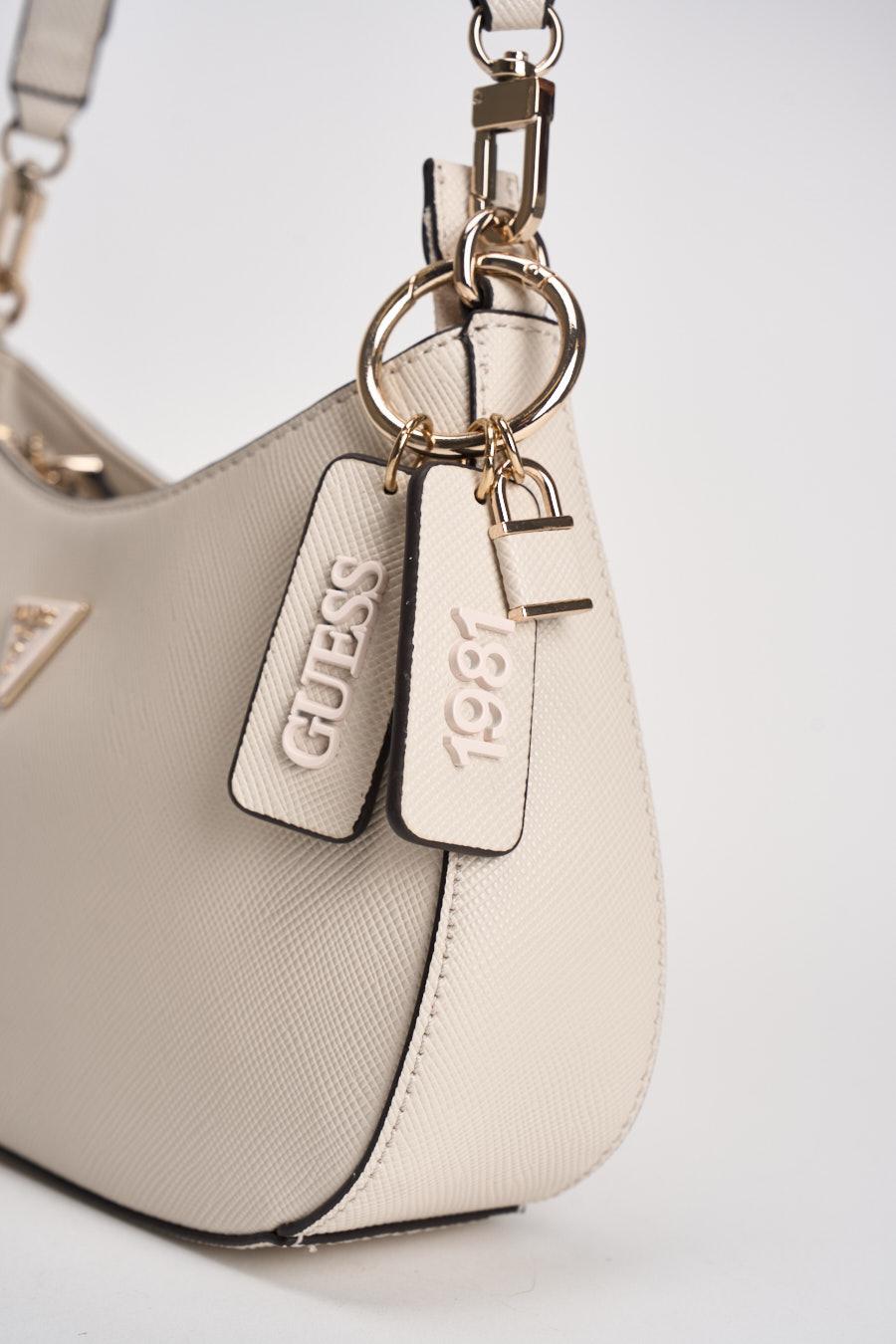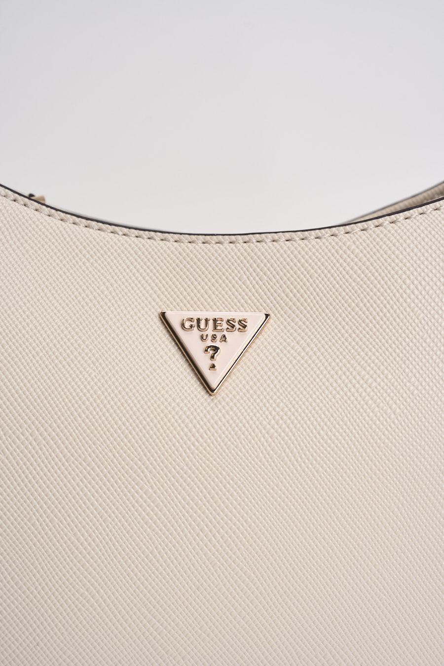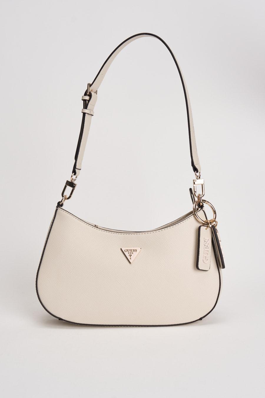 GUESS Borsa Noelle nera bianca. Modello con design a mezza luna, logo a triangolo sul davanti. Tracolla regolabile. Lavorazione saffiano. Charm removibile. Tasca interna con zip. Chiusura con zip. Misure: 29x18x6 cm.