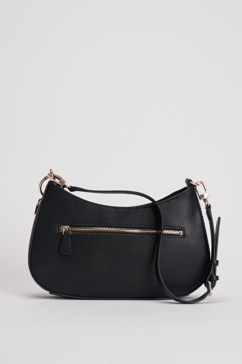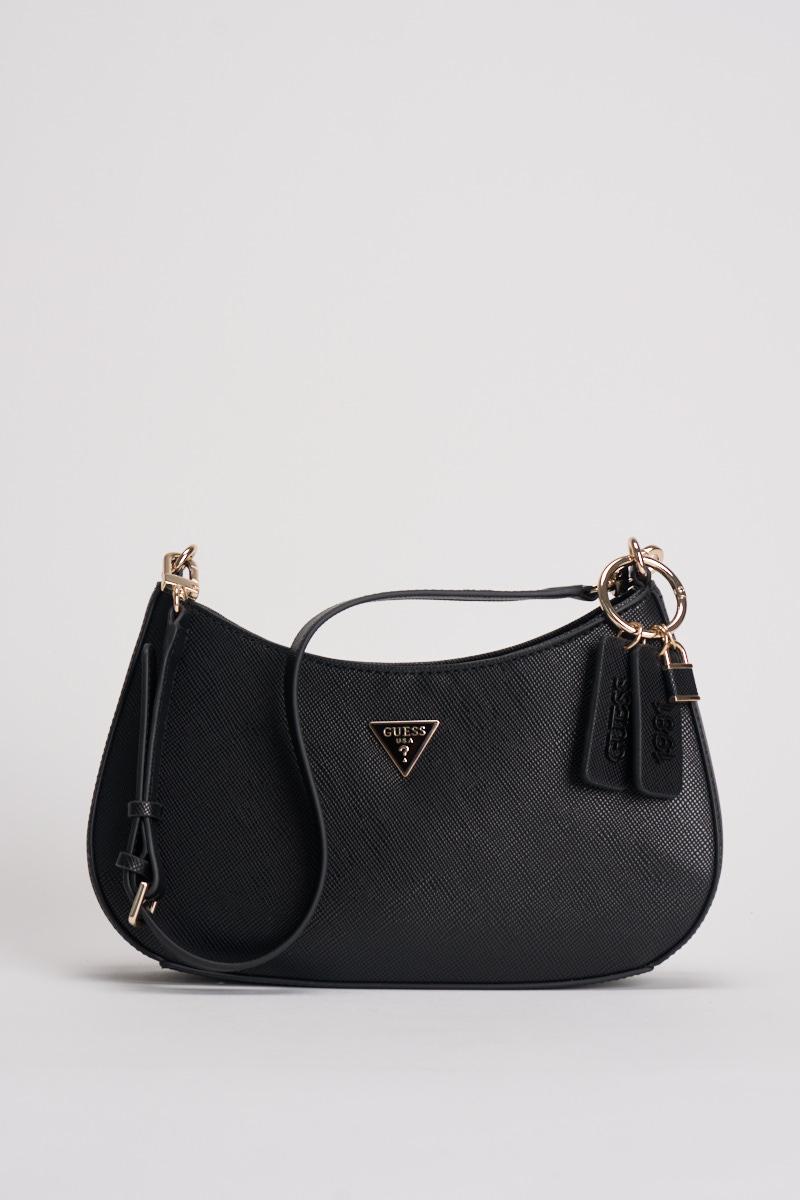 GUESS Borsa Noelle nera donna. Modello con design a mezza luna, logo a triangolo sul davanti. Tracolla regolabile. Lavorazione saffiano. Charm removibile. Tasca interna con zip. Chiusura con zip. Misure: 29x18x6 cm.
