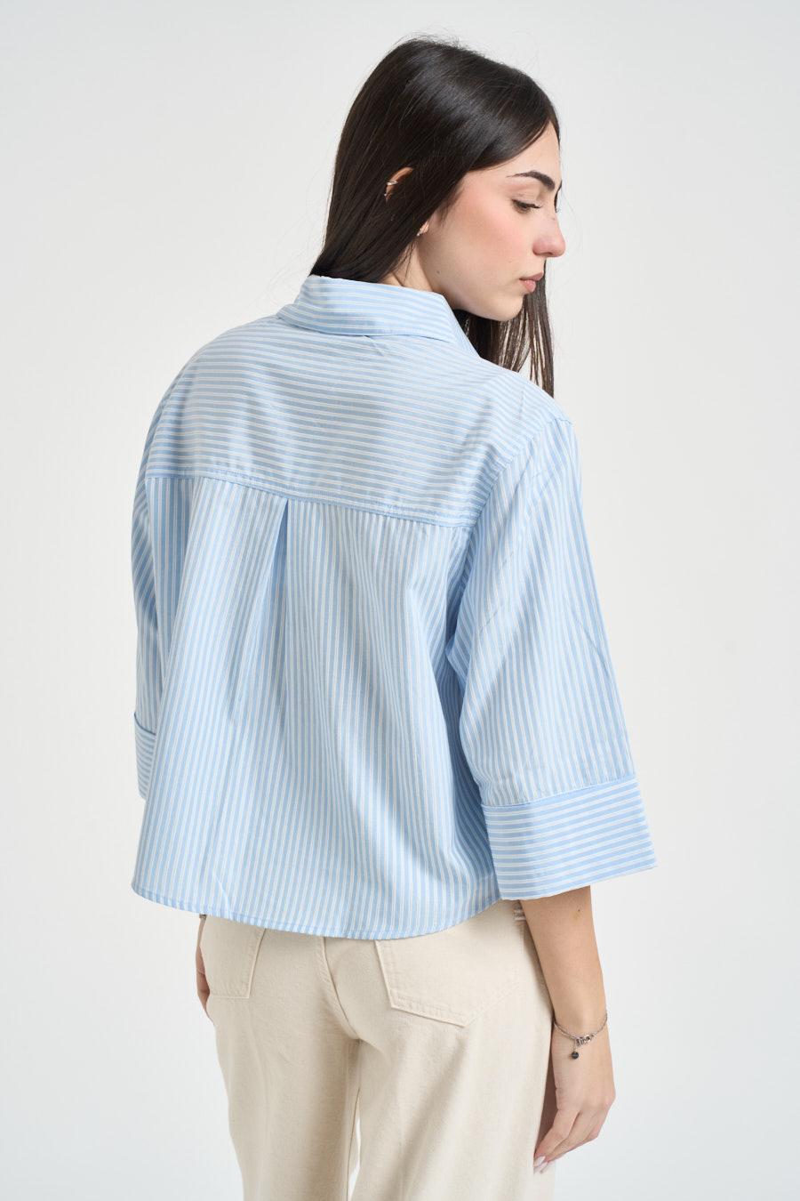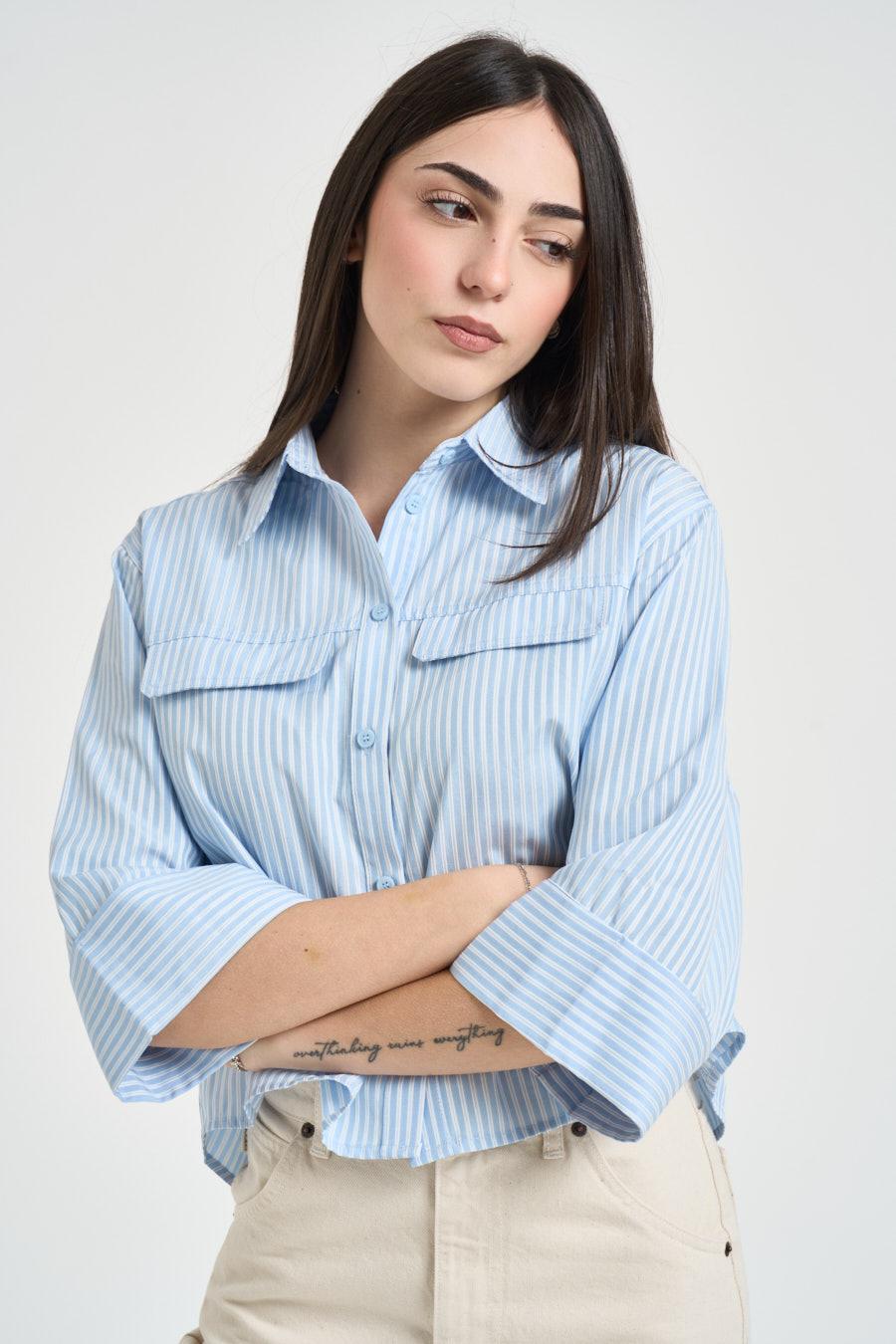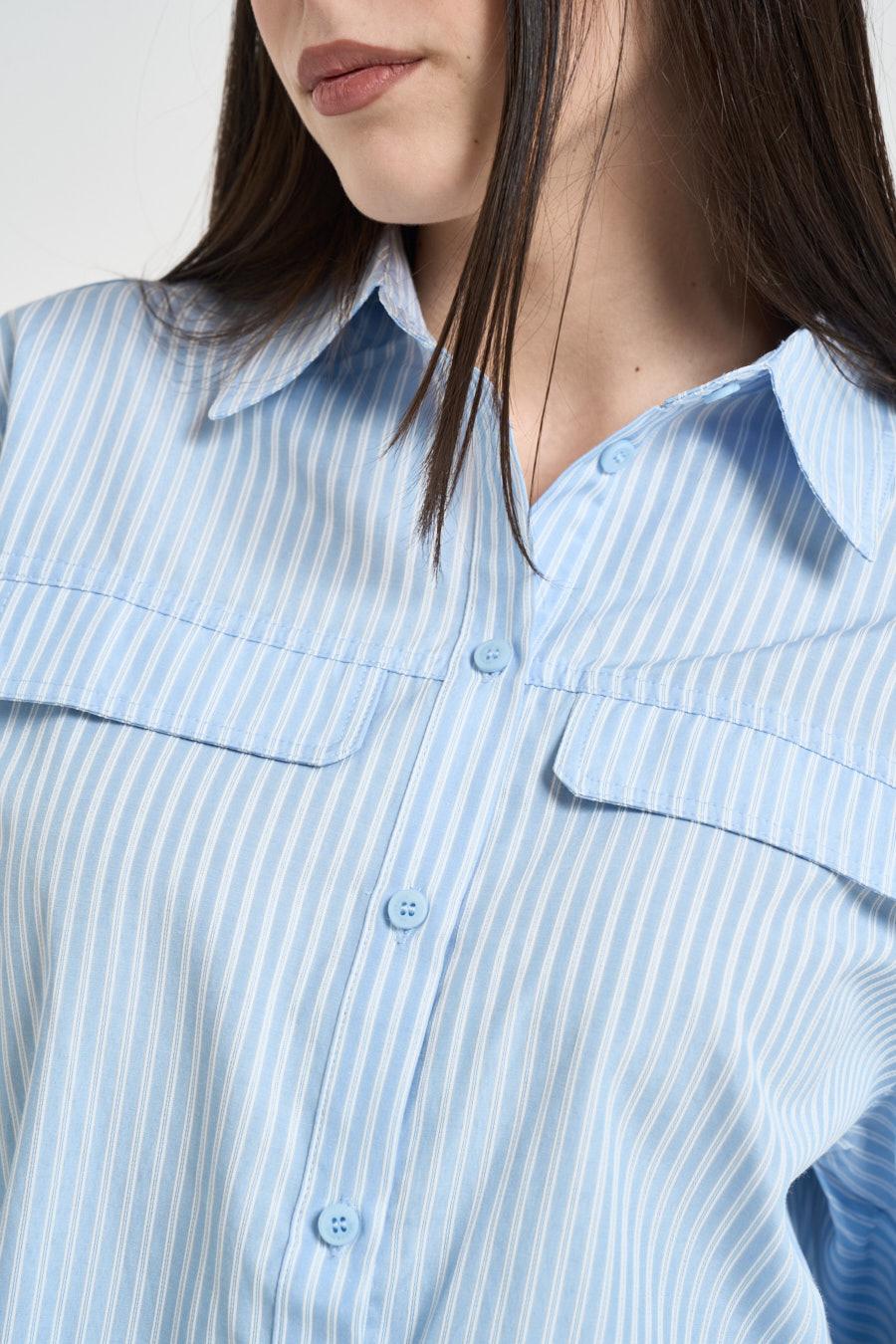 GRACE AND MILA Camicia donna a righe azzurre. Modello dal taglio corto con fantasia a righe verticali, colletto classico e chiusura frontale con bottoni. Maniche ampie a tre quarti con polsino alto, tasche applicate sul petto con patta. Composizione: 100% cotone. La modella è alta 172cm e indossa la taglia 40.