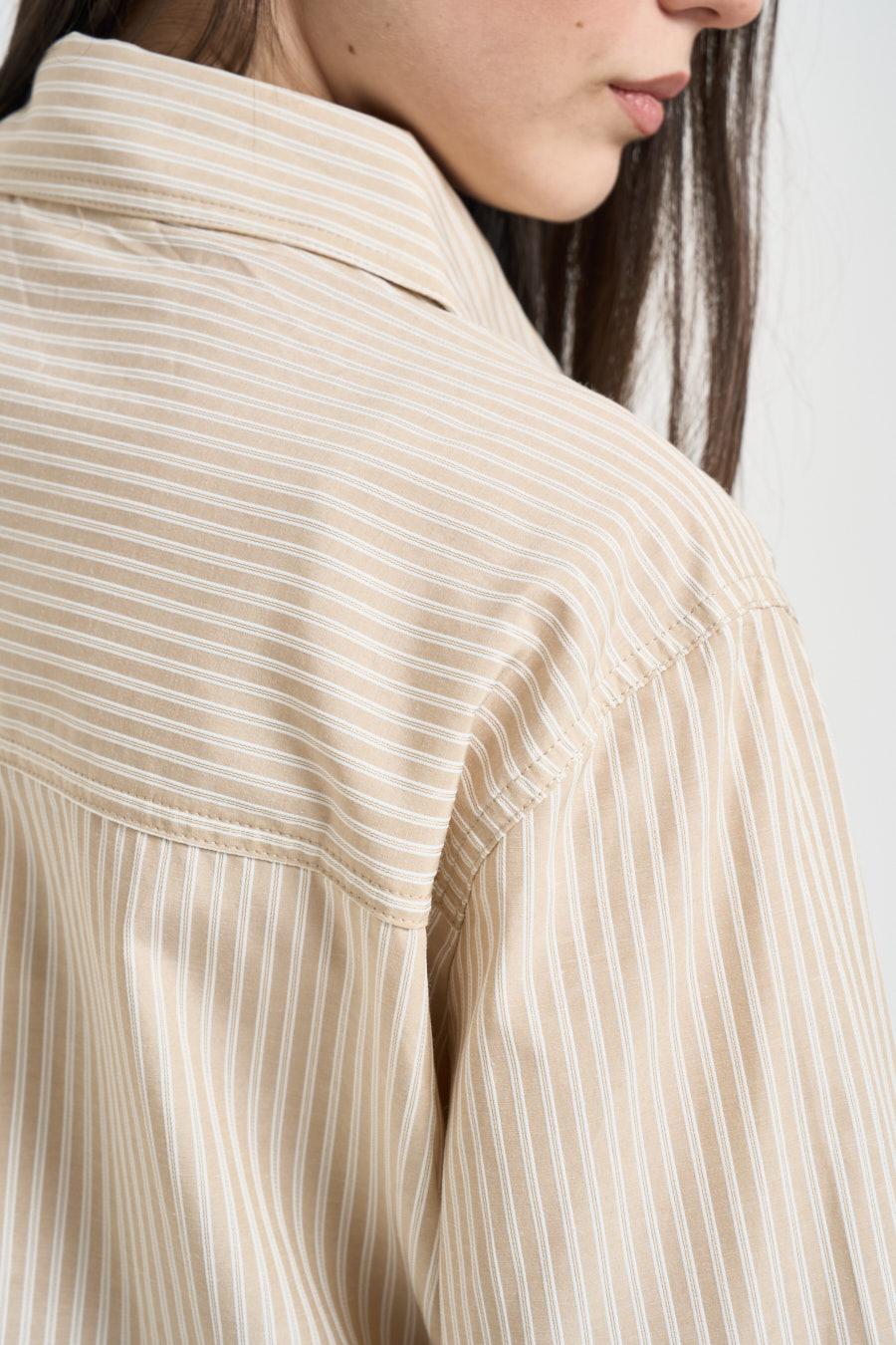 GRACE AND MILA Camicia donna a righe crema. Modello dal taglio corto con fantasia a righe verticali, colletto classico e chiusura frontale con bottoni. Maniche ampie a tre quarti con polsino alto, tasche applicate sul petto con patta. Composizione: 100% cotone. La modella è alta 172cm e indossa la taglia 40.