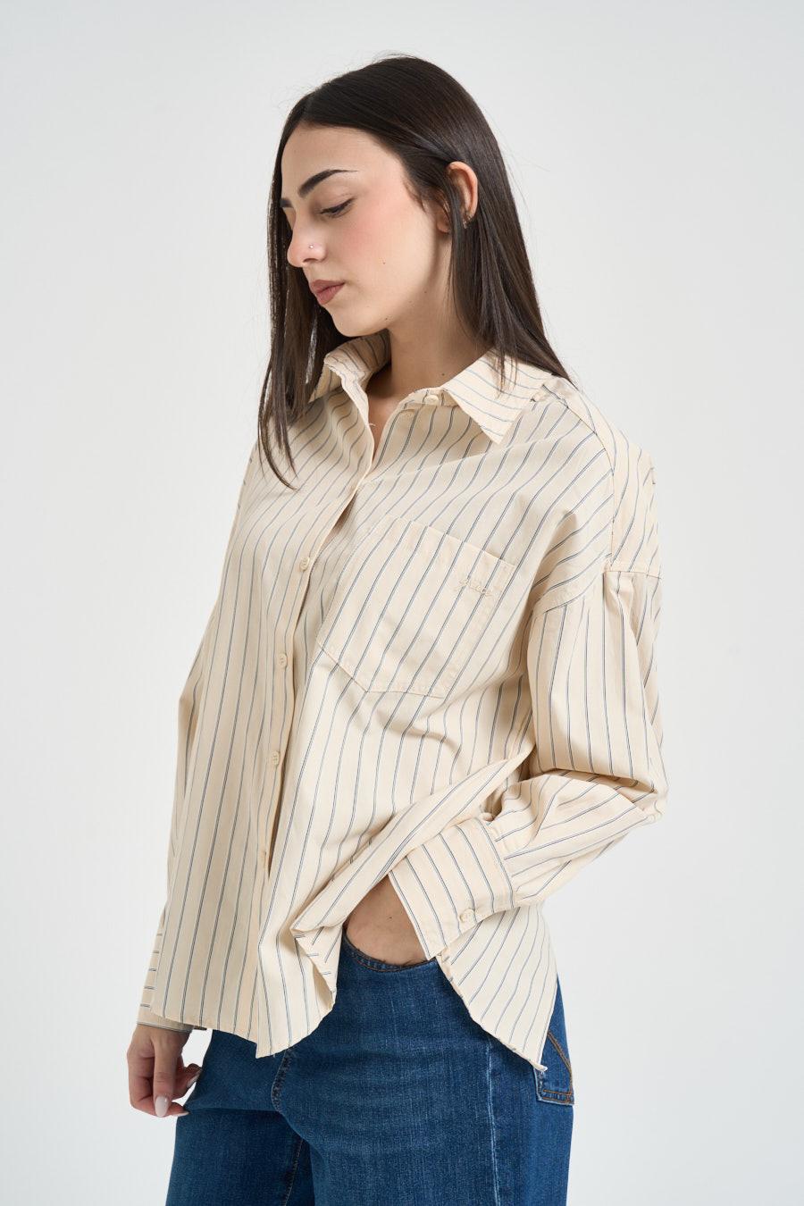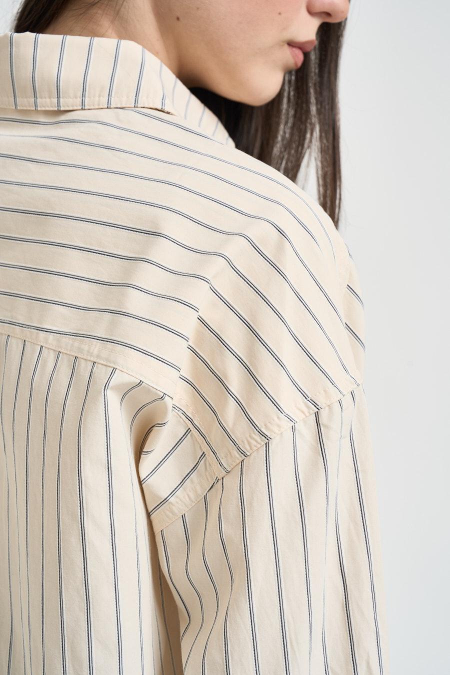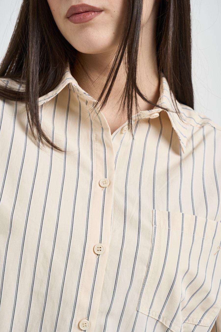 GRACE AND MILA Camicia donna a righe giallo pastello. Modello oversize con classico colletto e chiusura con bottoncini, particolarità dell'apertura nel retro con fiocchetti. Composizione: 50%cotone 40%poliestere 10%viscosa. La modella è alta 172cm e indossa la taglia XS.