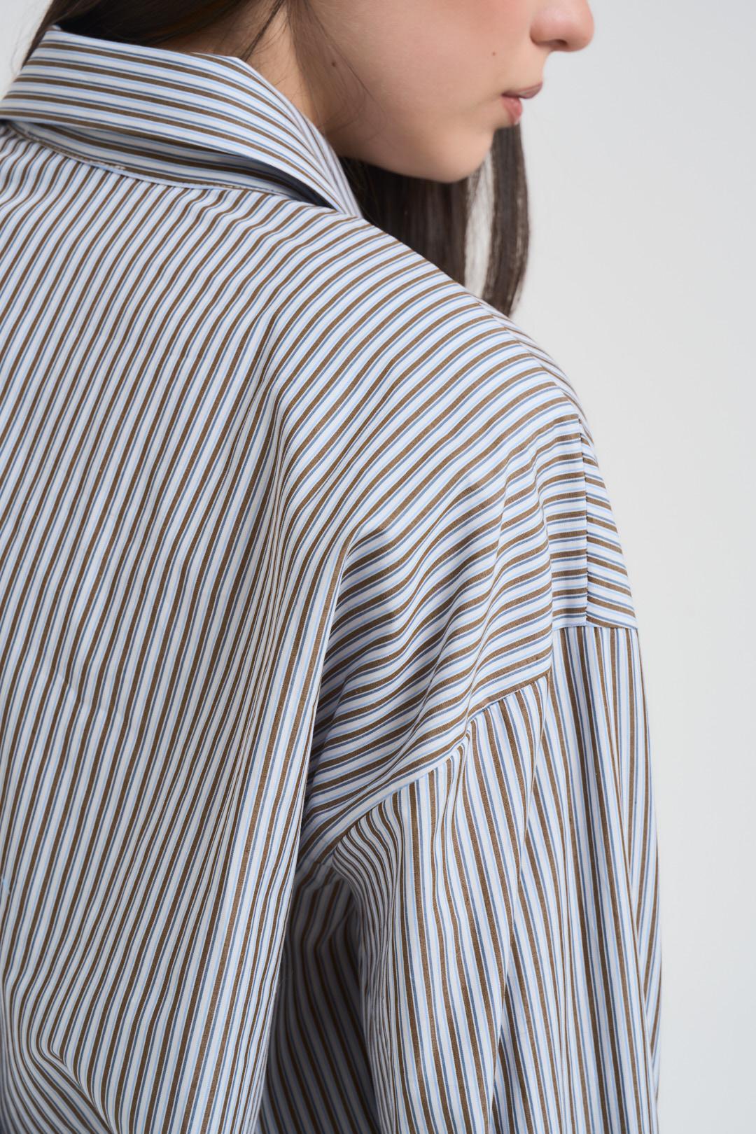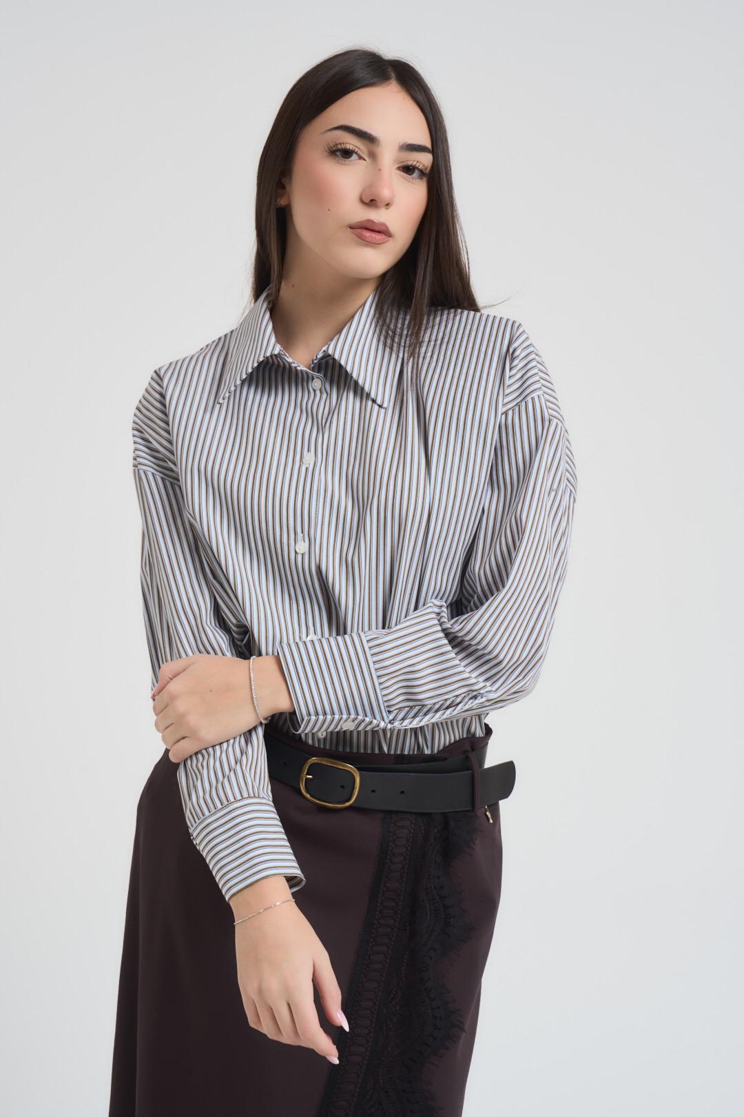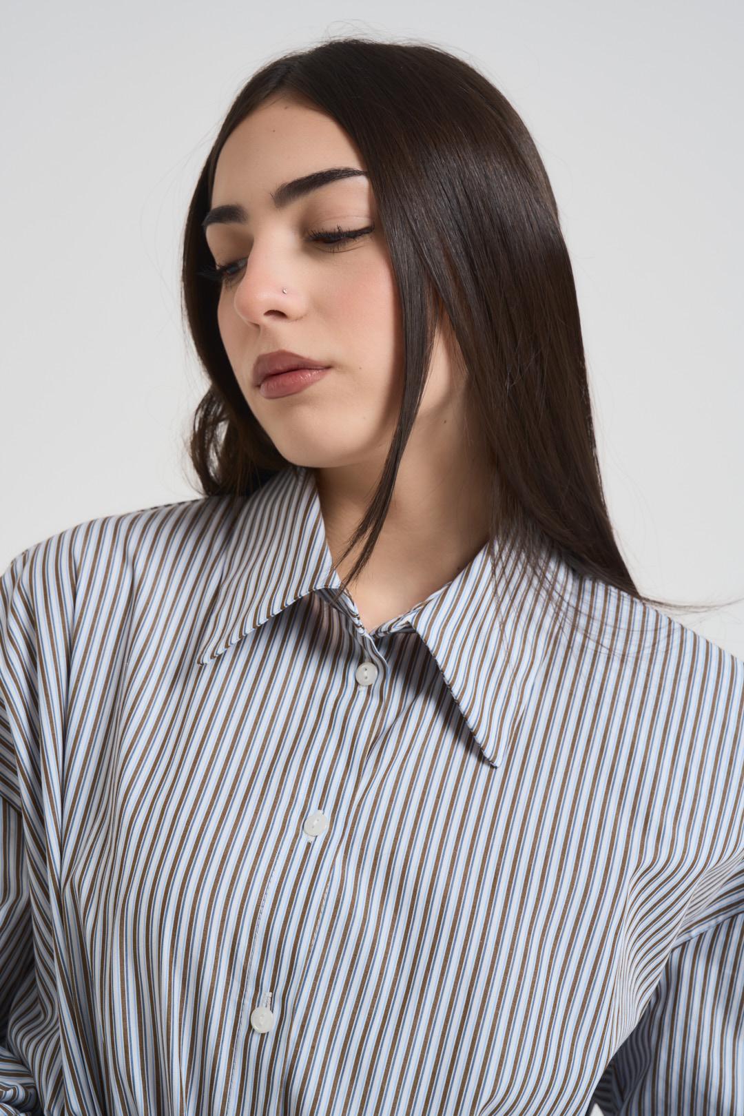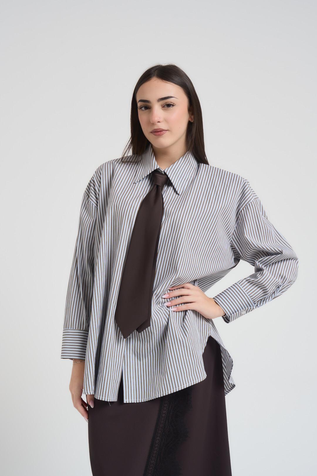 MOTEL Camicia donna a righe moro. Modello relaxed fit. Colletto classico. Chiusura frontale con bottoni. Manica lunga. Giromanica sceso. Chiusura con bottone sul polso. Cravatta incorporata satinata marrone. Composizione: 100% Cotone. La modella è alta 172 cm e indossa la taglia S.