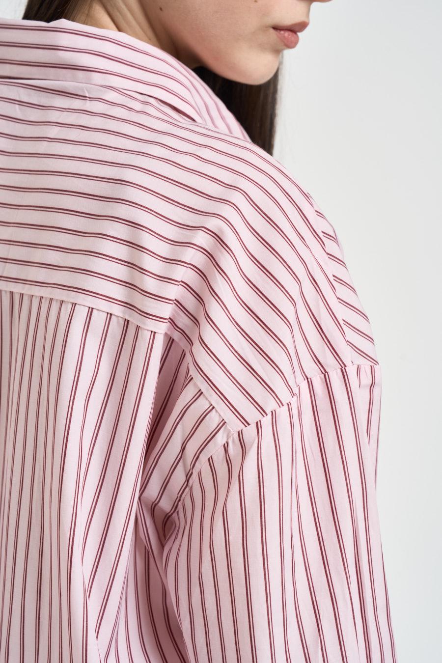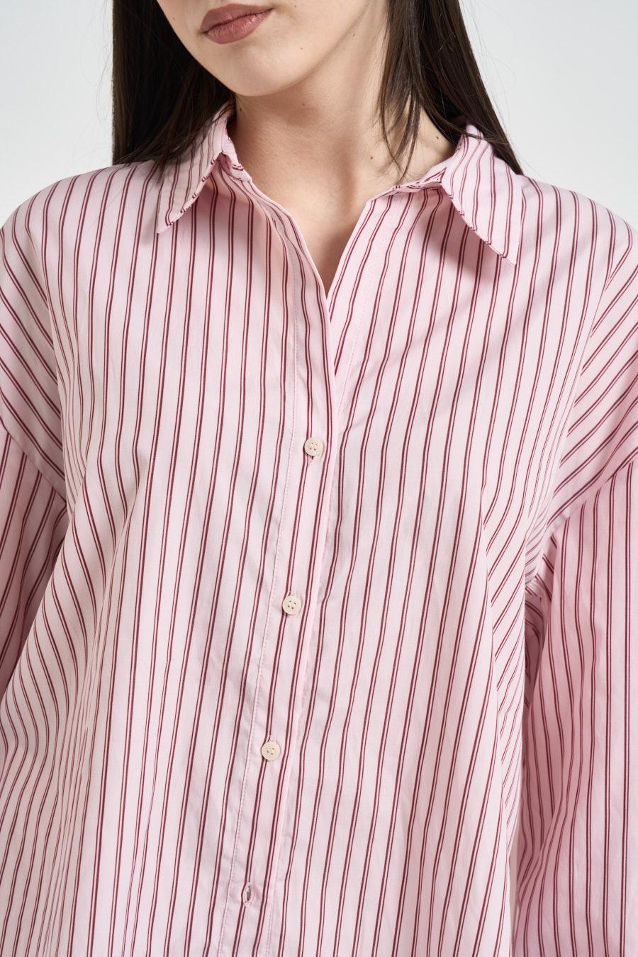 ONLY Camicia donna a righe rosa. Modello regular fit. Fantasia a righe. Chiusura frontale con bottoncini. Manica lunga. Fondo manica con bottone. Colletto classico. Composizione: 65% poliestere, 35% cotone. La modella è alta 172 cm e indossa la taglia S.