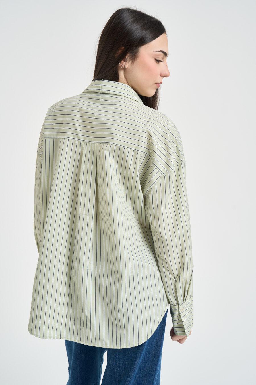 ONLY Camicia donna a righe verde. Modello regular fit. Fantasia a righe. Chiusura frontale con bottoncini. Manica lunga. Fondo manica con bottone. Colletto classico. Composizione: 65% poliestere, 35% cotone. La modella è alta 172 cm e indossa la taglia S.