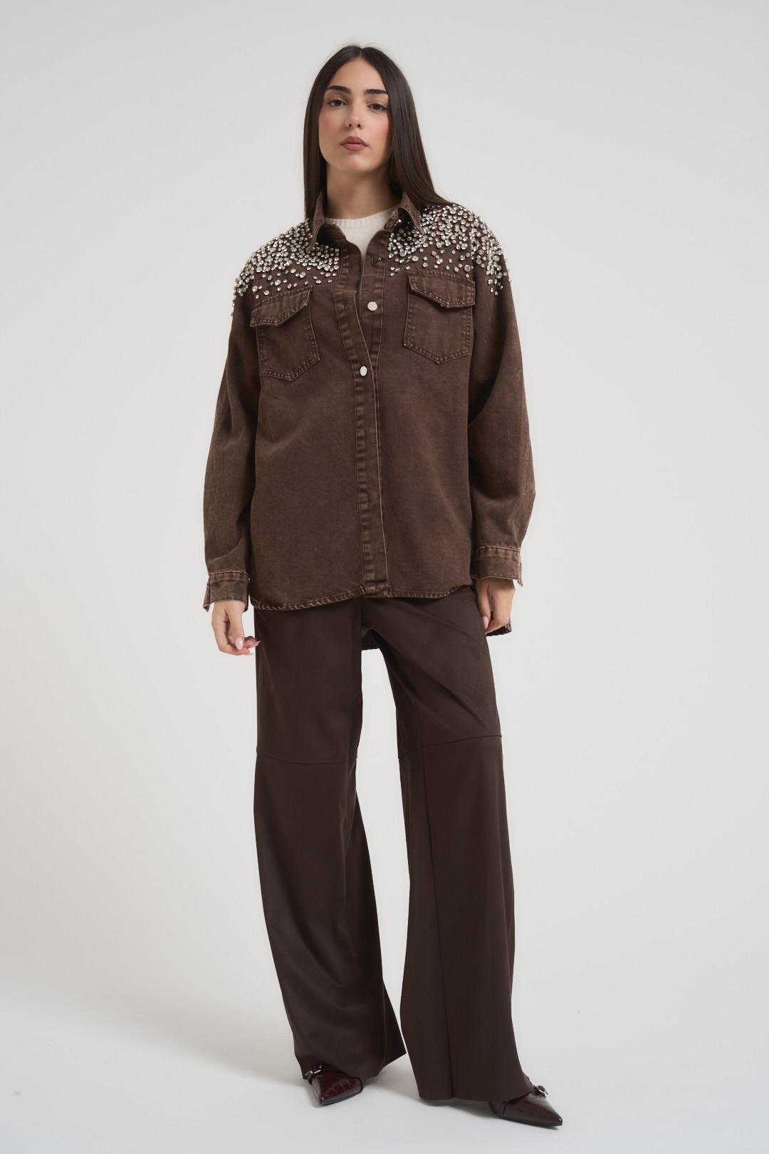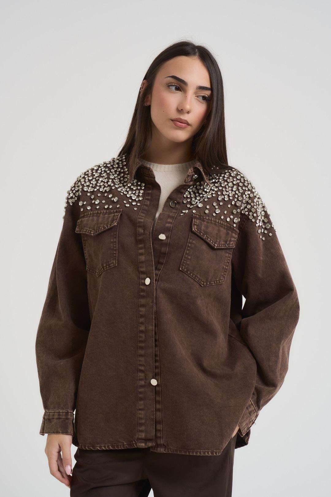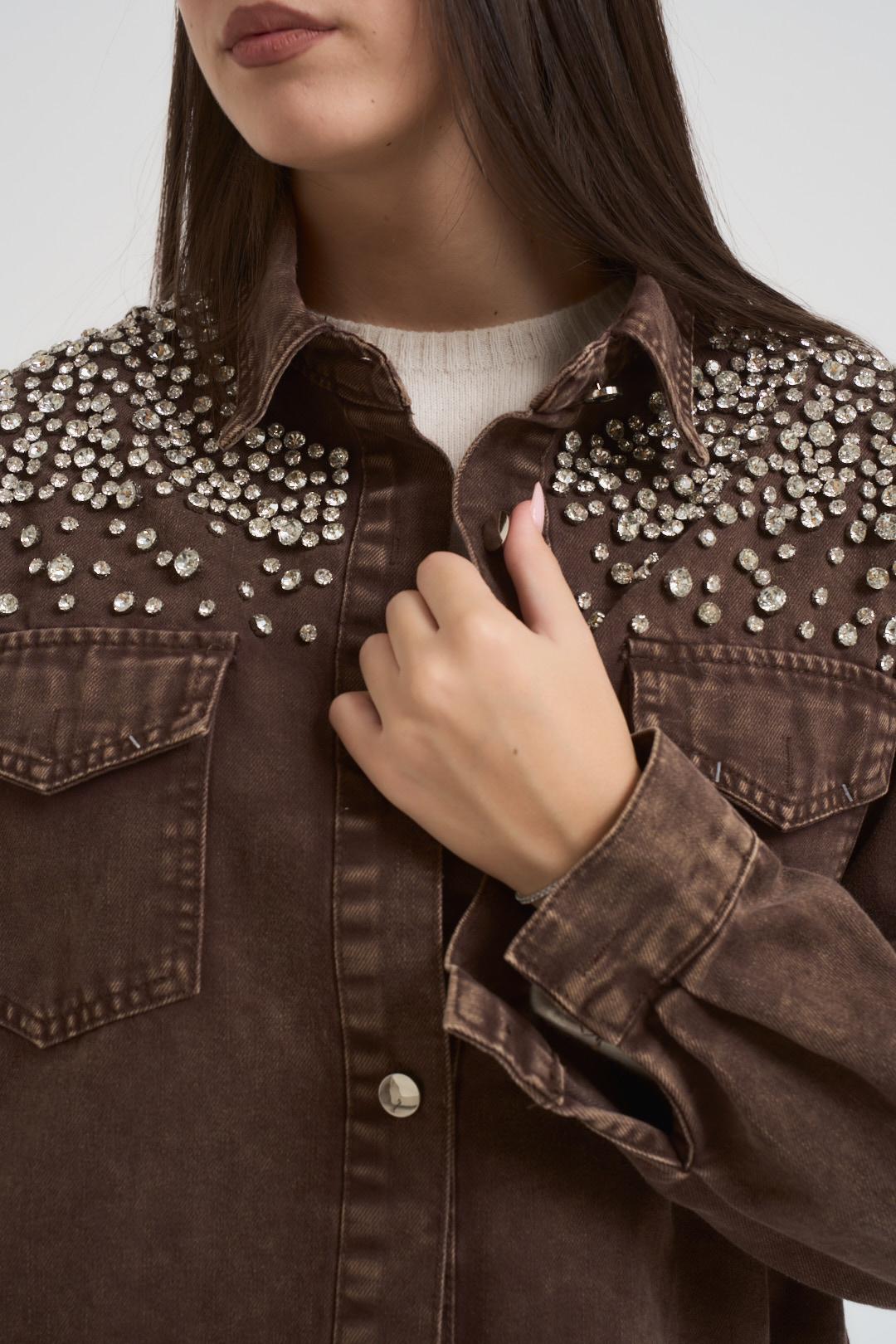 SUSY MIX Camicia donna in denim marrone con strass. Modello con chiusura a bottoni, due tasche con patta sul petto, pioggia di strass sulle spalle. Composizione: 95% cotone 5% poliestere. La modella è alta 172 cm e indossa la taglia unica.