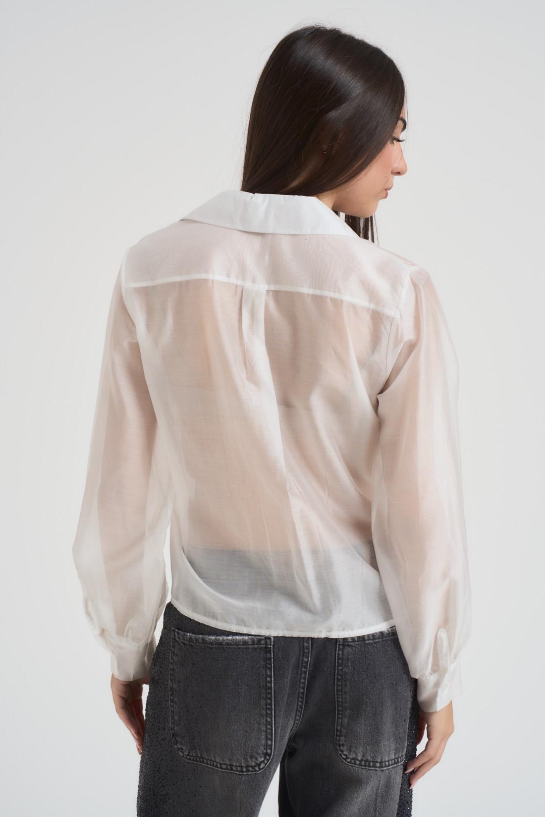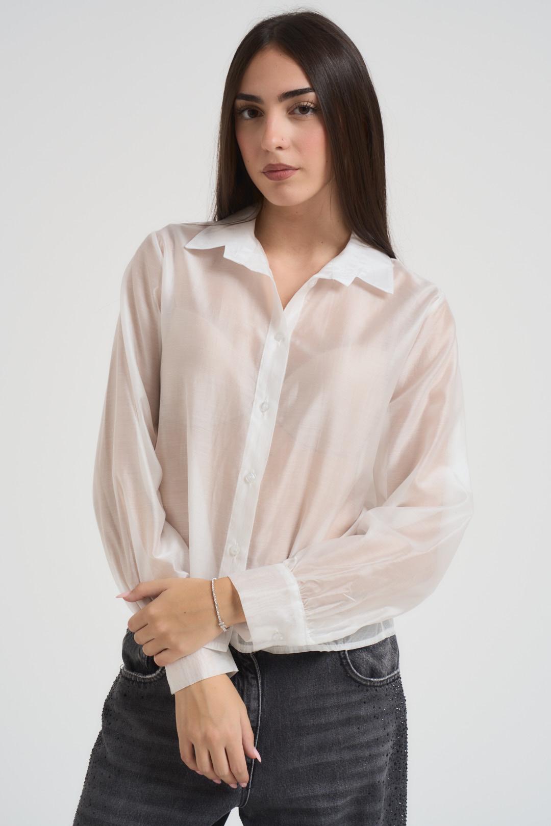 LOKITA MILANO Camicia donna in tessuto semitrasparente bianca. Modello con classico colletto, chiusura con bottoncini. Composizione: poliestere. La modella è alta 172 cm e indossa la taglia S.