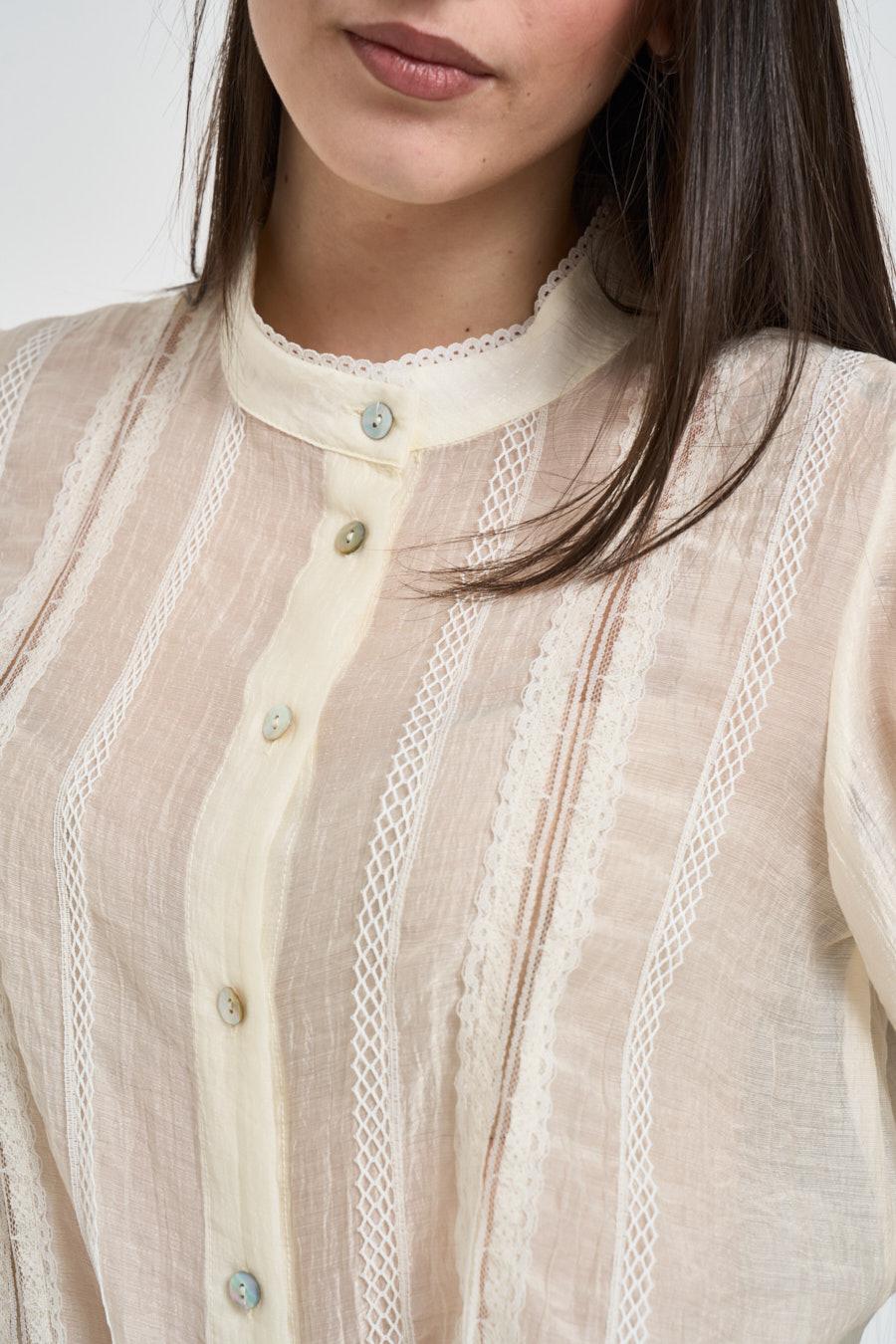 VICOLO Camicia donna semi-trasparente avorio. Modello con collo alla coreana e abbottonatura frontale, impreziosito da inserti in pizzo e lavorazioni verticali. La struttura in tessuto leggero e semi-trasparente. Vestibilità morbida con maniche lunghe e polsi rifiniti. Composizione: 85% Lyocell, 15% poliestere. La modella è alta 172 cm e indossa la taglia S.