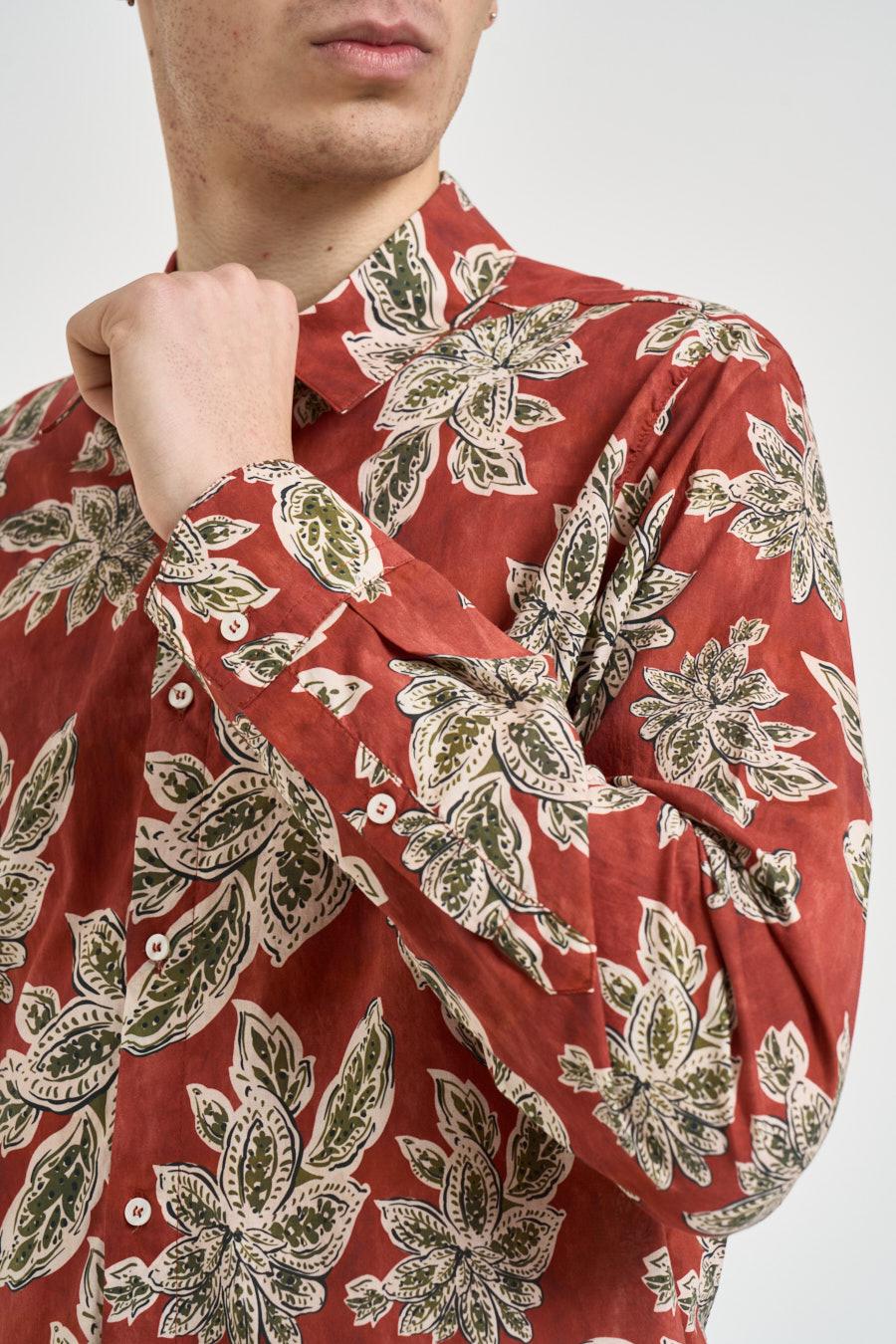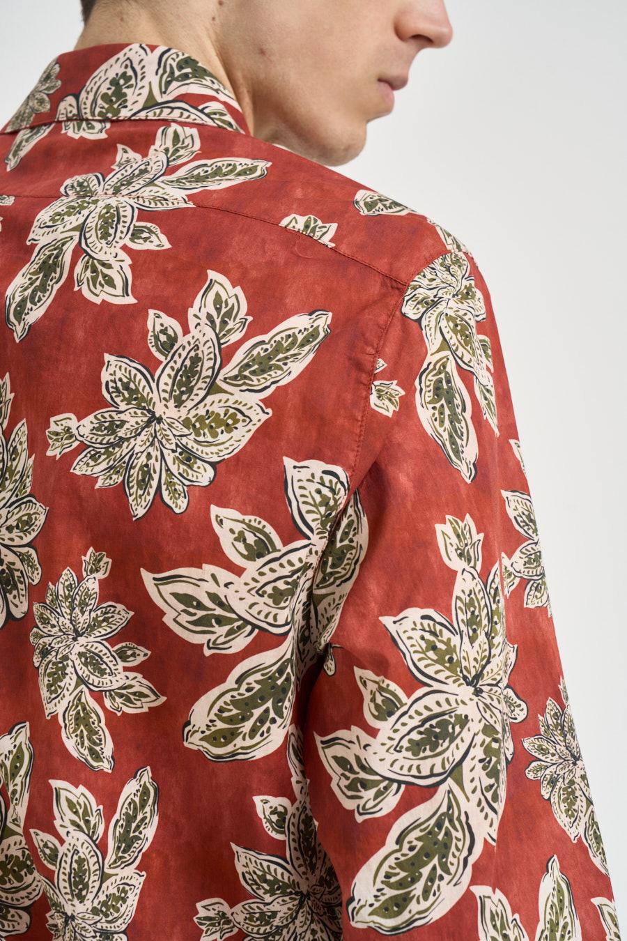 OFFICINA Camicia uomo a fantasia floreale. Modello con collo classico e maniche lunghe, caratterizzato da una vestibilità regolare. Realizzata in tessuto leggero, presenta chiusura frontale con bottoni. Il capo si distingue per la stampa floreale all-over che dona personalità e stile. Composizione: 100%cotone. Il modello è alto 190 cm e indossa la taglia L.