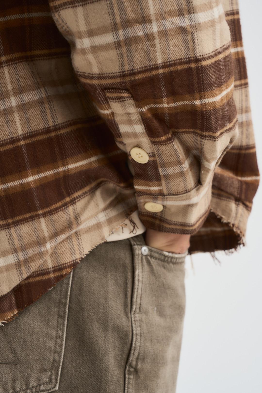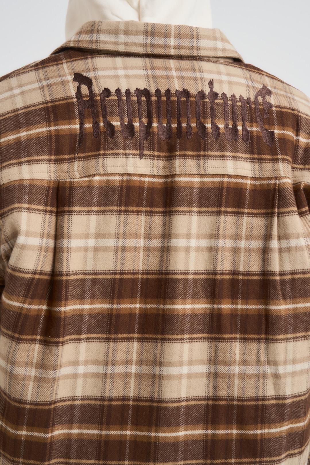 ACUPUNCTURE Camicia uomo a quadri marrone e beige. Modello a giubbotto, con tasca a patta sul petto a sinistra con logo stampato in nero, stampa sul retro sempre in nero. Composizione: 100% cotone. Il modello è alto 190 cm e indossa la taglia L.