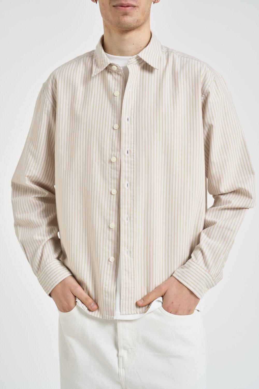 ONLY & SONS Camicia uomo a righe beige. Modello regular fit. Chiusura frontale con bottoni. Colletto classico. Manica lunga. Bottoni su fondo manica. Composizione: 60% Cotone, 40% Poliestere. Il modello è alto 190cm e indossa la taglia L.
