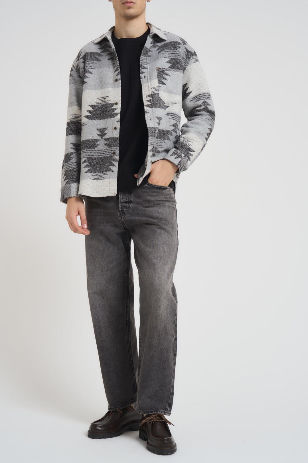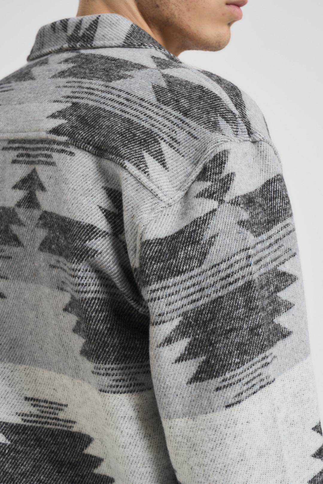 PONT DENIM Camicia uomo fantasia azteca grigia. Modello in flanella. Colori: antracite, grigio chiaro e bianco. Tasche a patta con bottoni. Composizione: 75% poliestere 25% cotone. Il modello è alto 190cm e indossa la taglia L.