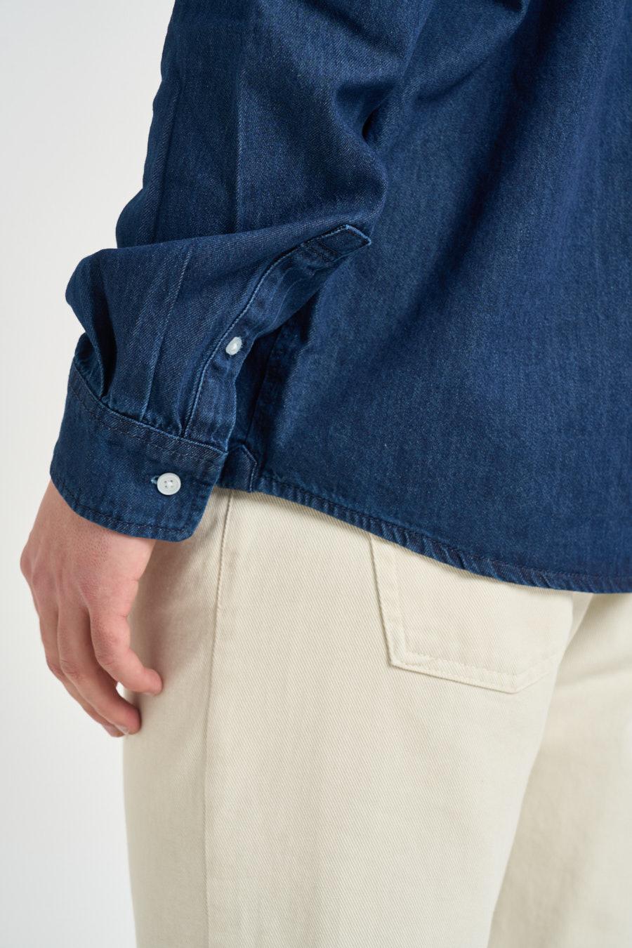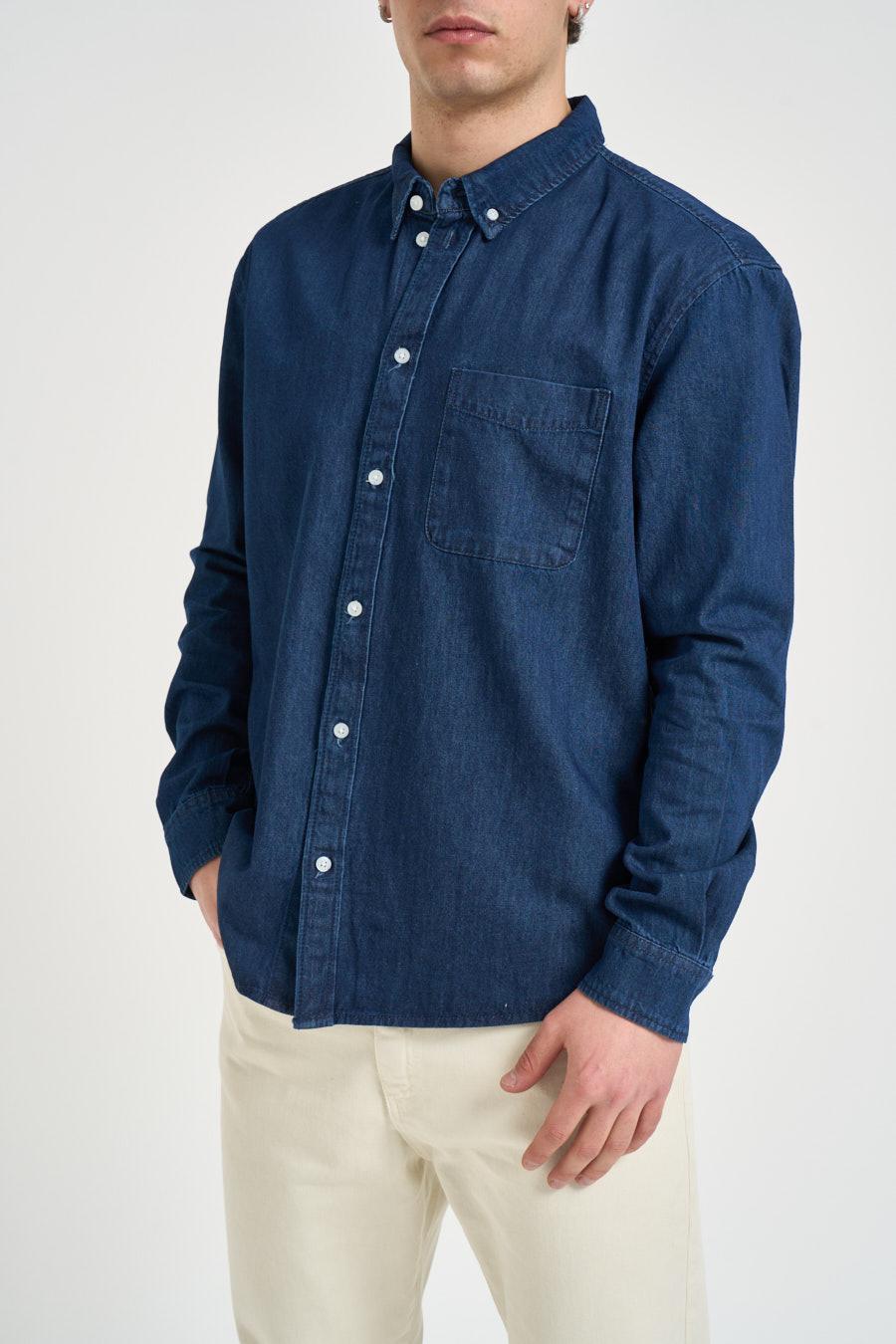 ONLY & SONS Camicia uomo in denim chiaro. Chiusura frontale con bottoni. Tasca applicata sul petto. Manica lunga. Chiusura bottoni su fondo manica. Il modello alto 190 cm e indossa la taglia L.