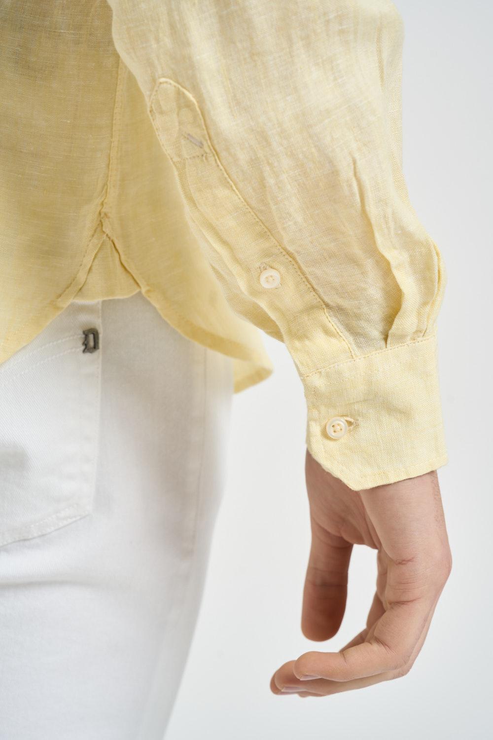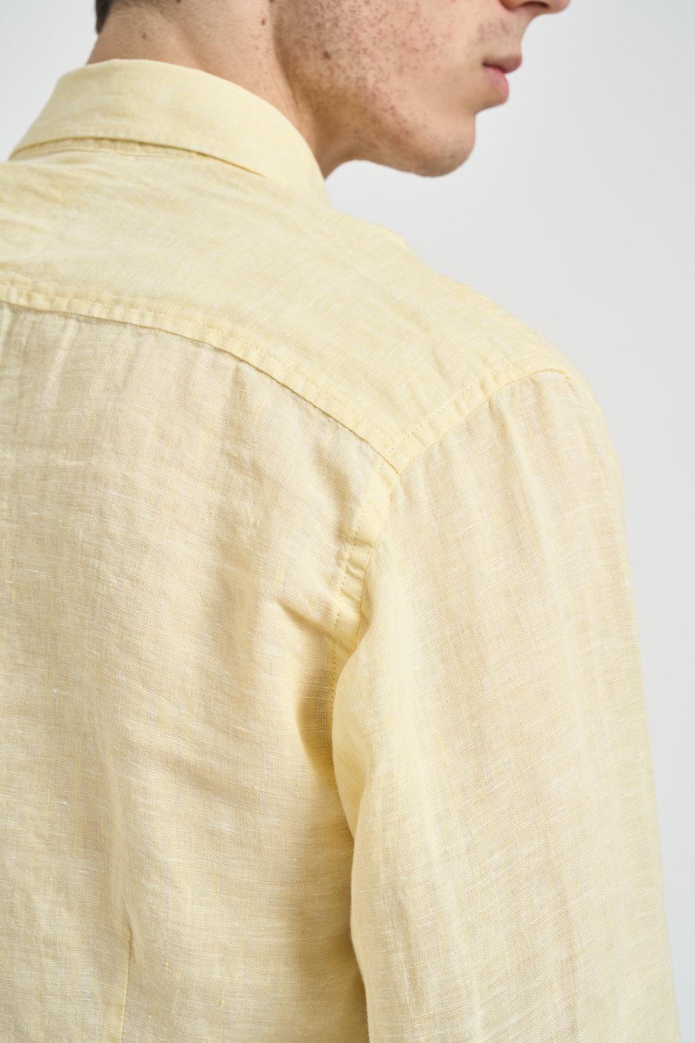 U.S. POLO Camicia uomo in lino gialla. Modello a maniche lunghe con colletto classico e chiusura frontale con bottoni. Tessuto leggero e traspirante dallaspetto naturale, ideale per la stagione estiva. Vestibilità regolare con fondo leggermente arrotondato e polsini con bottone. Logo brand ricamato a contrasto sul petto in rosso. Composizione: 100% lino. Il modello è alto 190 cm e indossa la taglia L.