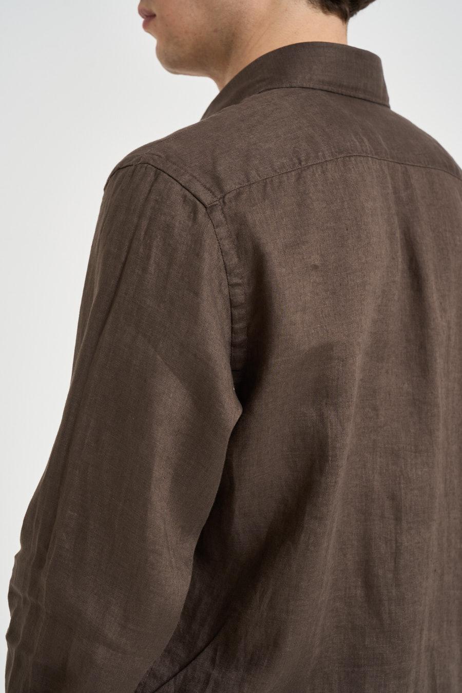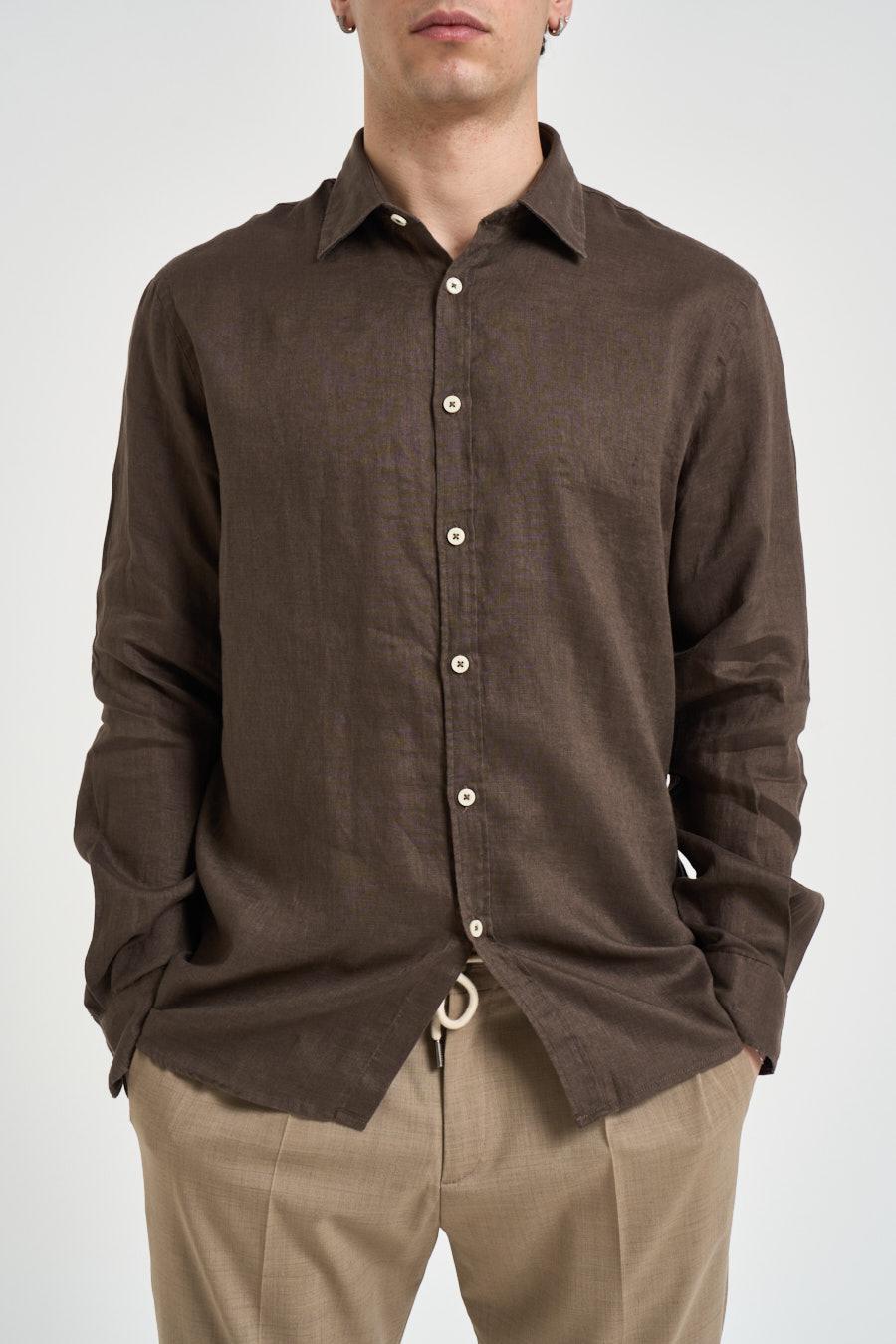 OUTFIT Camicia uomo in lino marrone. Modello dal design essenziale con collo classico e maniche lunghe, caratterizzato da una vestibilità regolare. Realizzata in tessuto leggero dalla texture naturale, presenta chiusura frontale con bottoni. Il capo è rifinito con polsi abbottonati e fondo dritto. Composizione: 100%lino. Il modello è alto 190 cm e indossa la taglia L.
