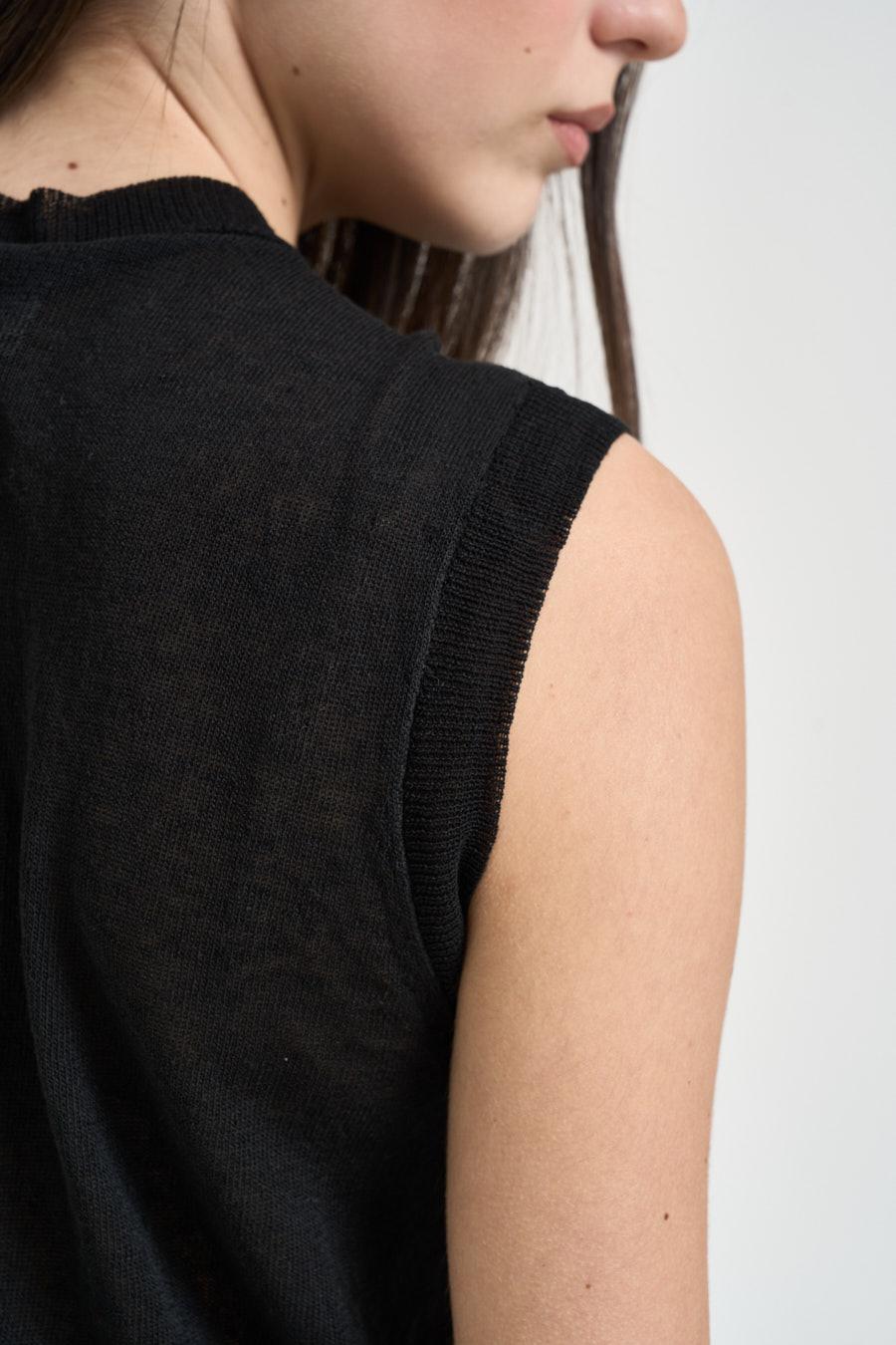 SUSY MIX Canotta donna in maglia nera. Modello regular fit. Girocollo. Senza manica. Dettagli a costine. Composizione: acrilico. La modella è alta 172 cm e indossa la taglia UNI.