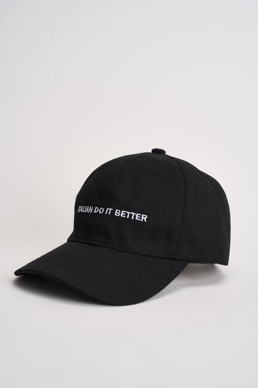 SUPERCULTURE Cappello uomo stampa nero. Modello baseball dal design contemporaneo, realizzato in tessuto resistente. Sul fronte è presente una scritta ricamata a contrasto bianco ITALIAN DO IT BETTER. Dotato di occhielli di ventilazione per una migliore traspirabilità. Composizione: cotone.