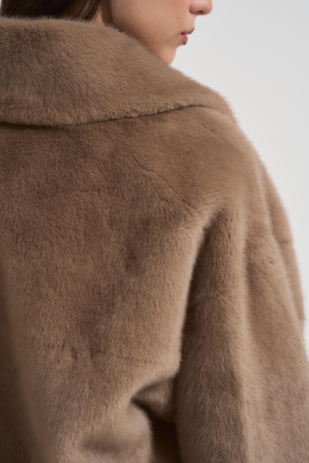 GRACE AND MILA Cappotto donna in pelliccia tortora. Modello corto con collo over, chiusura con cerniera. Composizione: 100% poliestere. La modella è alta 172 cm e indossa la taglia S.
