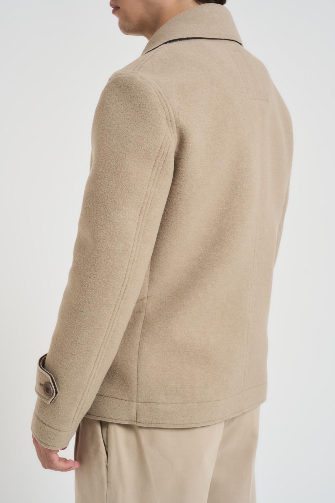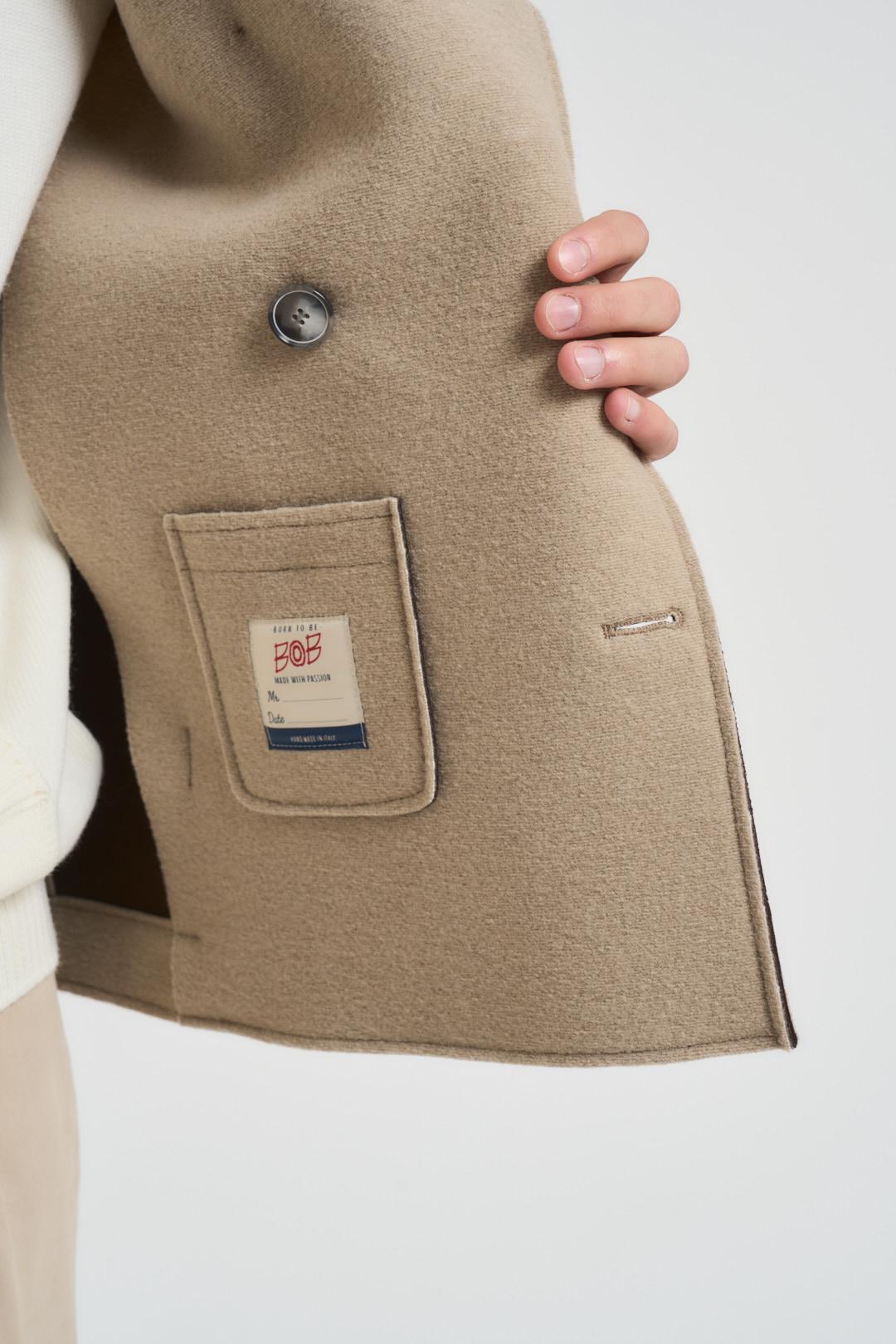 BOB Cappotto uomo corto beige. Modello doppiopetto. Rever classico. Dettaglio spilla Bob removibile. Manica lunga con fibbia e bottone su polsino. Chiusura frontale con bottoni. Tasche a filo laterali. Tasca interna. Composizione: 53% poliestere, 32% acrilico, 13% lana, 2% elastane. Il modello è alto 190 cm e indossa la taglia 50.