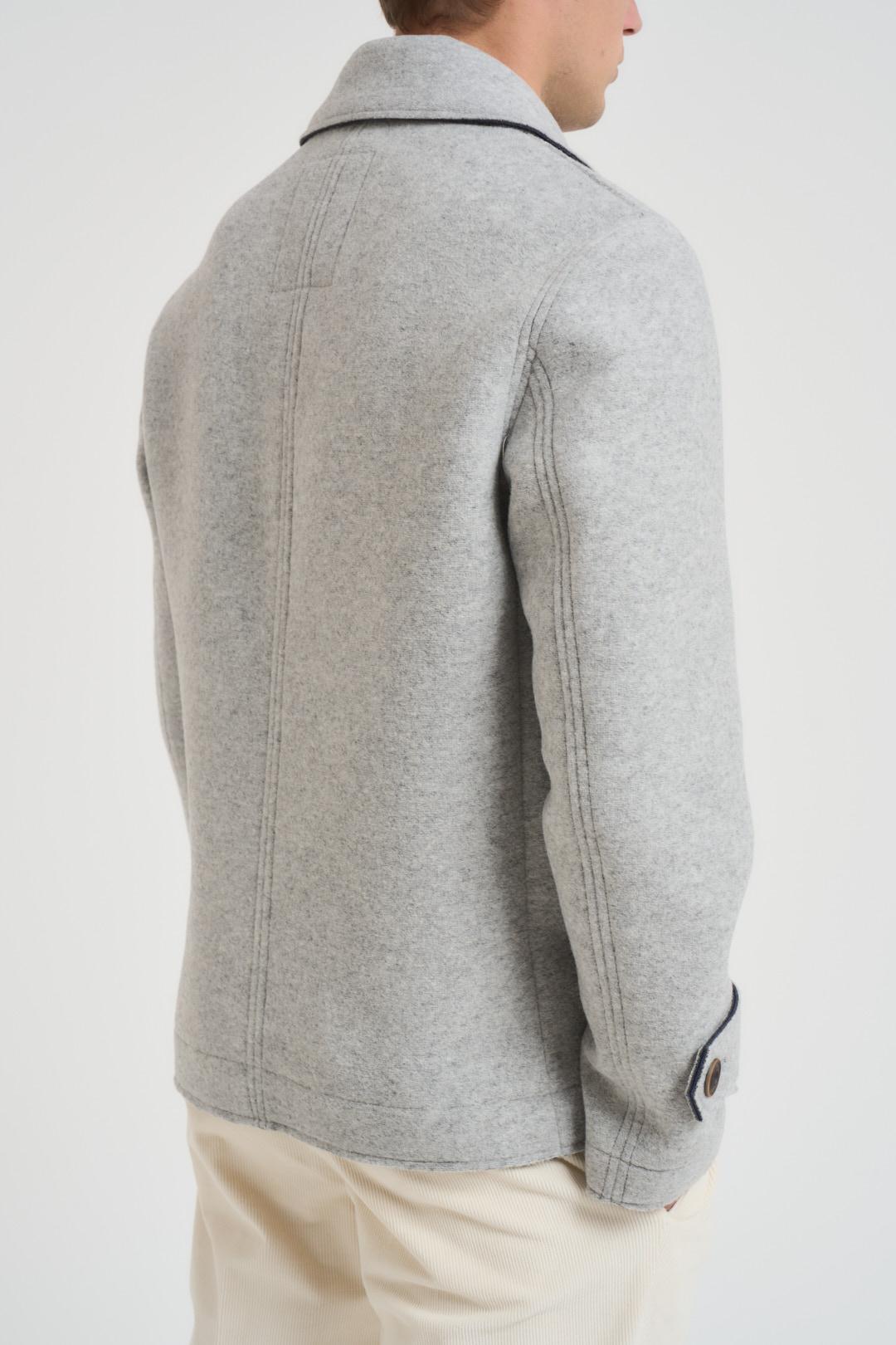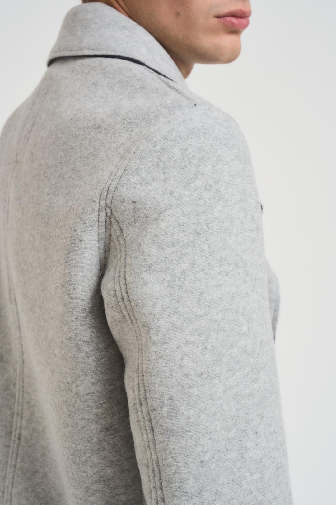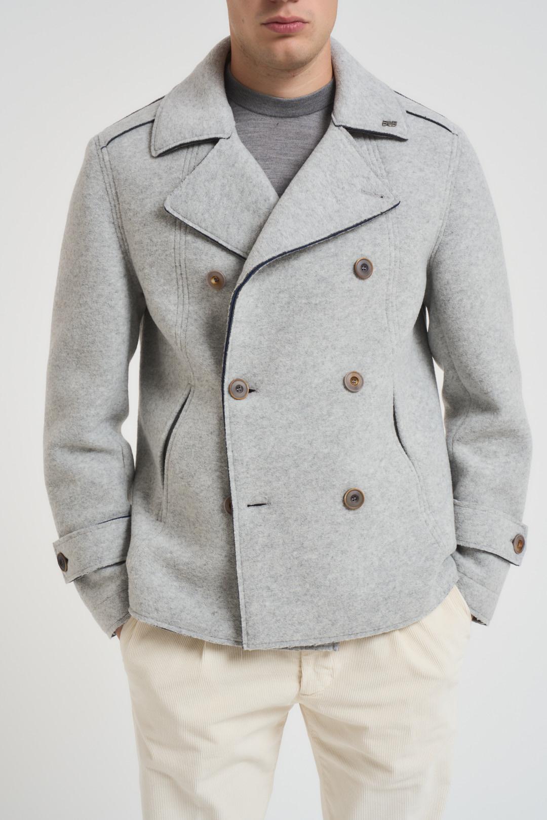 BOB Cappotto uomo corto grigio chiaro. Modello doppiopetto. Rever classico. Dettaglio spilla Bob removibile. Manica lunga con fibbia e bottone su polsino. Chiusura frontale con bottoni. Tasche a filo laterali. Tasca interna. Composizione: 53% poliestere, 32% acrilico, 13% lana, 2% elastane. Il modello è alto 190 cm e indossa la taglia 50.