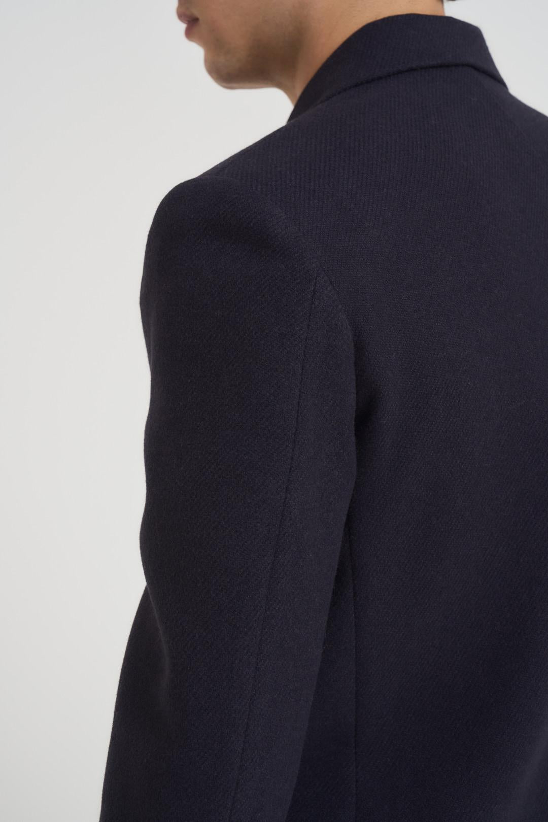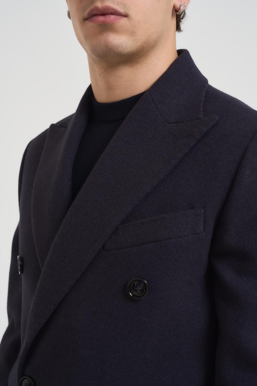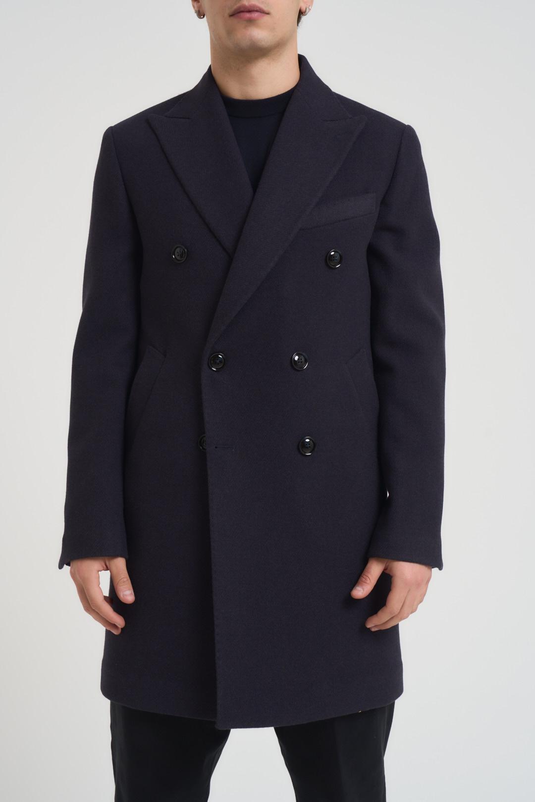 VITTORIO FERRIERI Cappotto uomo doppiopetto blu notte. Modello con classico collo a rever, lunghezza midi, tasche a filetto laterali e sul petto. Composizione: 60% poliestere 20% viscosa 20% acrilica. Il modello è alto 190cm e indossa la taglia 50.