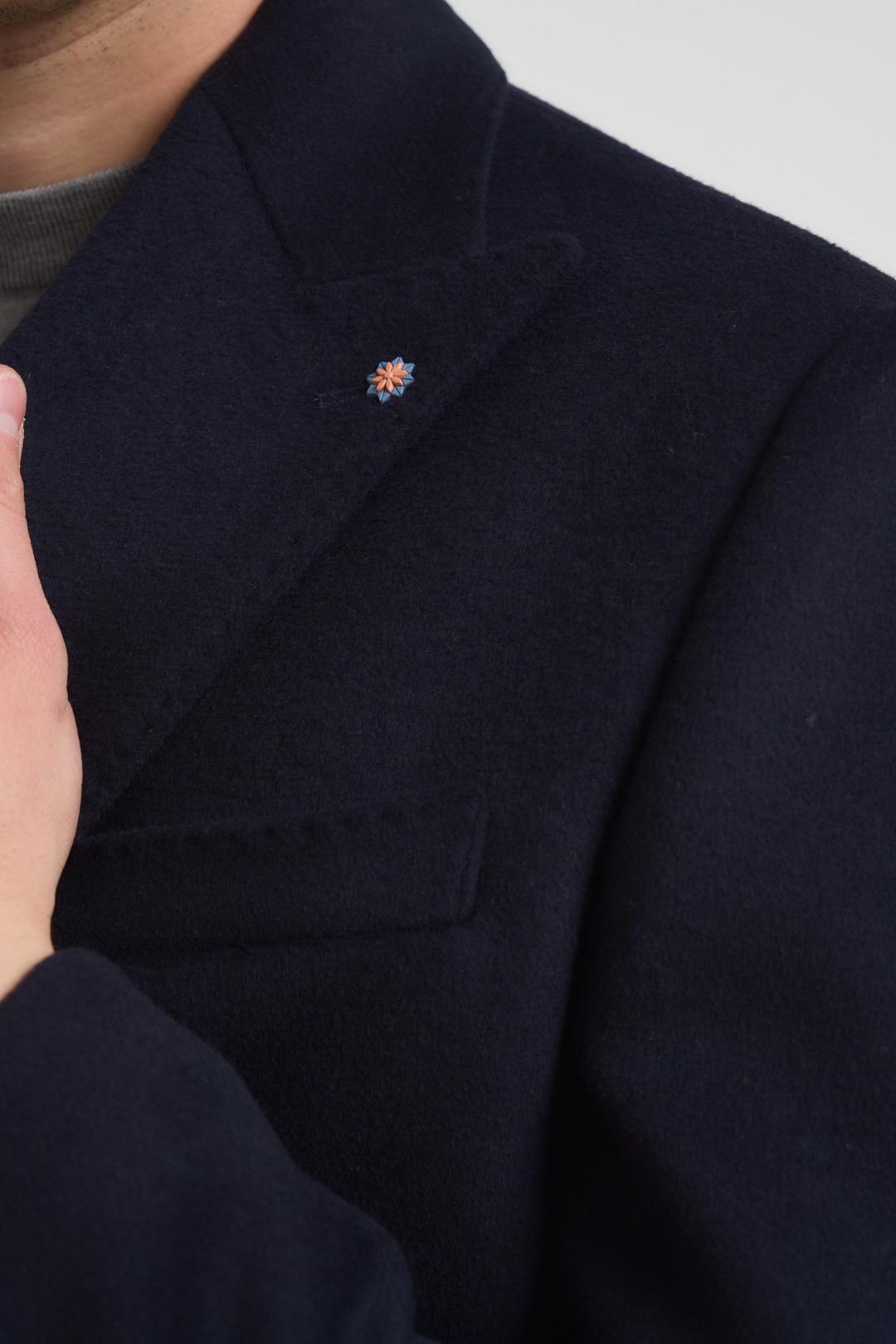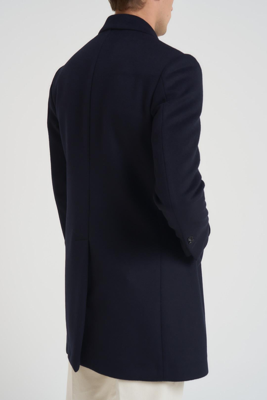 BHARNABA Cappotto uomo doppiopetto blu notte. Modello dritto. Chiusura frontale con bottoni. Manica lunga. Bottoni su fondo manica. Rever a lancia. Tasche laterali. Taschino sul petto. Tasca interna. Spacco sul retro. Composizione: 52% lana, 38% poliestere, 5% acrilica, 5% altre fibre. Il modello è alto 190 cm e indossa la taglia 50.