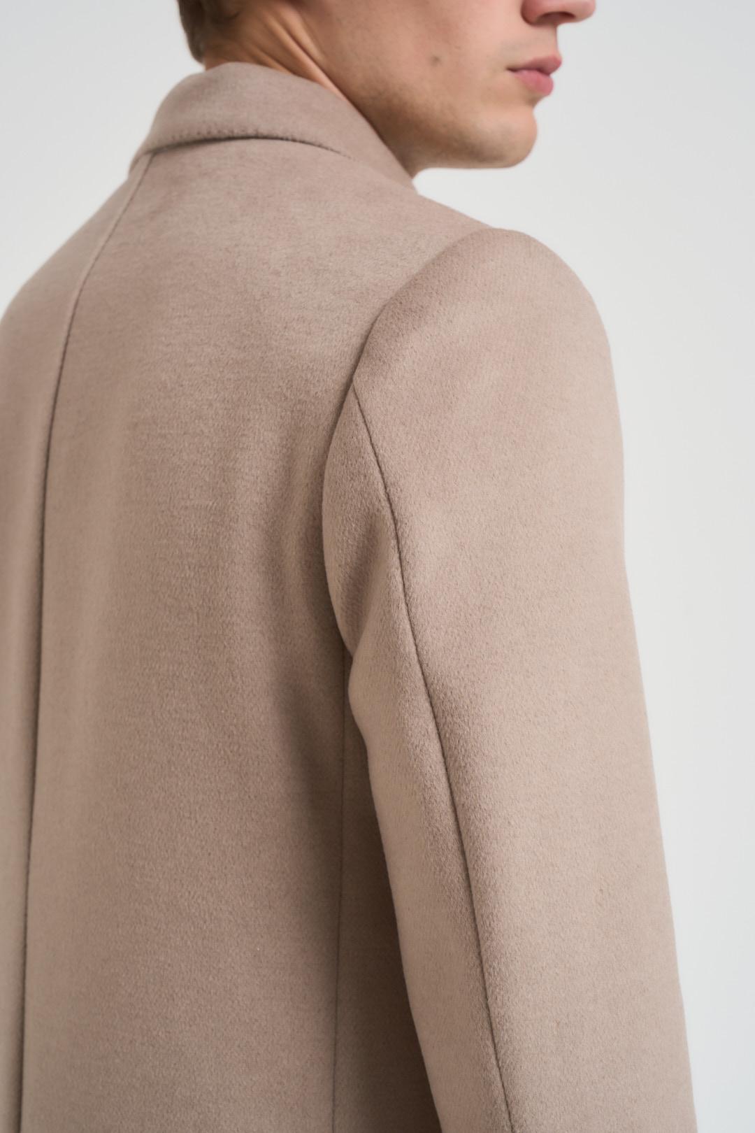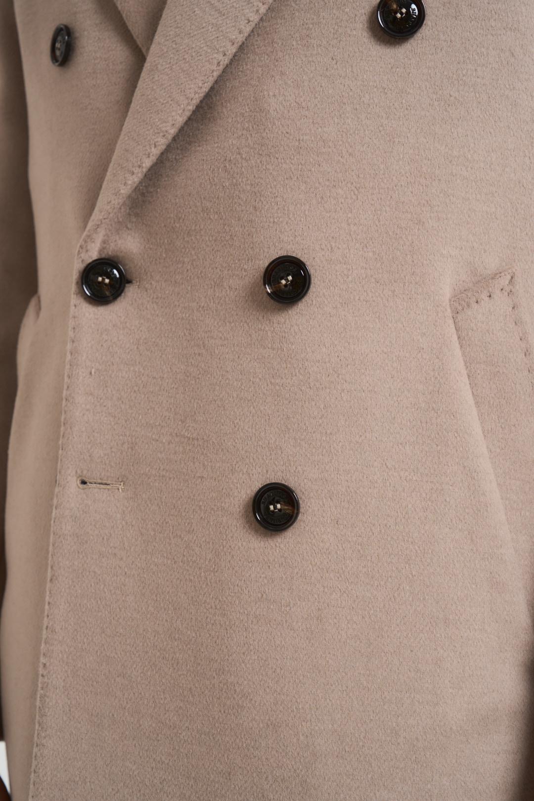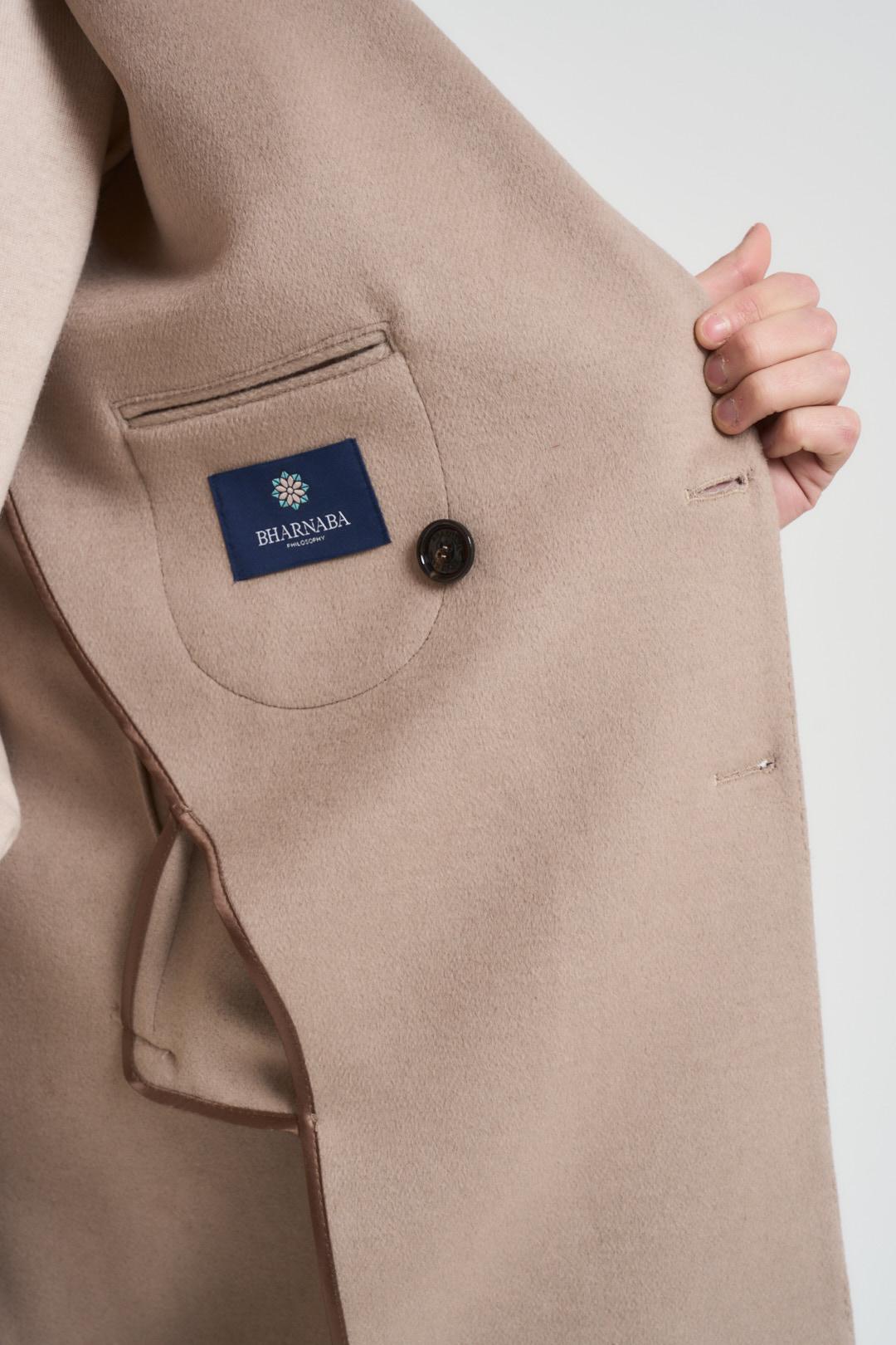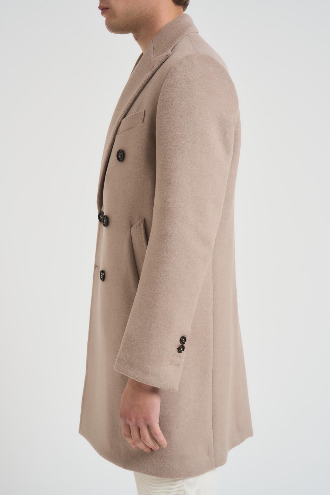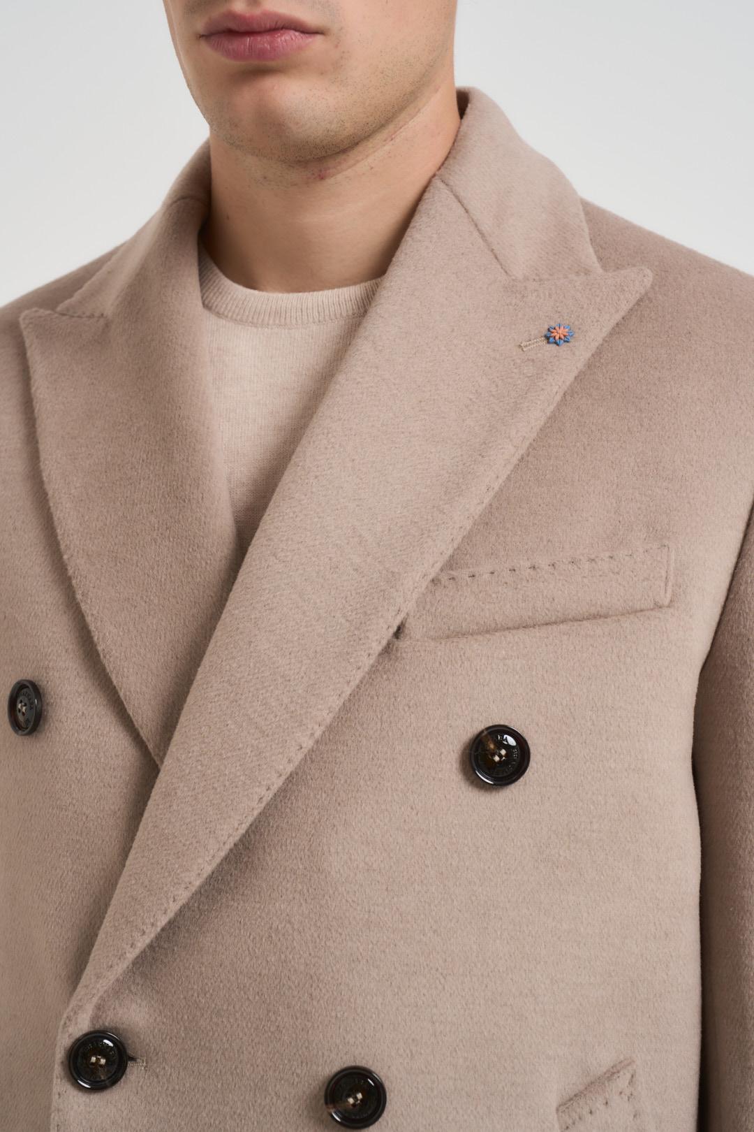 BHARNABA Cappotto uomo doppiopetto sabbia. Modello dritto. Chiusura frontale con bottoni. Manica lunga. Bottoni su fondo manica. Rever a lancia. Tasche laterali. Taschino sul petto. Tasca interna. Spacco sul retro. Composizione: 52% lana, 38% poliestere, 5% acrilica, 5% altre fibre. Il modello è alto 190 cm e indossa la taglia 50.