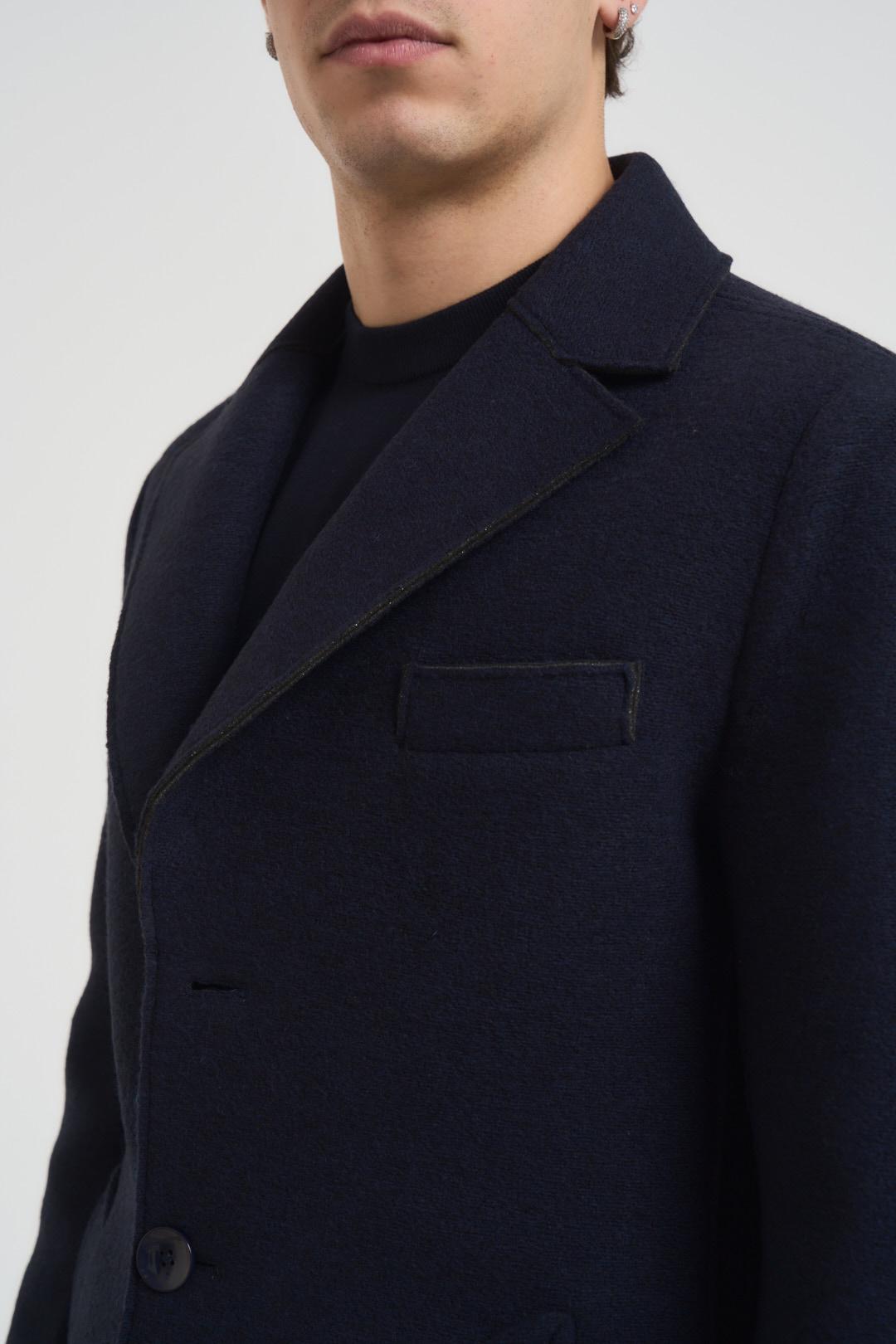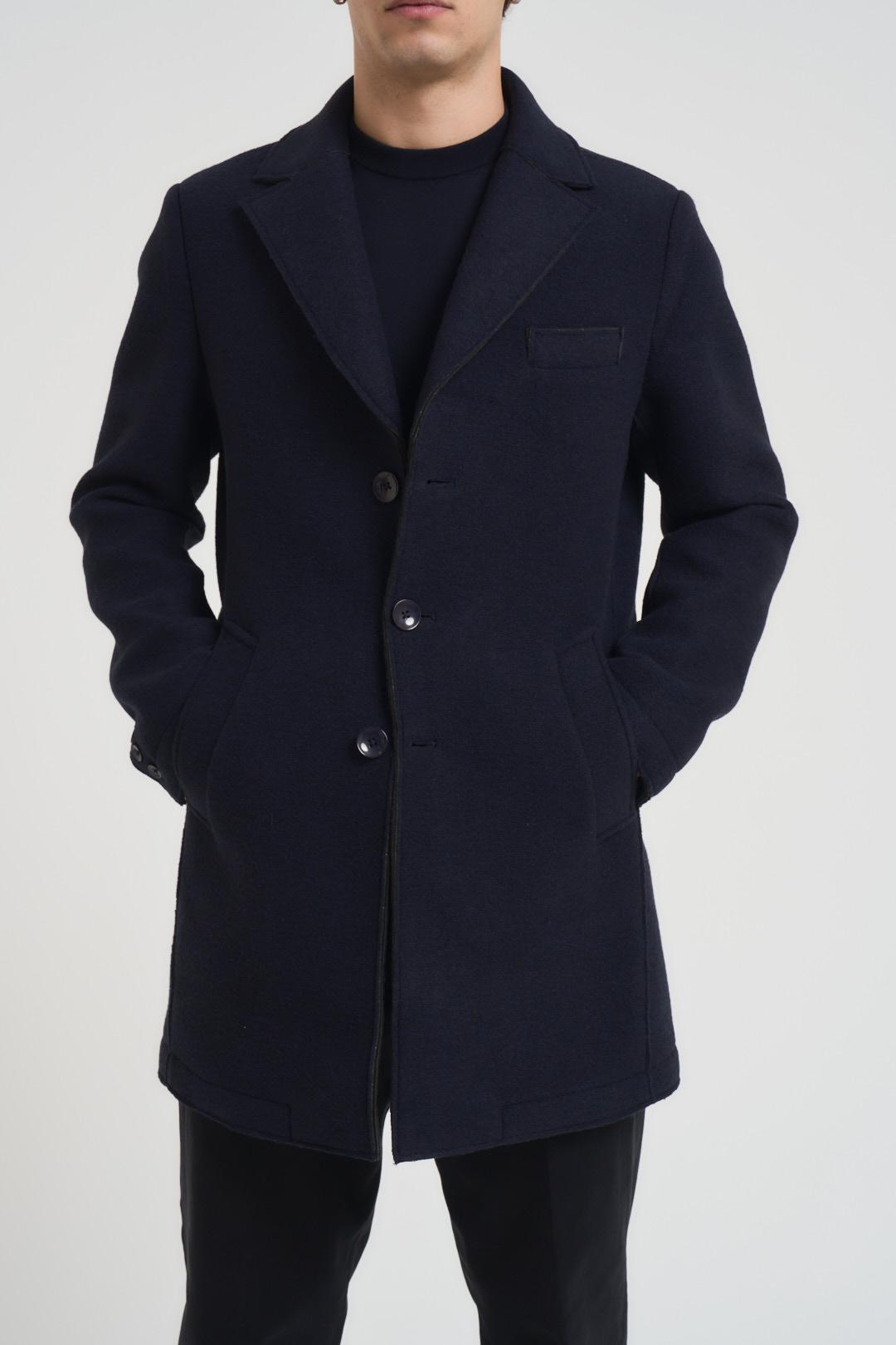 VITTORIO FERRIERI Cappotto uomo monopetto blu notte. Modello lunghezza midi, bottoncini sui polsini, collo con rever. Composizione: 40% poliestere 38% acrilico 22% lana. Il modello è alto 190cm e indossa la taglia L.