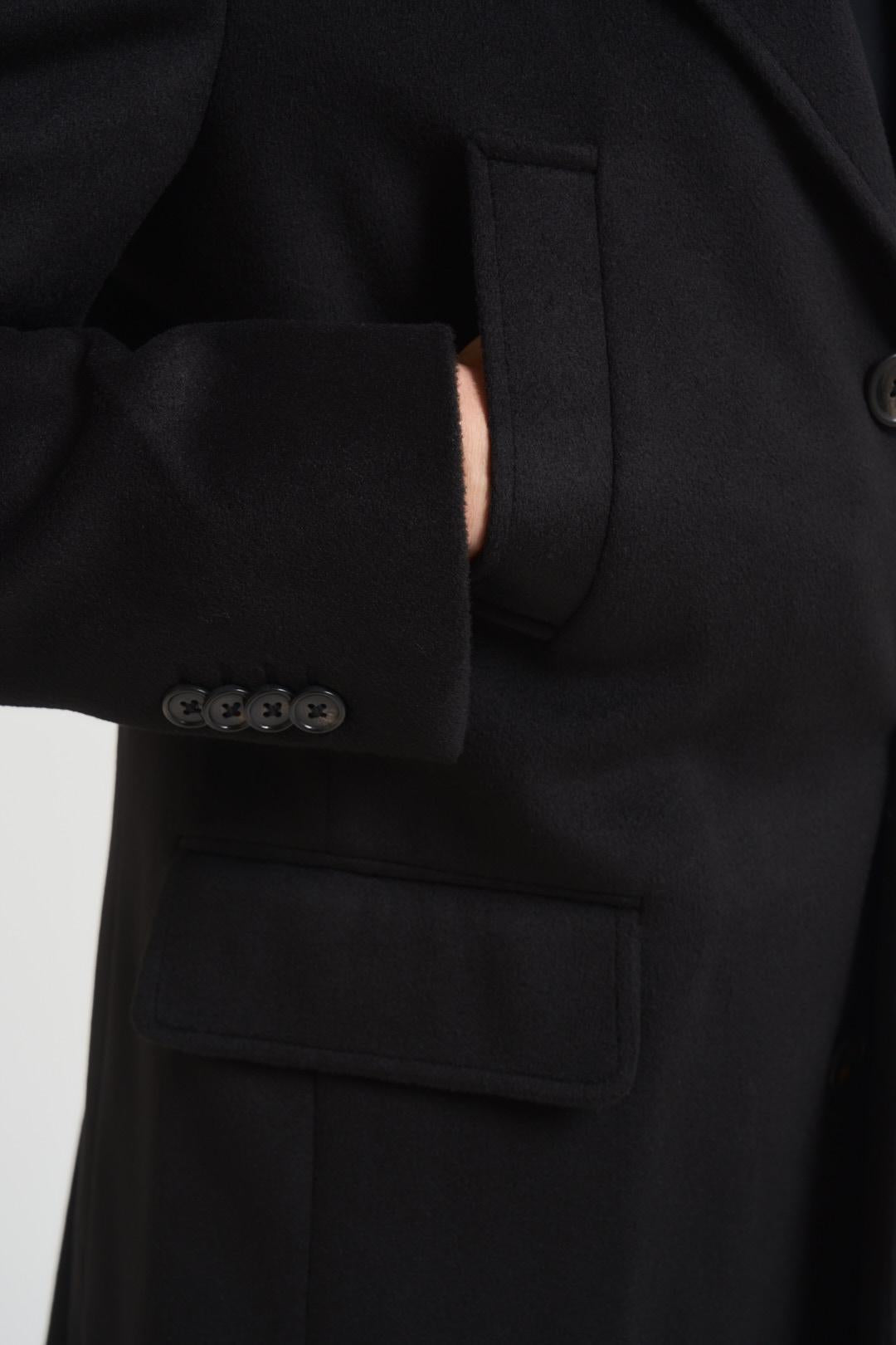 MARKUP Cappotto uomo monopetto nero. Modello dalla linea dritta. Chiusura frontale con bottoni. Rever classico. Due tasche con patta, due tasche a filetto. Tasca interna. Manica lunga. Bottoni su fondo manica. Patch logo su fondo manica. Composizione: 100% poliestere. Il modello è alto 190 cm e indossa la taglia 50.