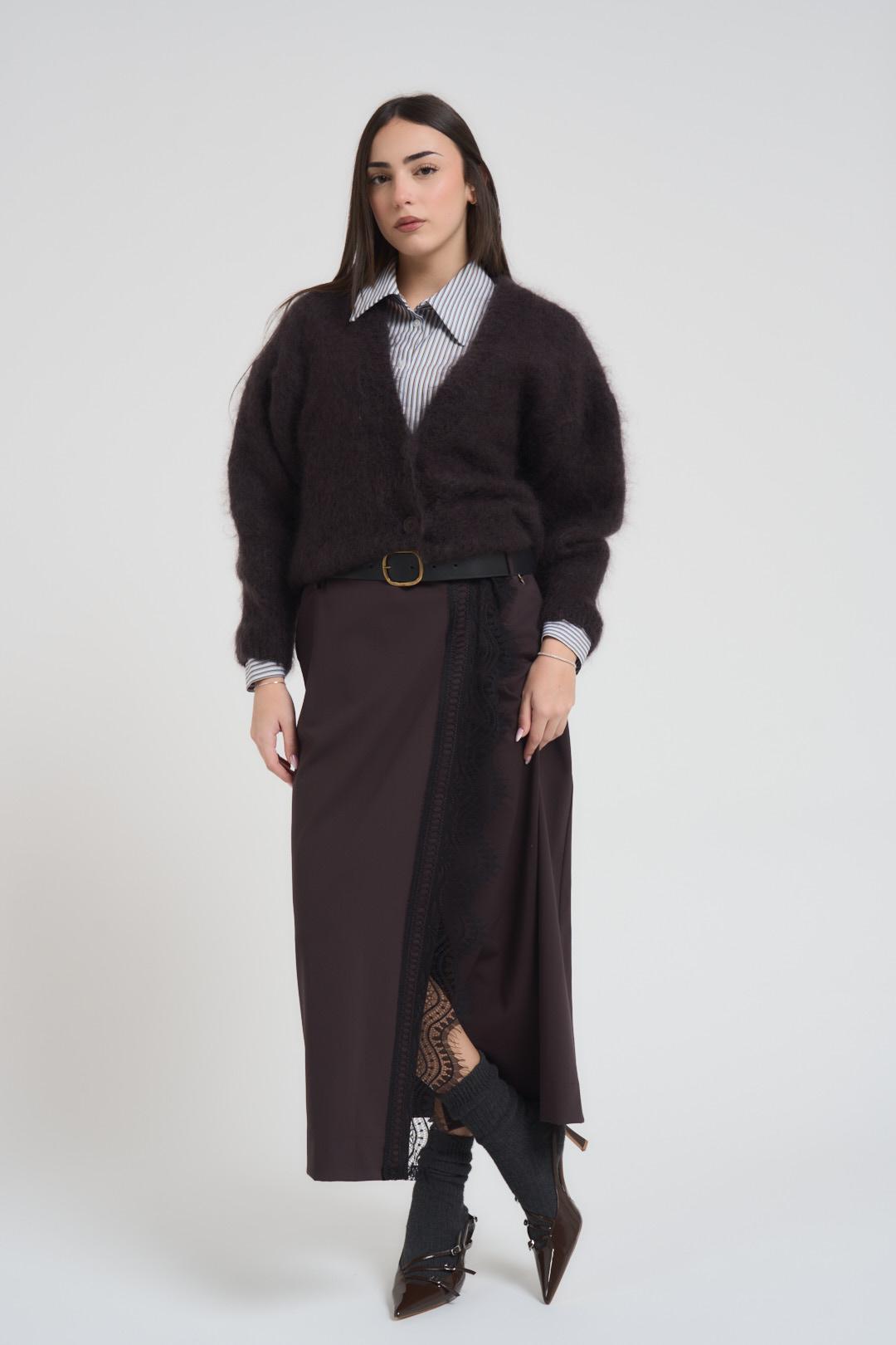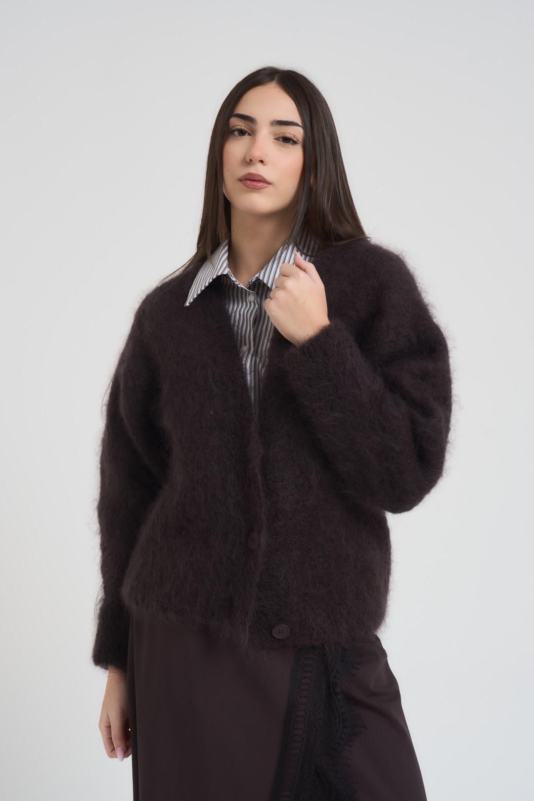 SOUVENIR CLUBBING Cardigan donna corto cioccolato. Modello regular fit. Chiusura frontale con bottoni. Scollo a V. Manica lunga. Composizione: 80% Mohair, 18% Poliammide, 2% Elastane. La modella è alta 172 cm e indossa la taglia UNI.