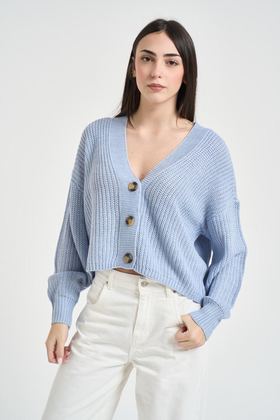 ONLY Cardigan donna in maglia azzurro. Modello con chiusura sul davanti a bottoni, scollo a V. Bordi a costine. Composizione: 100% Acrilico. La modella è alta 172 cm e indossa la taglia S.