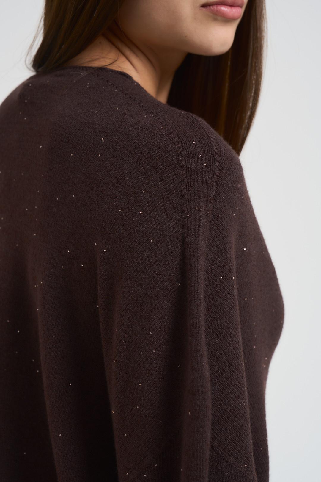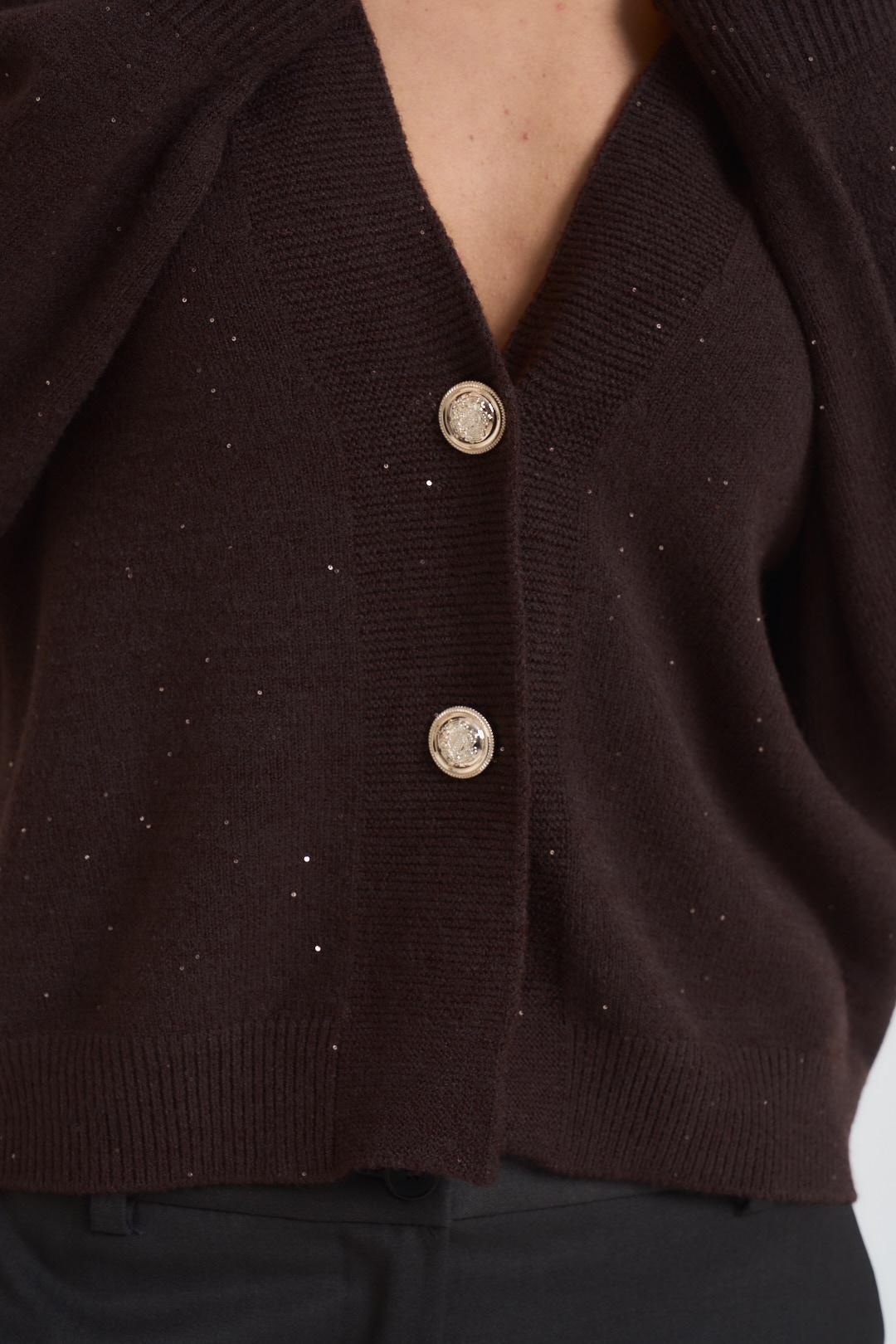 SUSY MIX Cardigan donna scollo a V con strass marrone. Modello con bottoni dorati, dettagli a costine sui polsini e sullo scollo. Composizione: 50% viscosa 27% poliestere 23% poliammide. La modella è alta 176 cm e indossa la taglia unica.