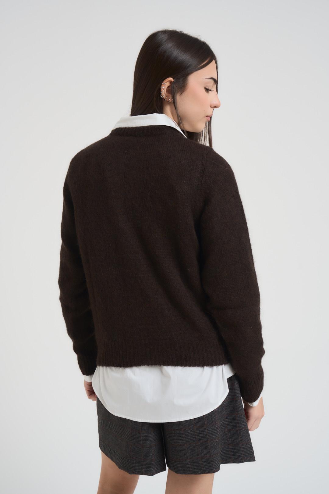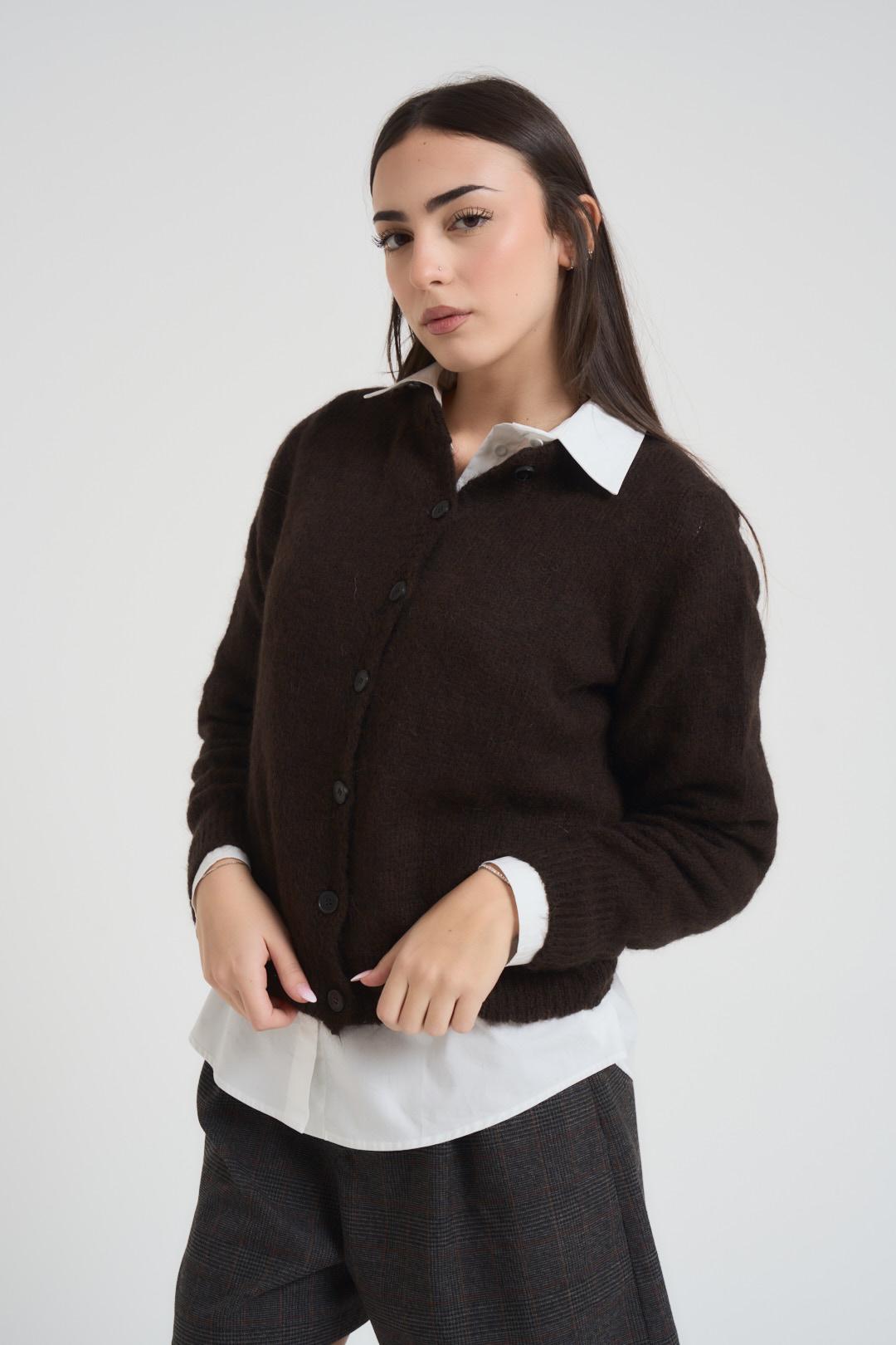VICOLO Cardigan donna testa di moro. Modello girocollo, con chiusura a bottoncini marroni, dettagli a costine. Regular fit. Composizione: 34% alpaca 34% lana 32% polammide. La modella è alta 172 cm e indossa la taglia unica.
