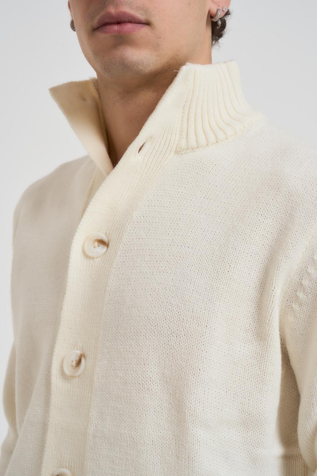 MARKUP Cardigan uomo con bottoni latte. Modello con chiusura frontale con bottoni, collo alto a coste e bordi elasticizzati su polsini e fondo. Vestibilità morbida. Due tasche laterali. Composizione: 70% acrilico, 30% lana. Il modello è alto 190 cm e indossa la taglia L.
