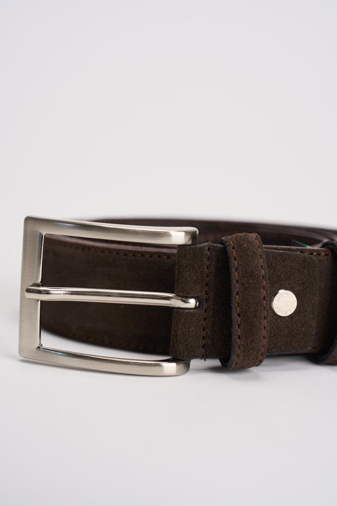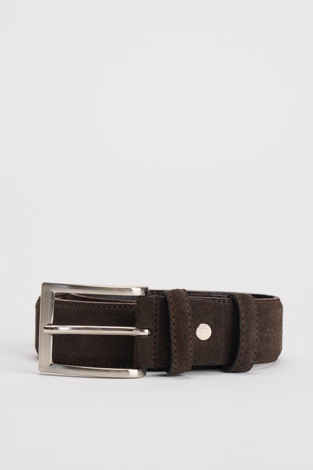 AGOEFILO Cintura uomo in suede marrone. Modello con hardware argento.