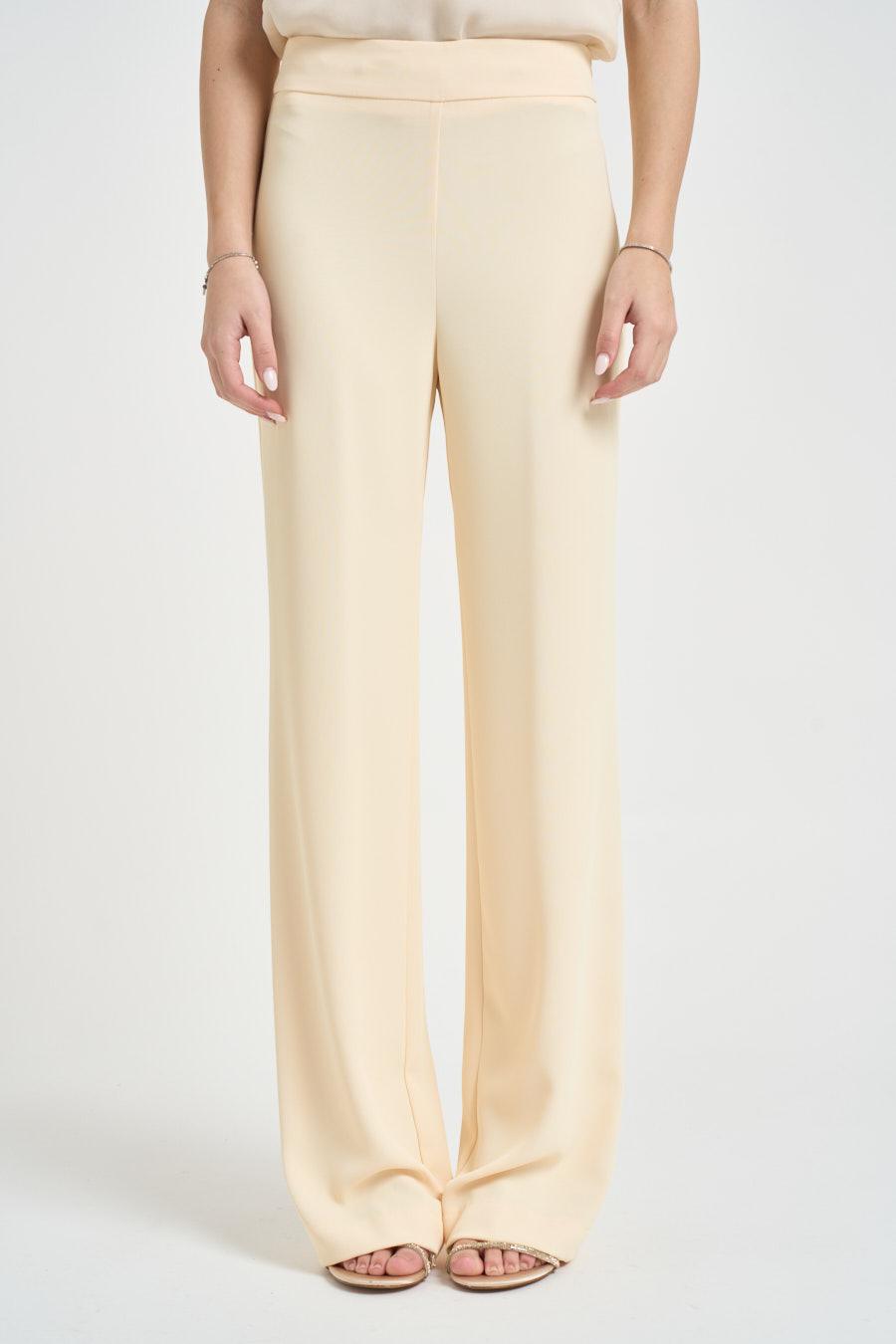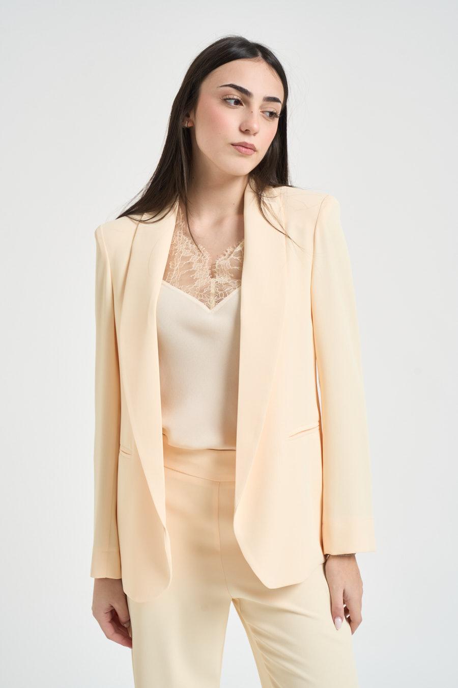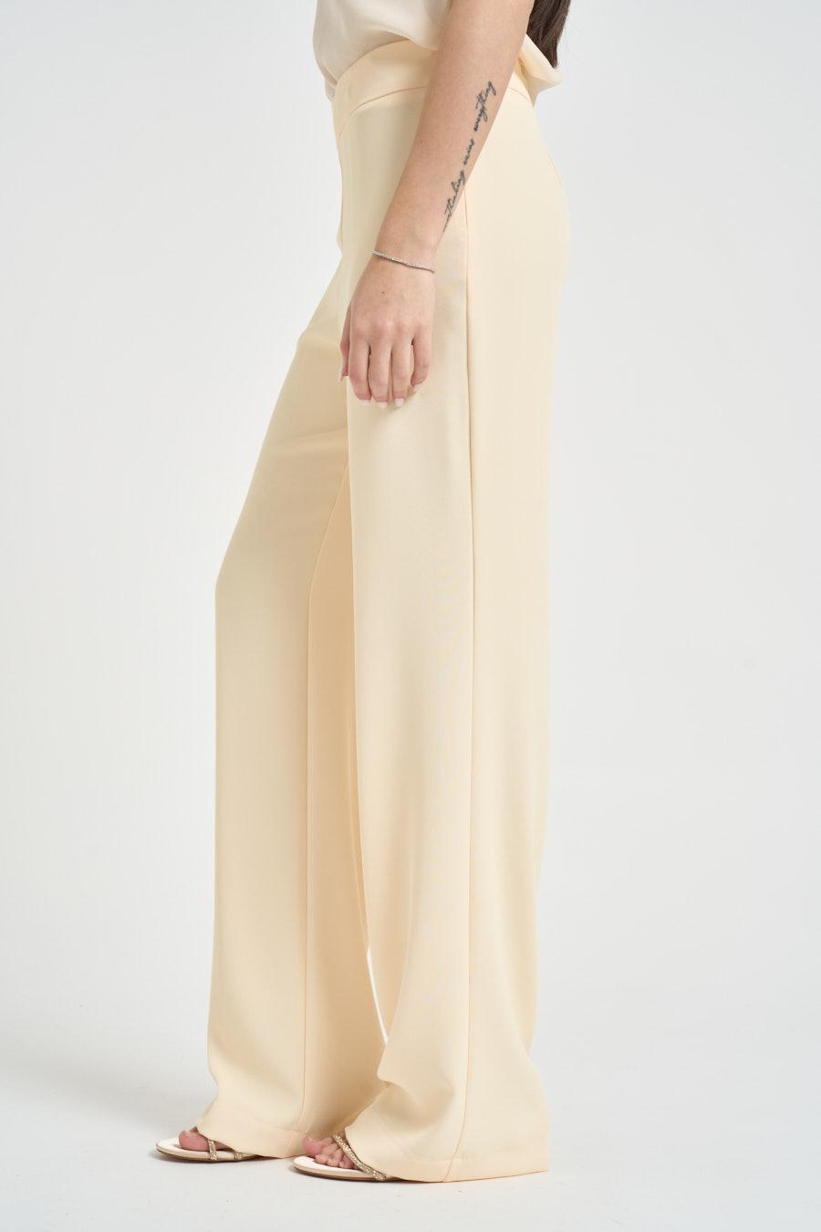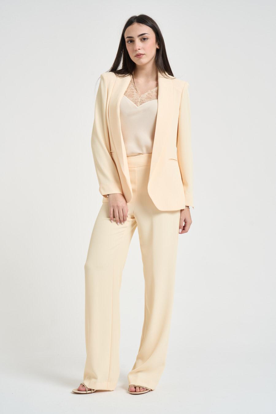KAOS Completo donna monopetto giallo pastello. Modello composto da giacca con rever lungo, tasche a filetto e maniche rifinite da polsini stondati con spacchi laterali. Pantaloni a gamba dritta, chiusi da zip invisibile sul lato. Composizione: 96% Polyestere 4% Elastane. La modella è alta 172cm e indossa la taglia 40.
