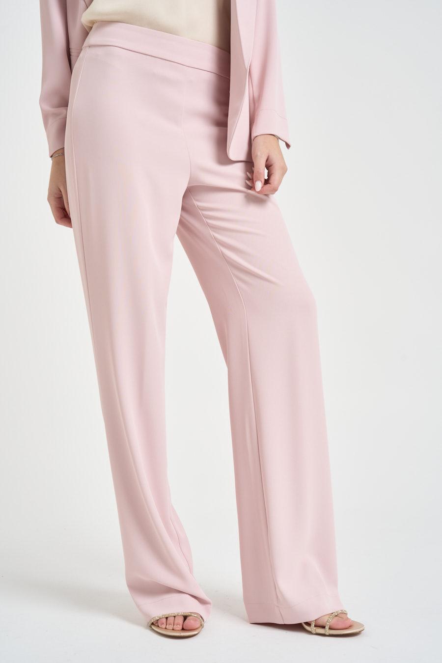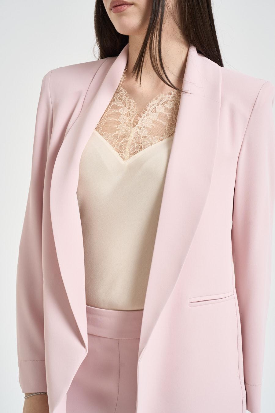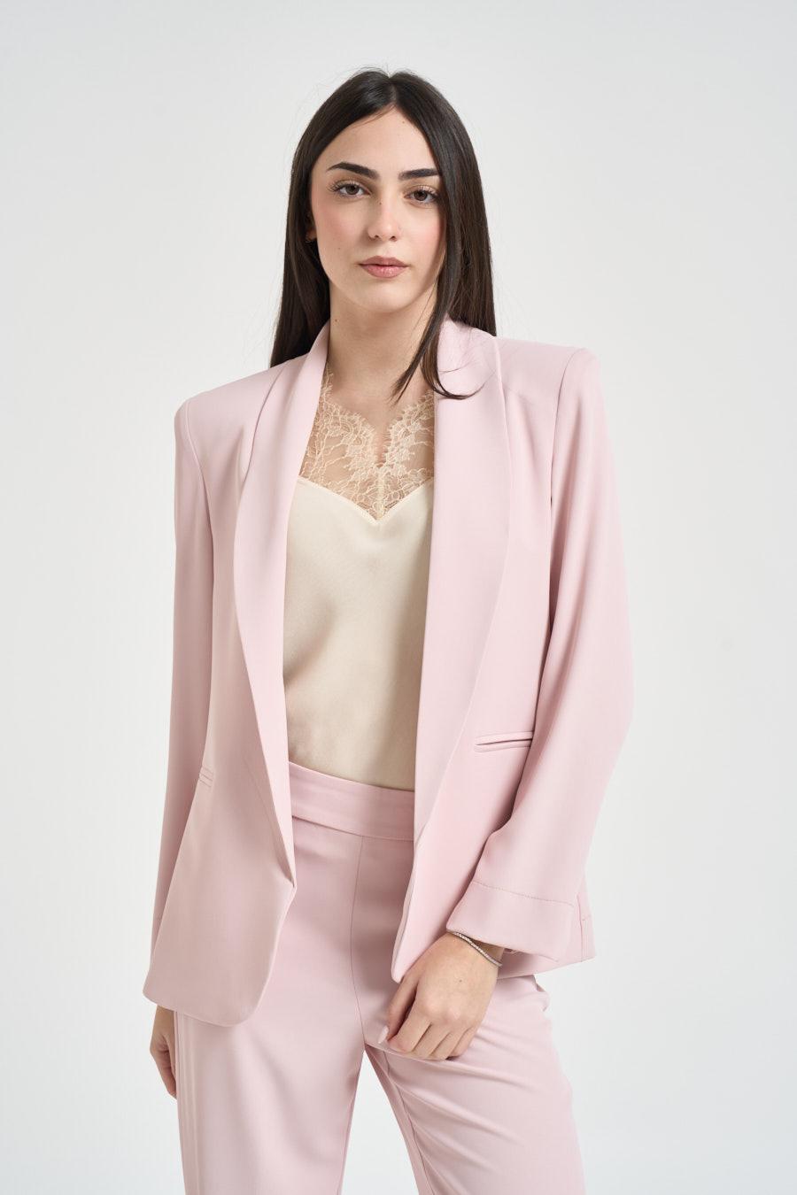 KAOS Completo donna monopetto rosa pastello. Modello composto da giacca con rever lungo, tasche a filetto e maniche rifinite da polsini stondati con spacchi laterali. Pantaloni a gamba dritta, chiusi da zip invisibile sul lato. Composizione:96% Polyestere; 4% Elastane. La modella è alta 172cm e indossa la taglia 40.