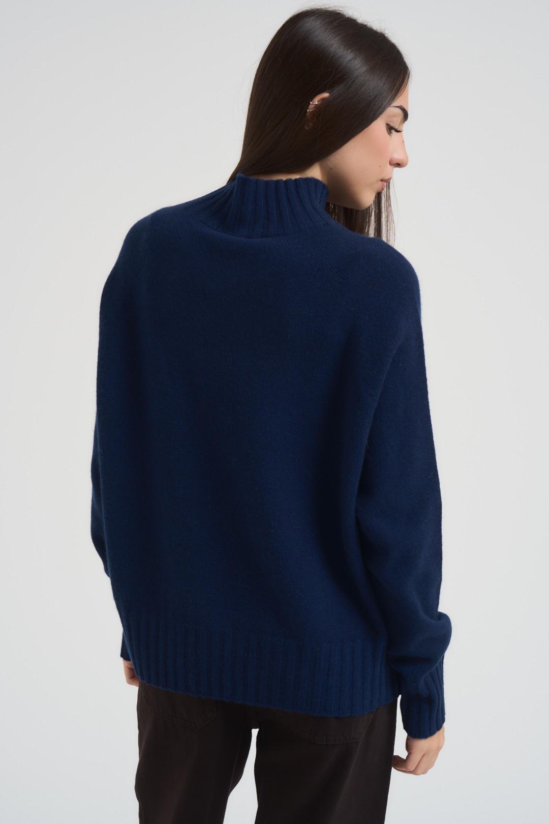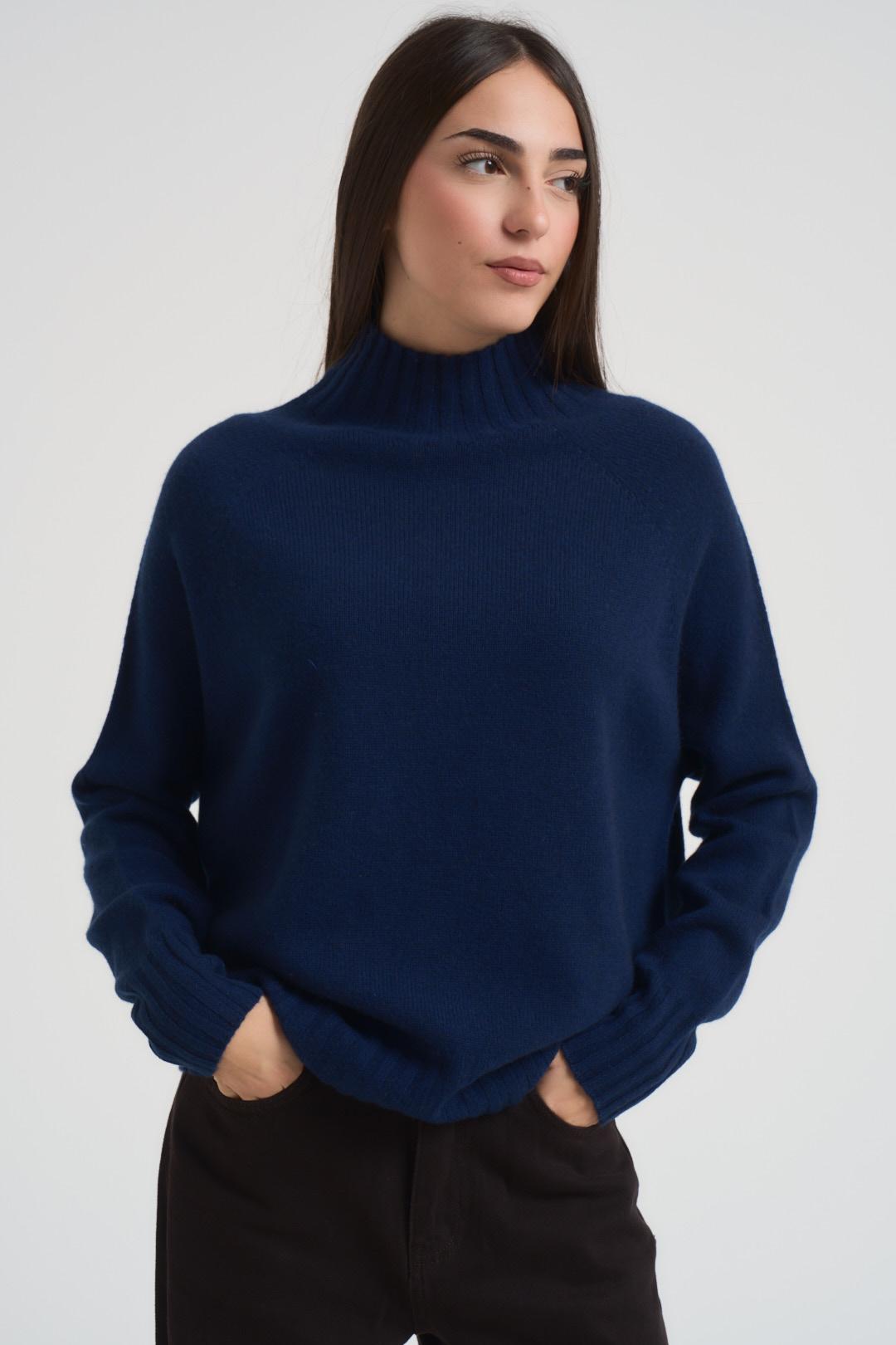 SOLOCASCMIR Dolcevita donna blu. Modello con dettagli a coste, regular fit, spalla scesa. Composizione: 100% Cashmere. La modella è alta 172 cm e indossa la taglia S.