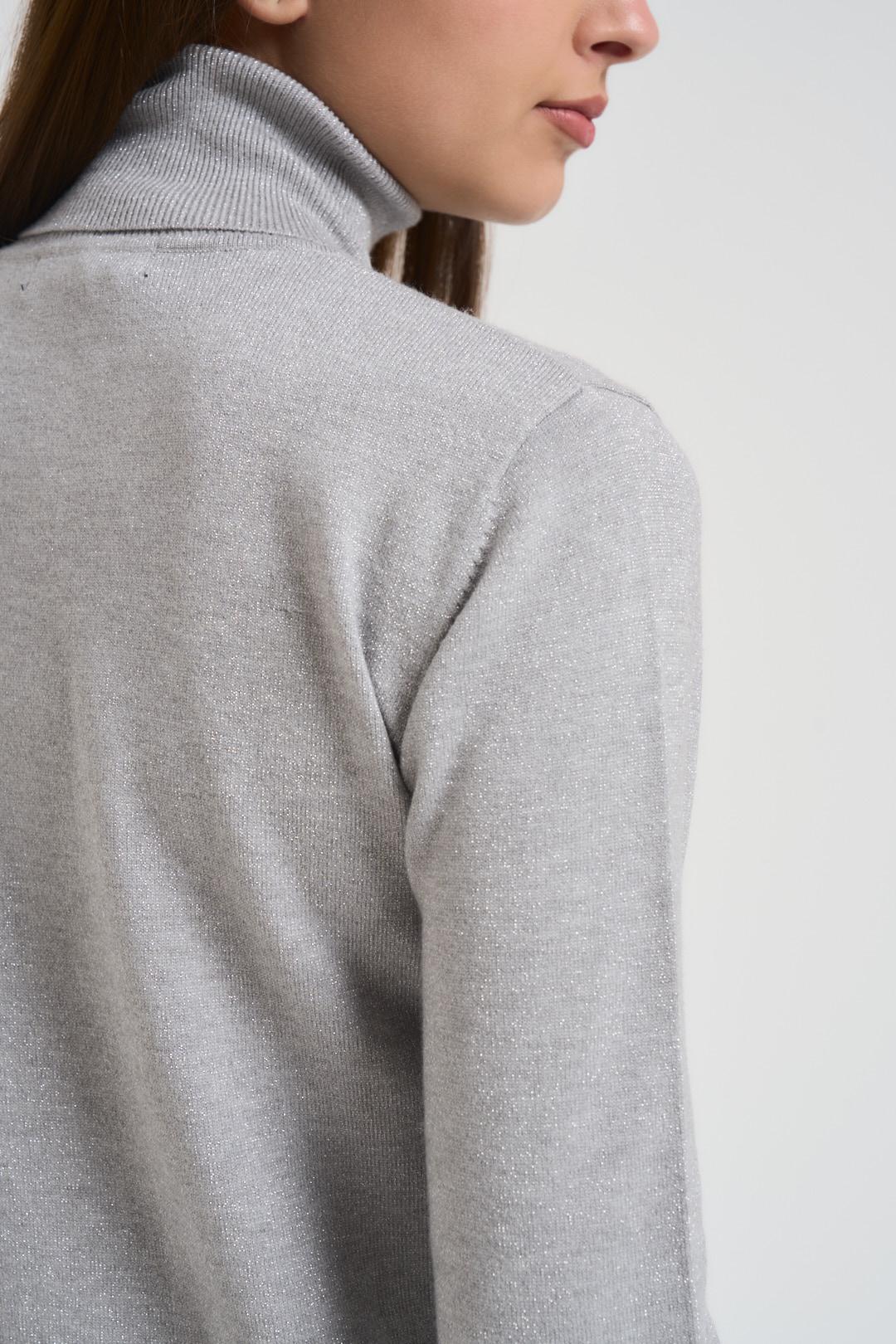 INCLOTH Dolcevita donna grigio. Modello in tessuto lurex, slim fit, manica lunga con dettagli a costine. Composizione: 100% viscosa. La modella è alta 172 cm e indossa la taglia S/M.