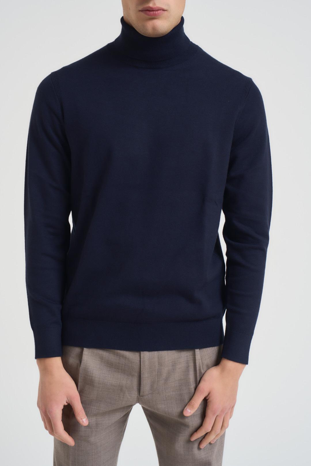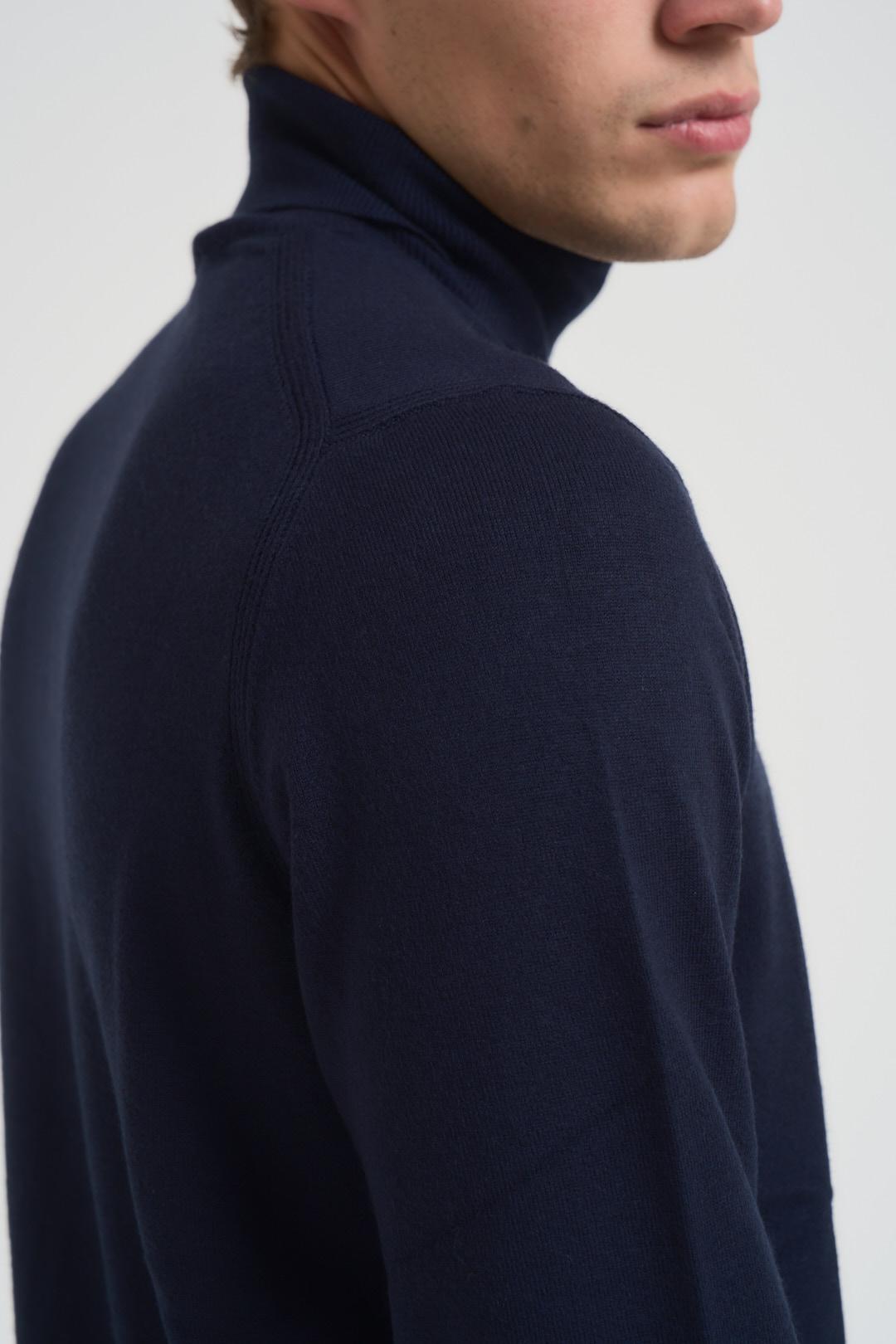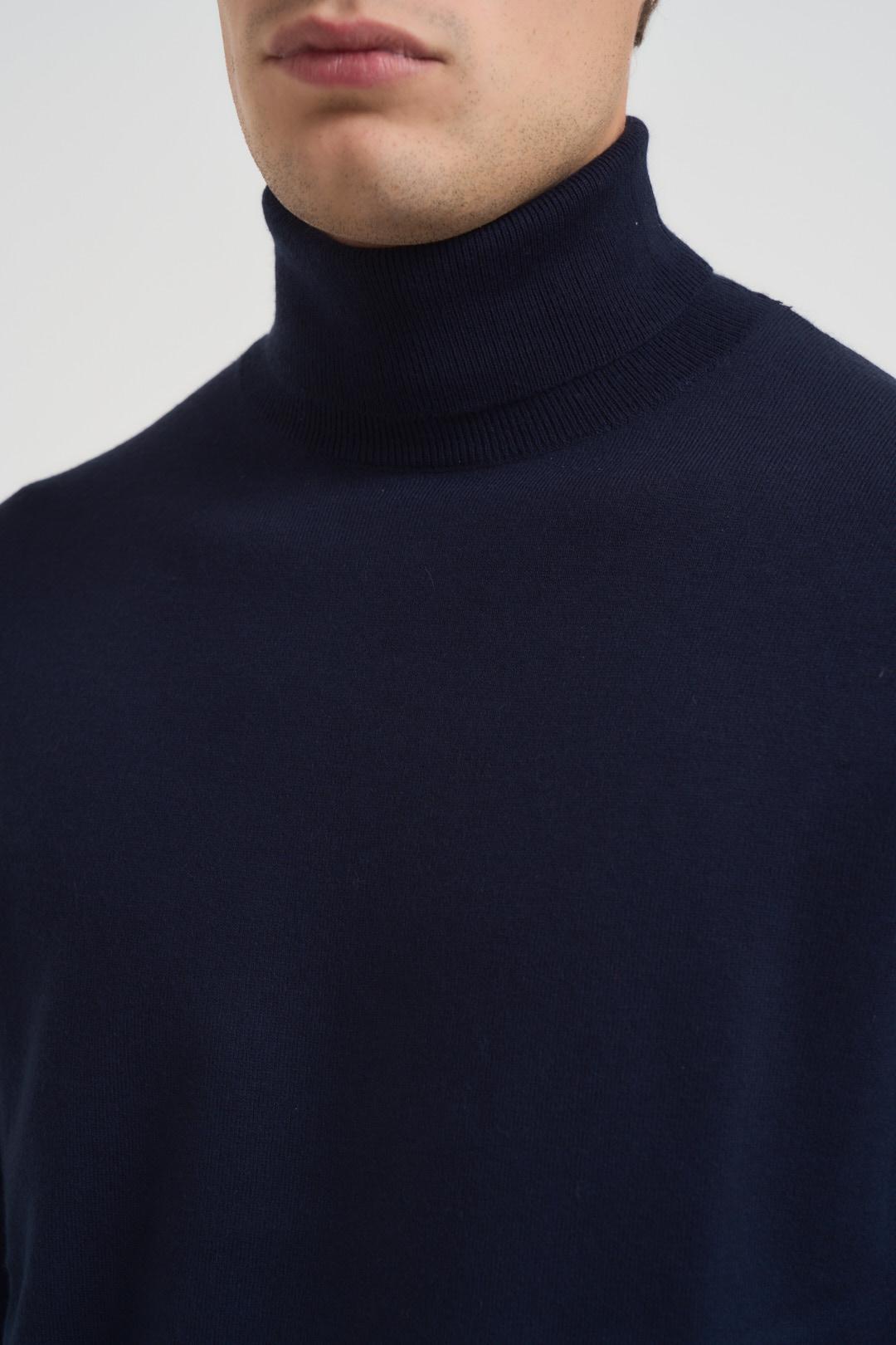DIKTAT Dolcevita uomo blu notte. Modello slim fit a collo alto, dettagli a costine. Composizione: 40% viscosa, 30% poliammide, 25% acrilico, 5% cashmere. Il modello è alto 190cm e indossa la taglia L.