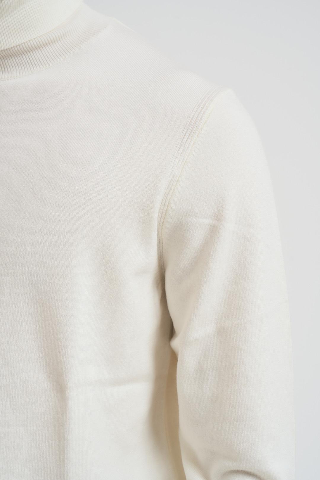 DIKTAT Dolcevita uomo panna. Modello slim fit a collo alto, dettagli a costine. Composizione: misto cashmere e viscosa. Il modello è alto 190cm e indossa la taglia L.