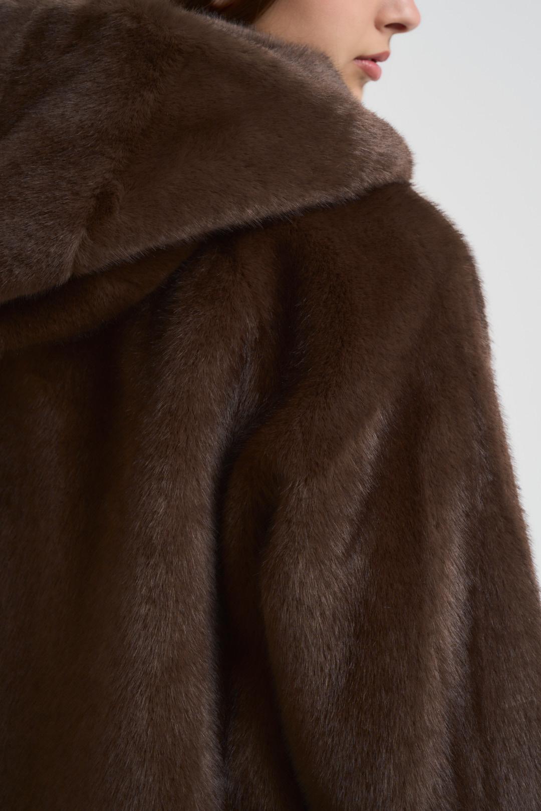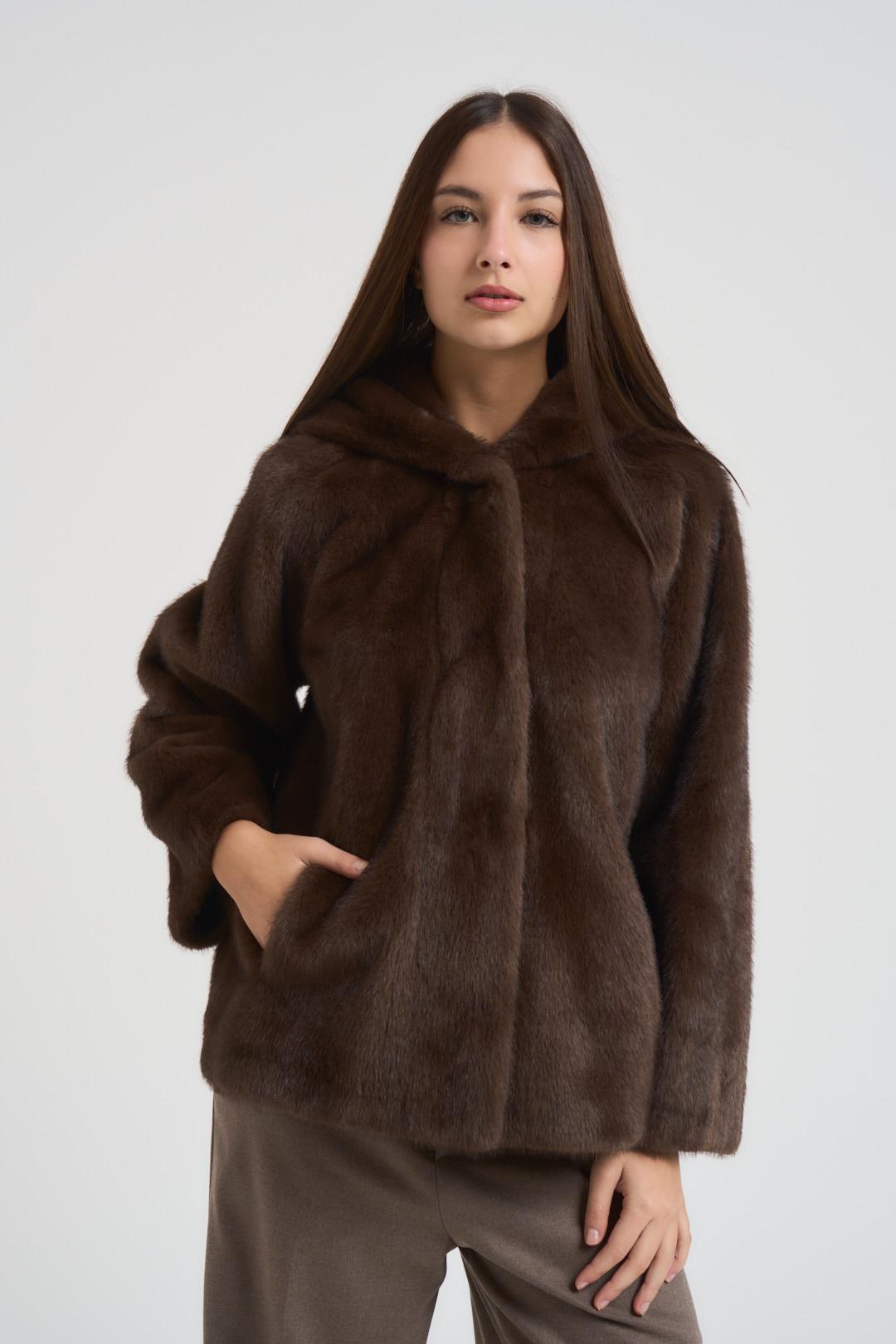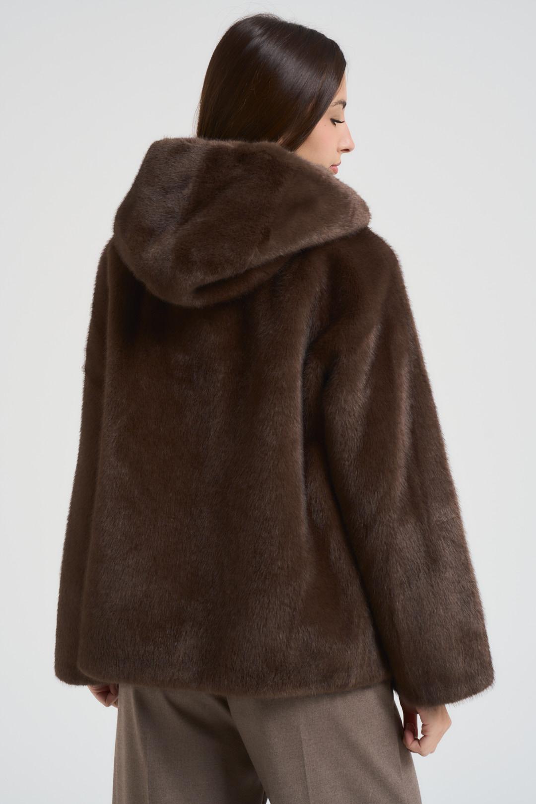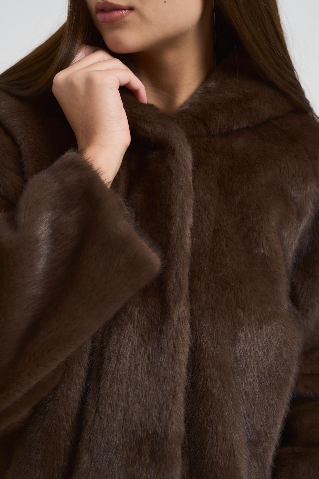 ADIMARI Ecopelliccia donna con cappuccio moro. Modello corto. Tessuto effetto pelliccia morbido. Chiusura frontale con bottoni. Due tasche frontali. Composizione: Poliestere. La modella è alta 176 cm e indossa la taglia S.