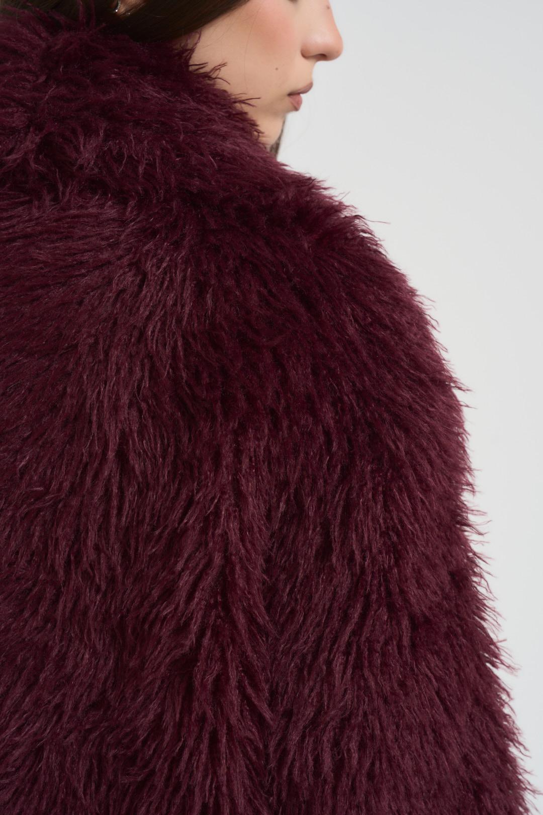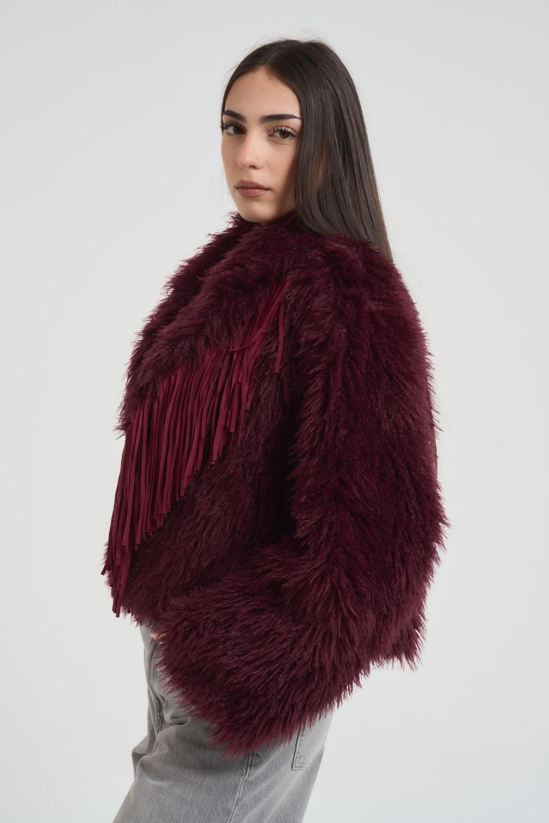 LE VOLIERE Ecopelliccia donna con frange bordeaux. Modello corto con collo ampio. Chiusura frontale con gancetto. Maniche lunghe e frange rimovibili tramite zip. Composizione: 100% poliestere. La modella è alta 172 cm e indossa la taglia XS/S.