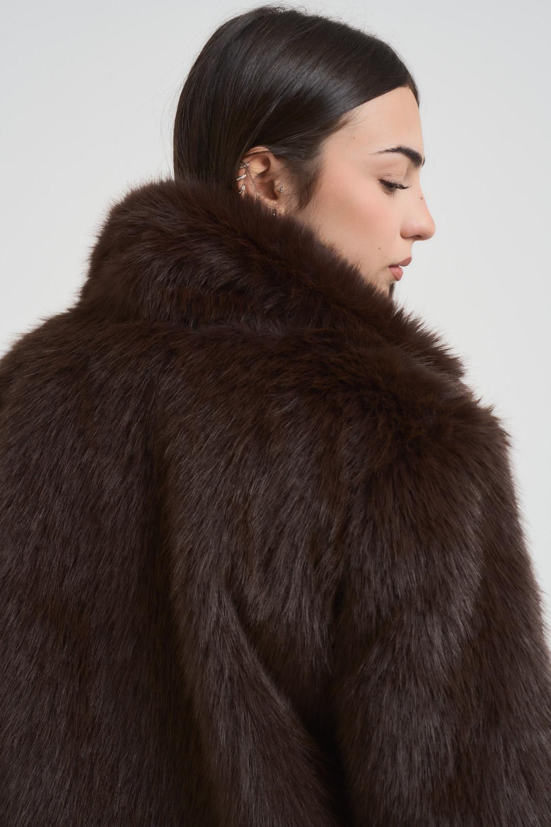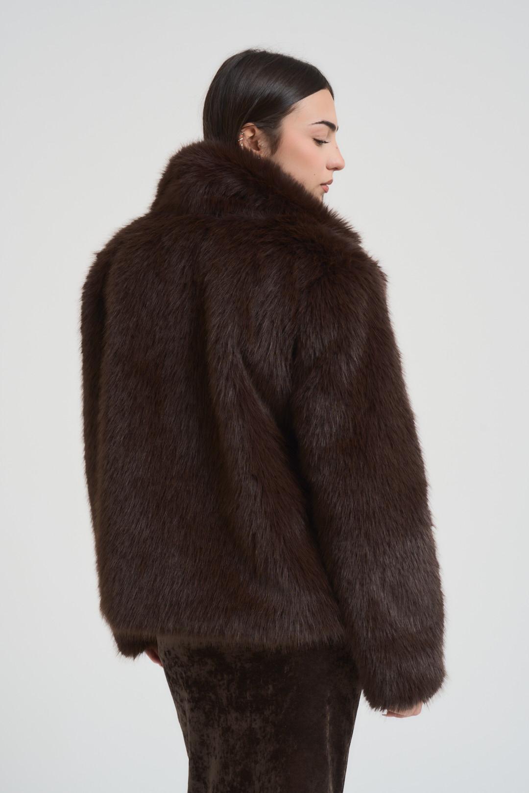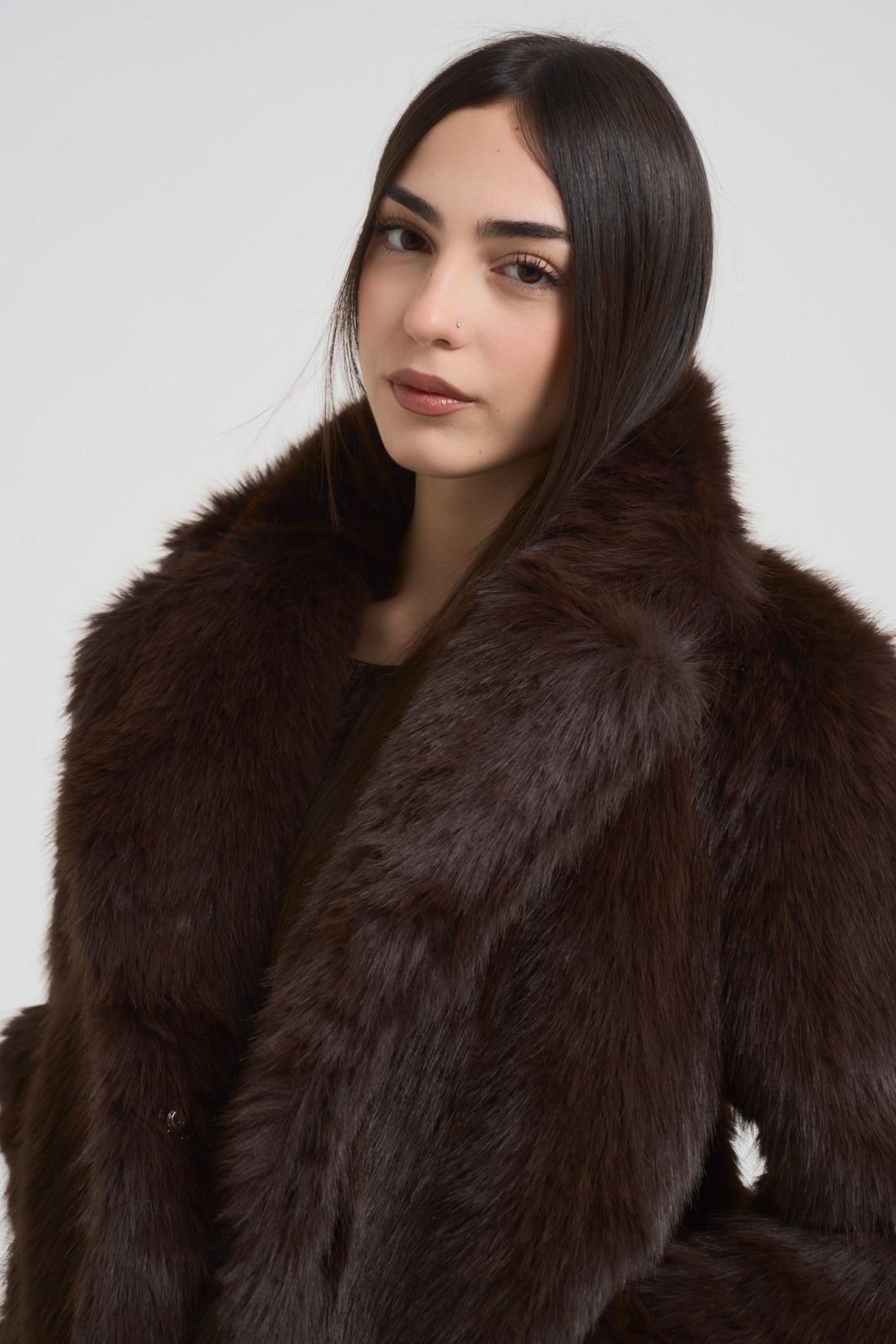 VITTO Ecopelliccia donna corta marrone. Modello con ampio collo a rever e tasche laterali. Composizione: 100% poliestere. La modella è alta 172 cm e indossa la taglia unica.