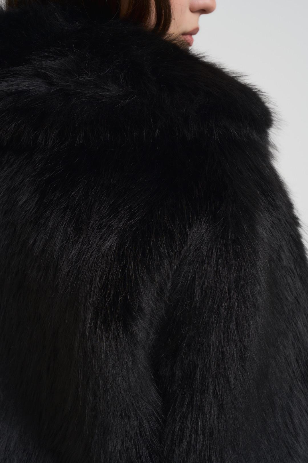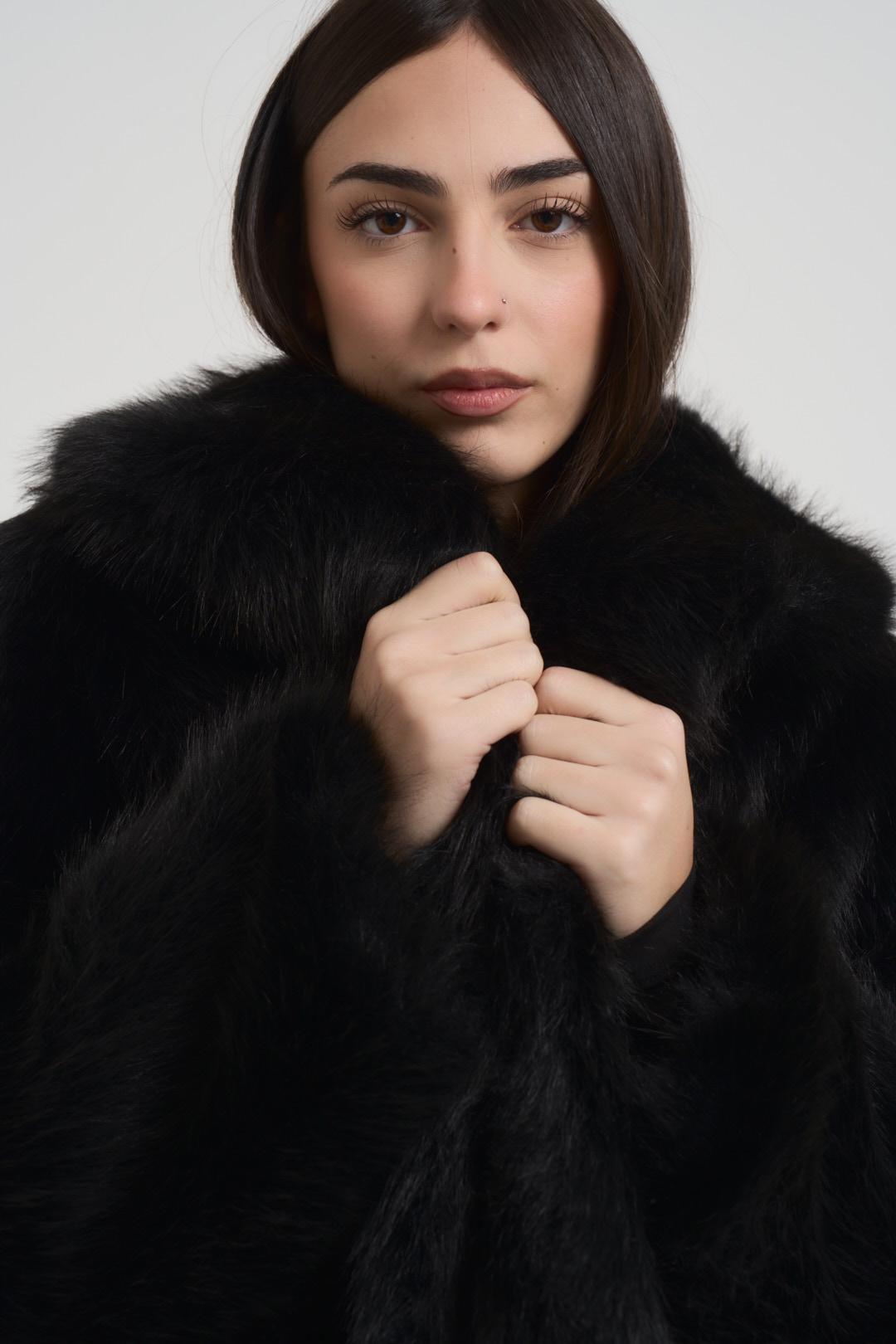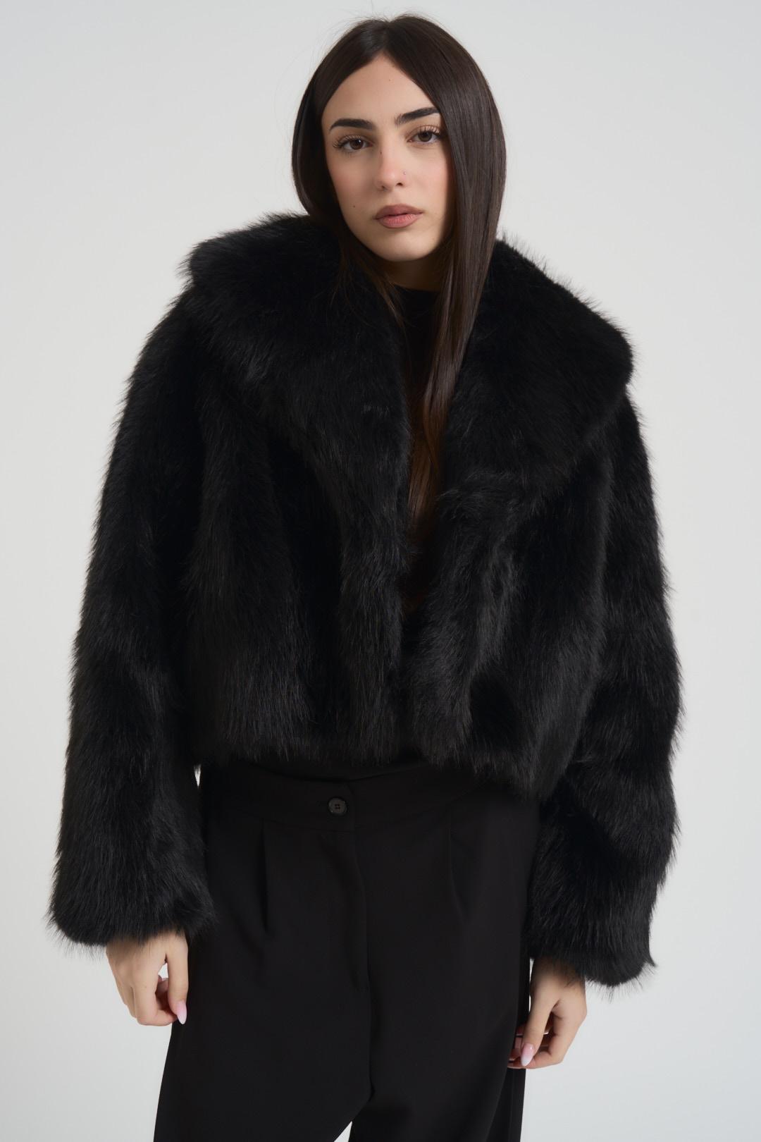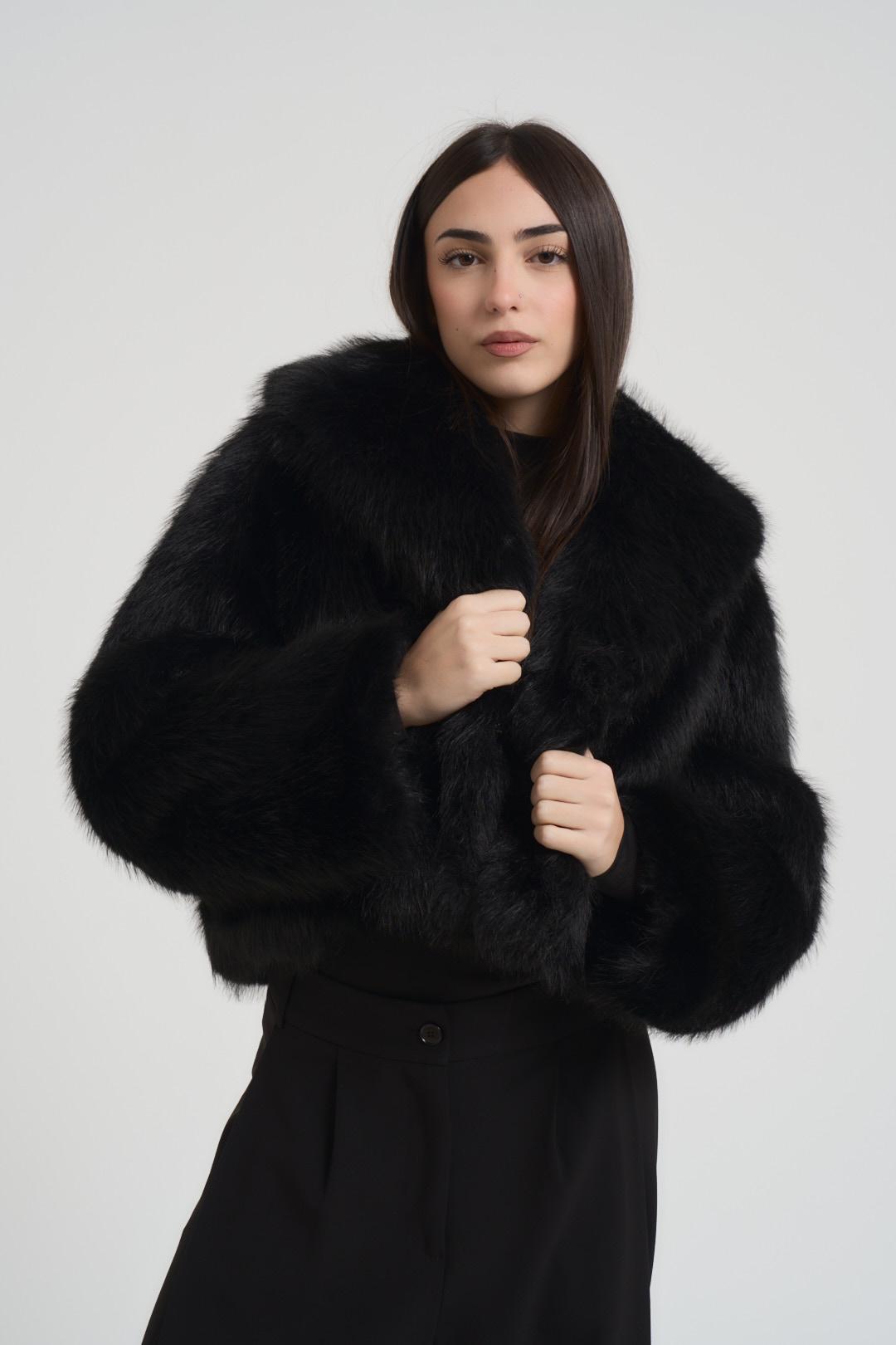 PHILIA Ecopelliccia donna corta nera. Modello cropped. Scollo con rever. Chiusura frontale. Tasche laterali. Maniche raglan e chiusura con bottoni automatici invisibili. Composizione: 100% poliestere. La modella è alta 172 cm e indossa la taglia S.