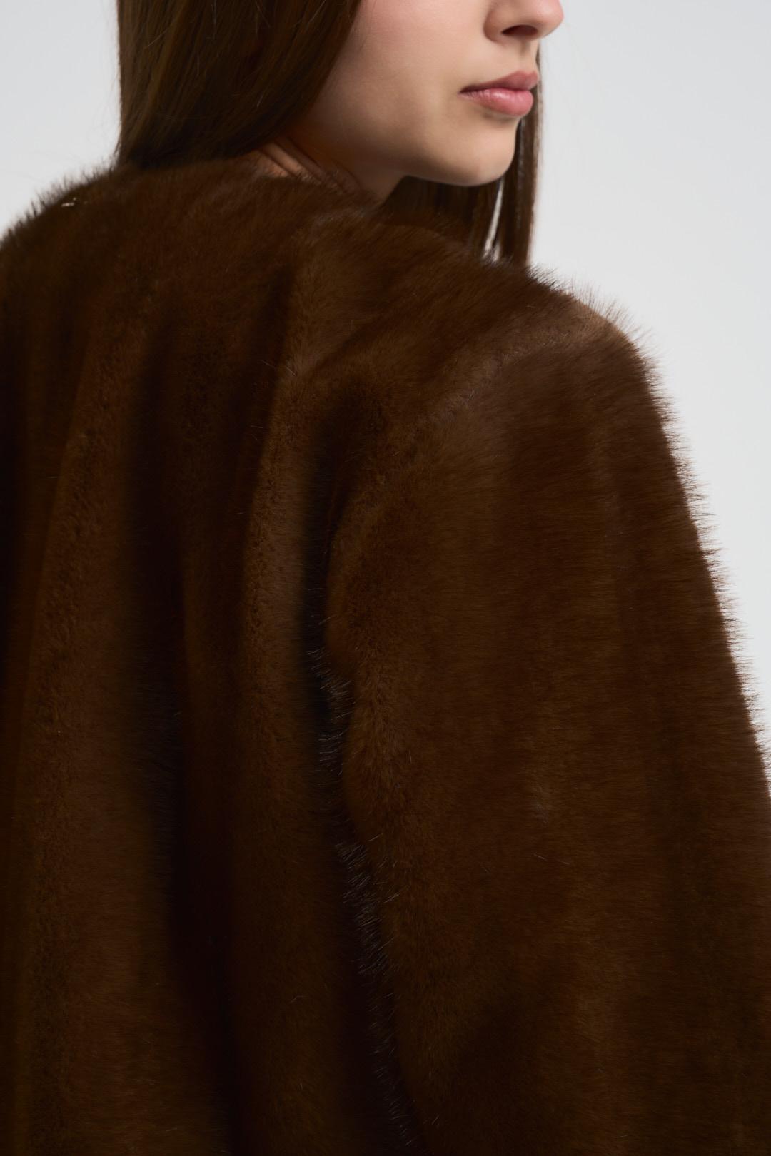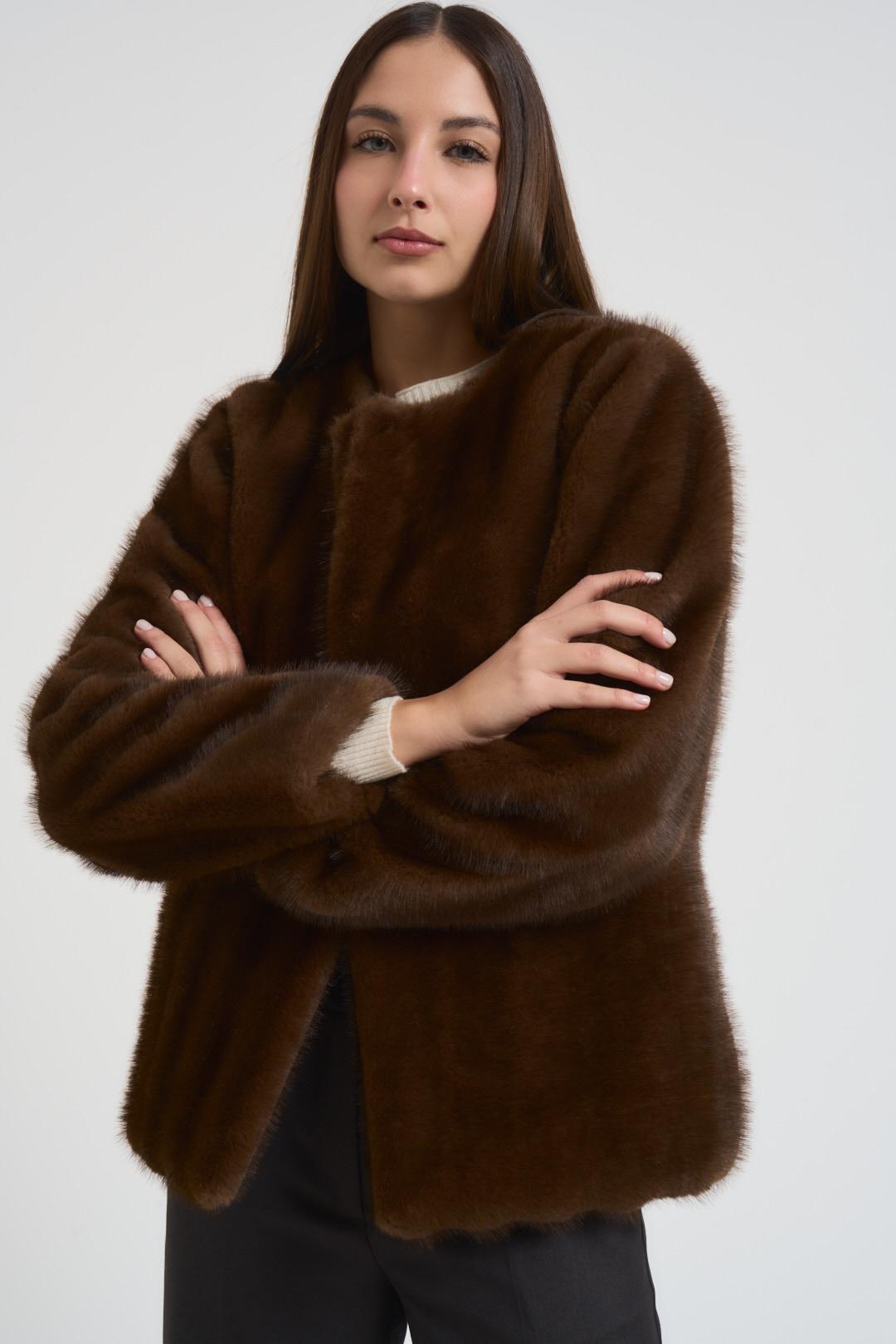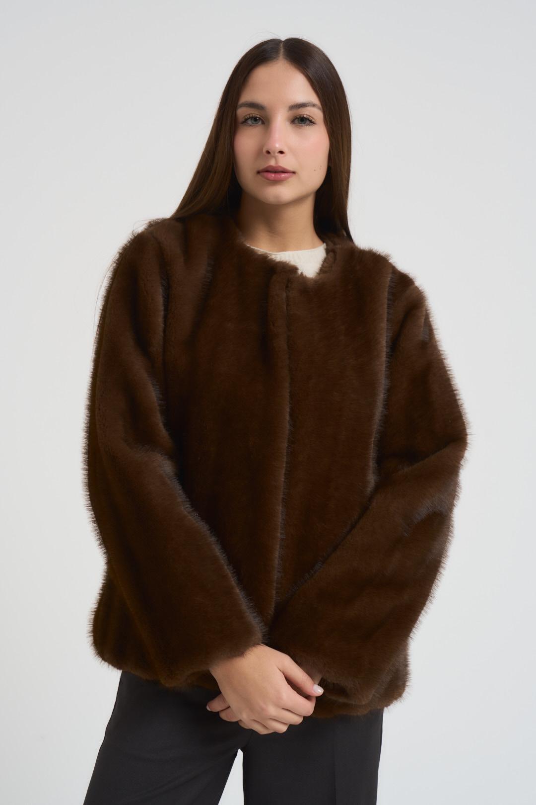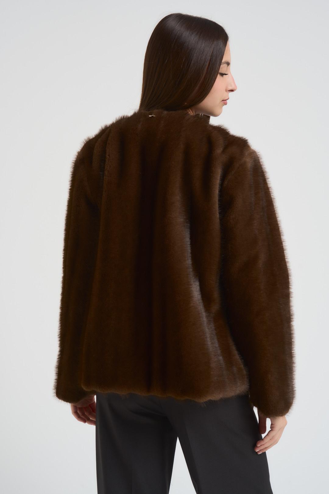 SOUVENIR CLUBBING Ecopelliccia donna girocollo moro. Modello corto. Chiusura frontale con gancetto a chiusura sul collo. Manica lunga. Composizione: 100% poliestere. La modella è alta 176 cm e indossa la taglia S.