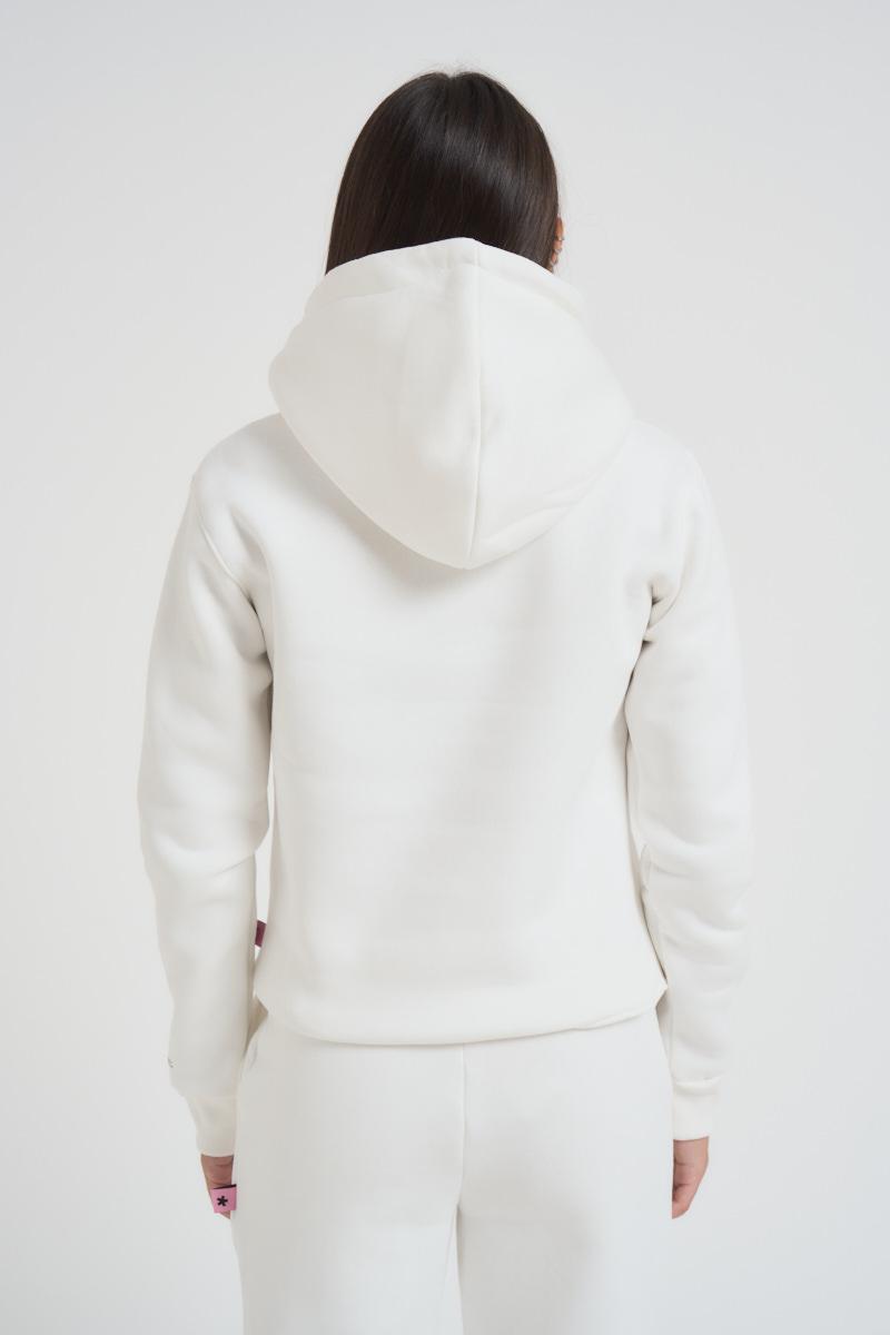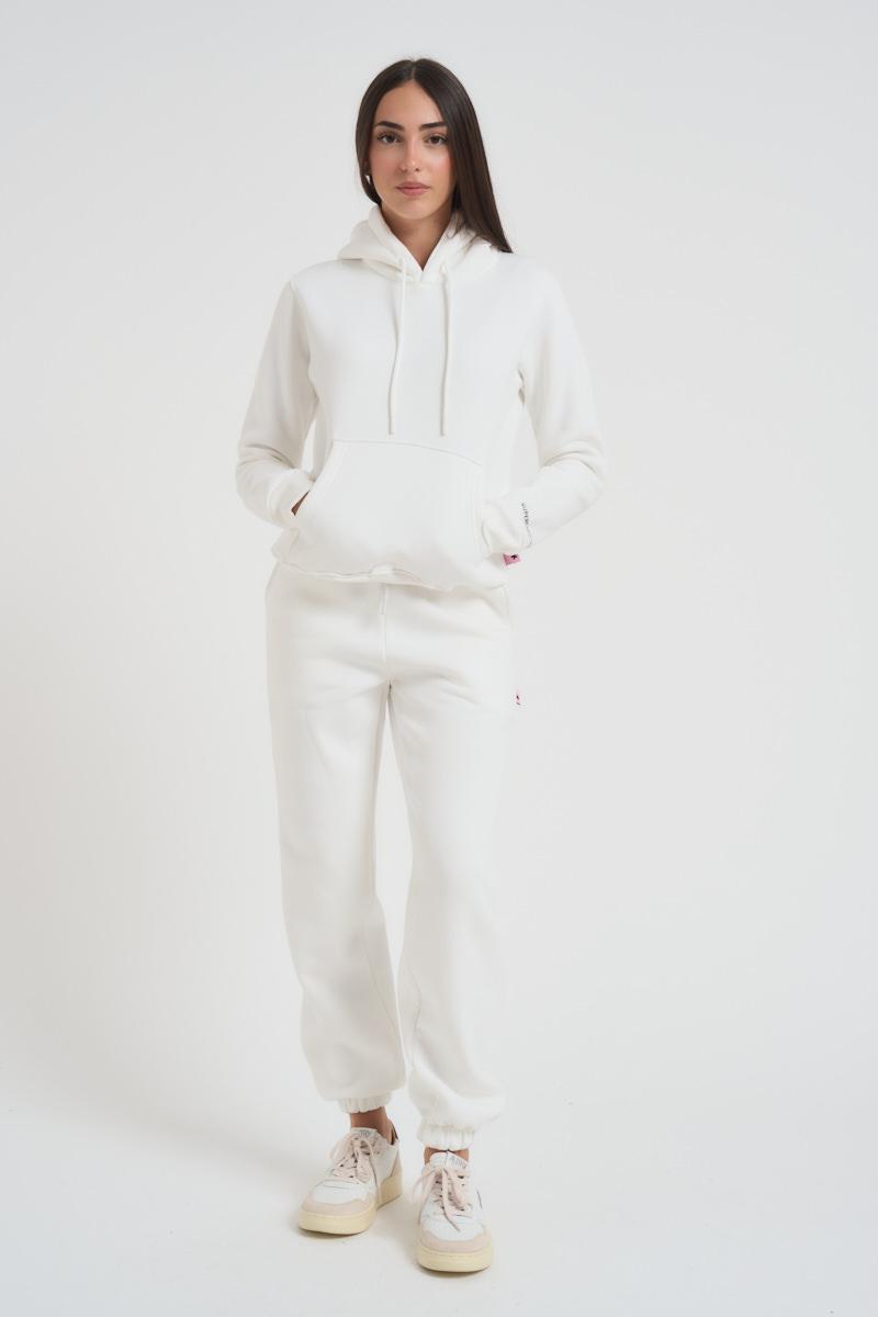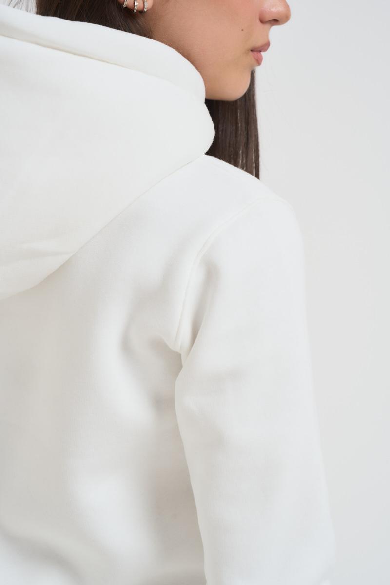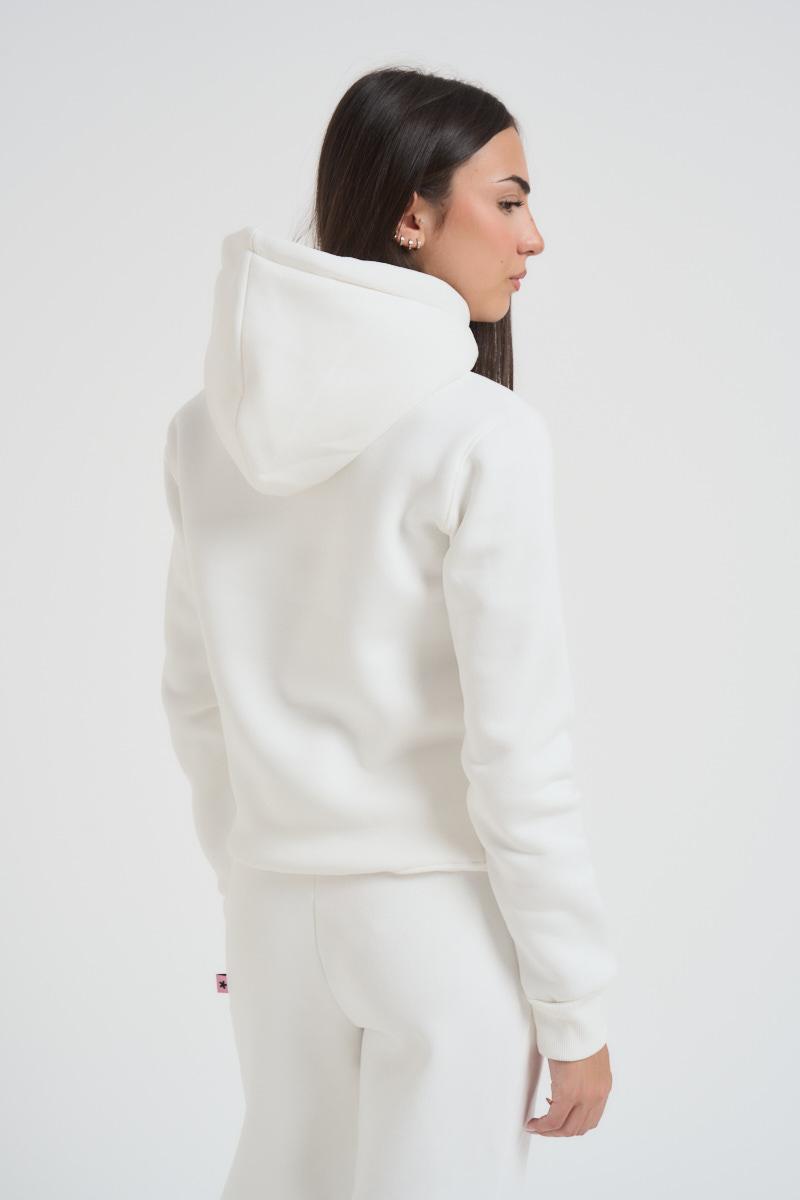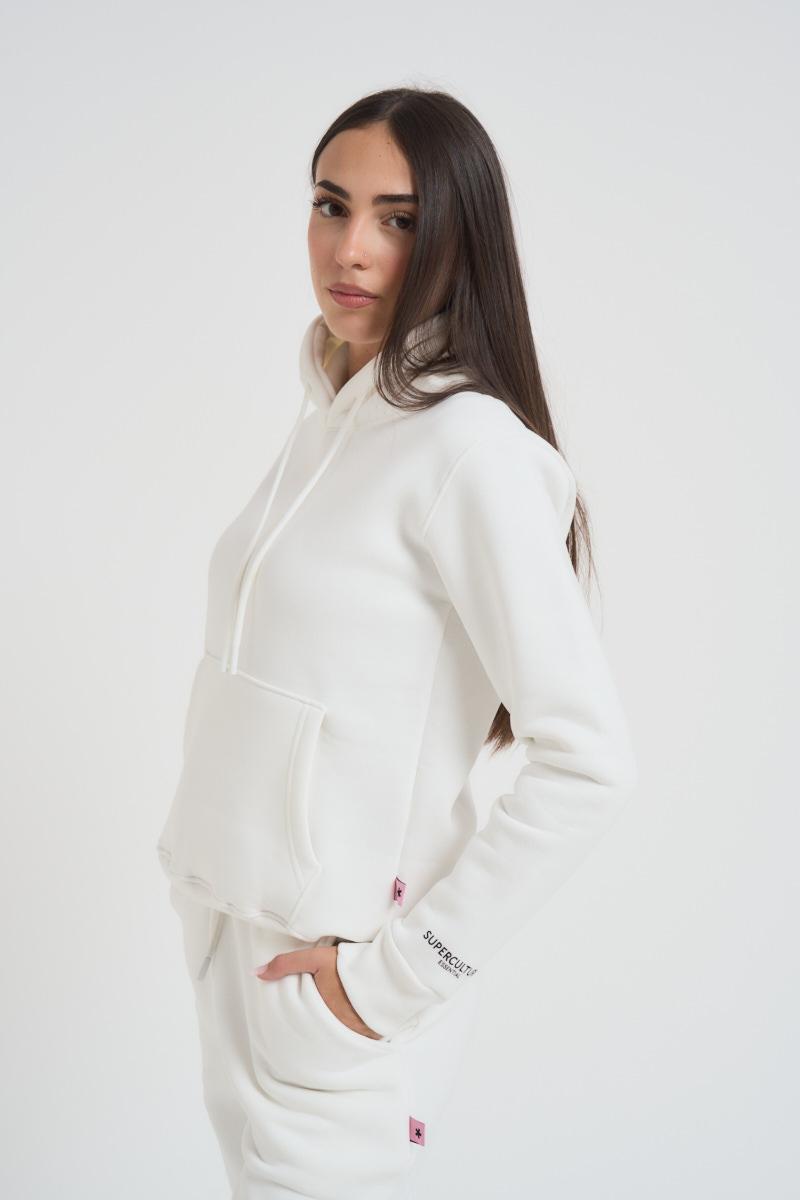 SUPERCULTURE Felpa donna Gretaz bianca. Modello con cappuccio e coulisse regolabile, logo stampato sulla manica in bianco. Orli elasticizzati a costine. Composizione: 65% cotone e 35% poliestere. La modella è alta 172cm e indossa la taglia S.
