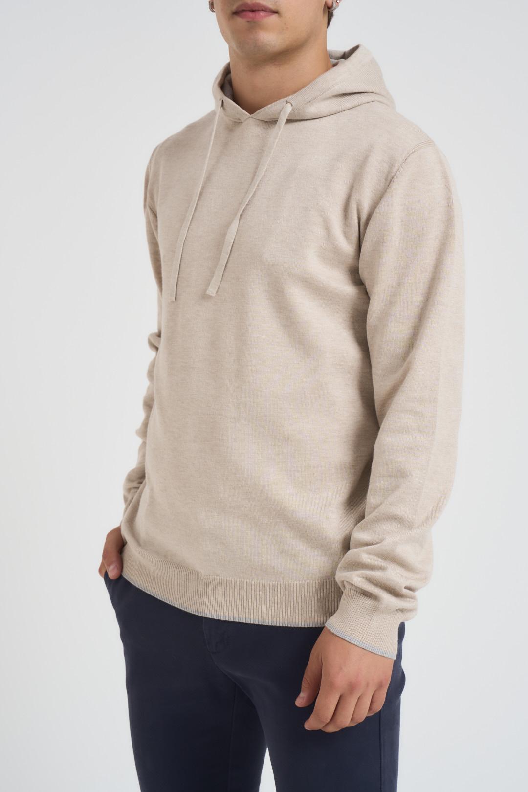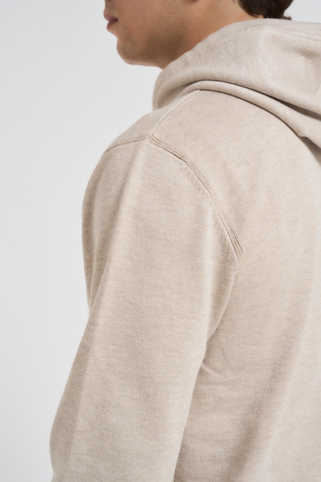HAMAKI-HO MILANO Felpa in maglia con cappuccio beige. Modello a maniche lunghe, coulisse regolabile. Fondo e polsi a costine. Colore: beige naturale. Composizione: 70% viscosa 30% nylon. Il modello è alto 185cm e indossa la tg L.