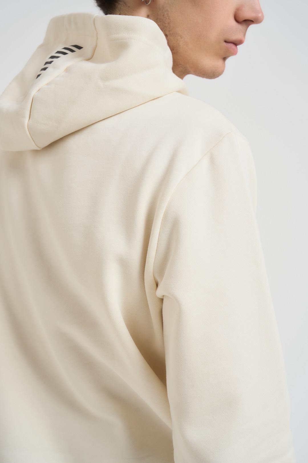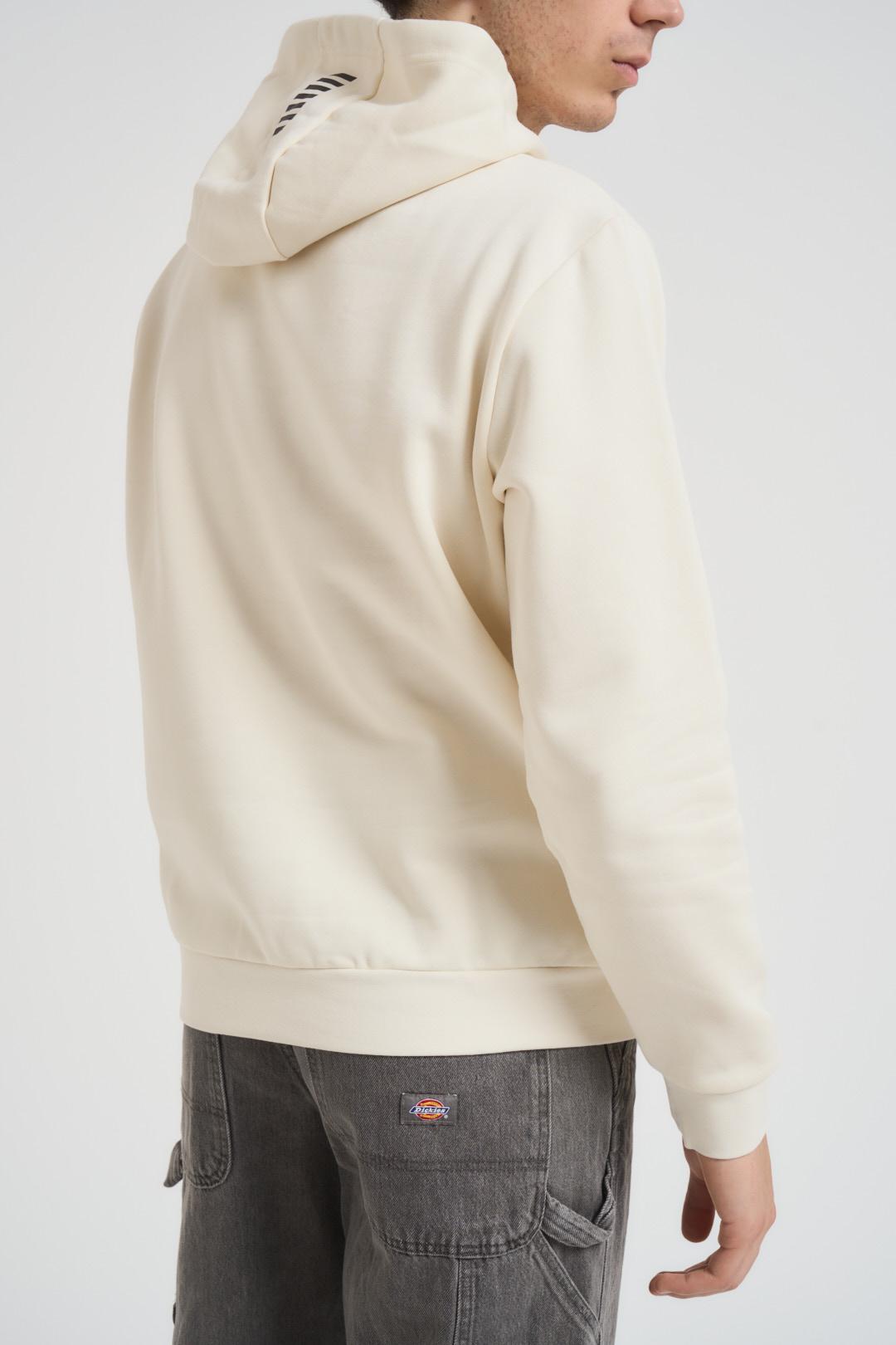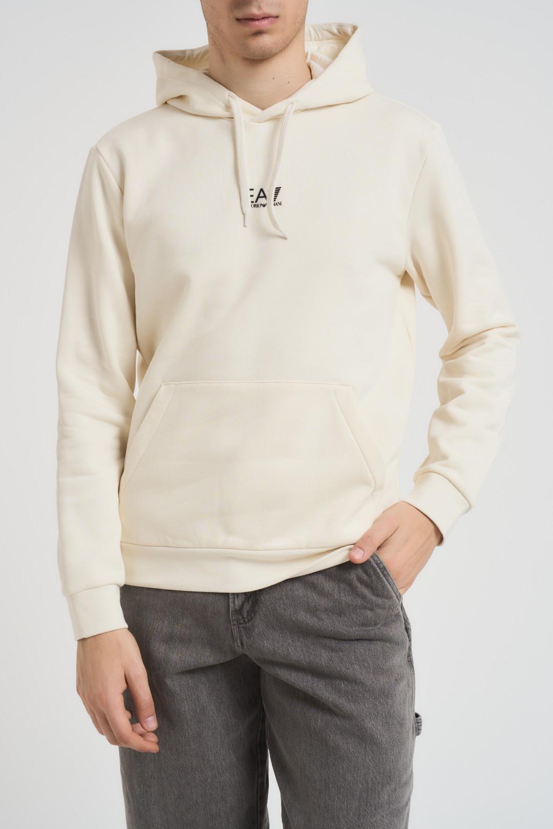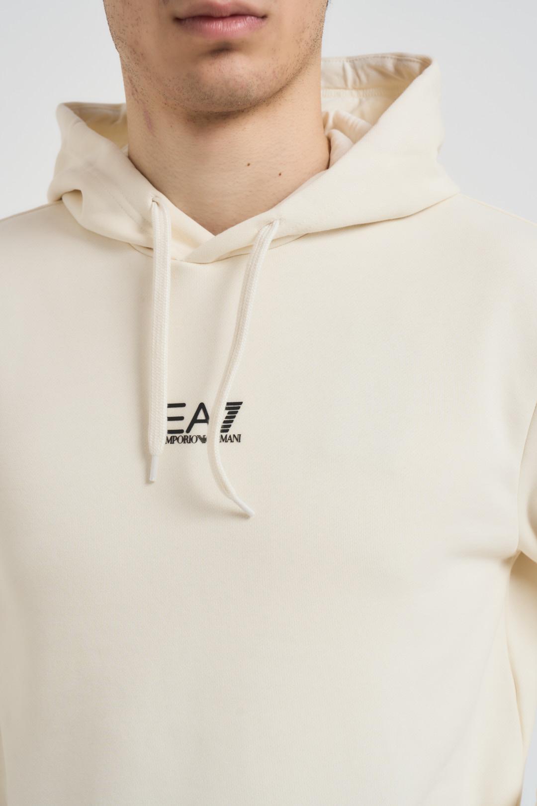EA7 Felpa uomo con cappuccio burro. Modello con logo centrale nero, regular fit, tasca a marsupio centrale. Composizione: 85% cotone, 15% poliestere. Il modello è alto 190cm e indossa la taglia L.