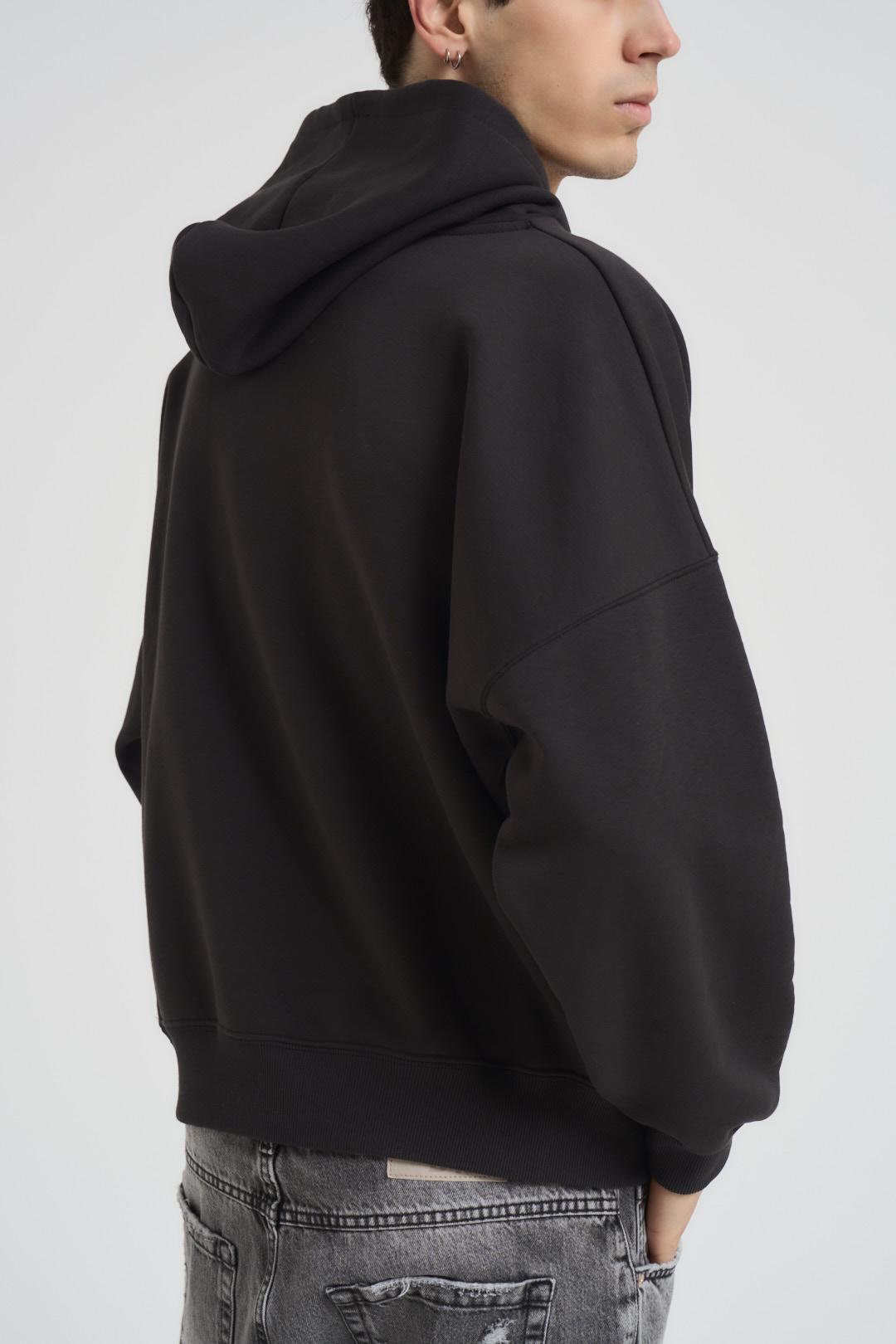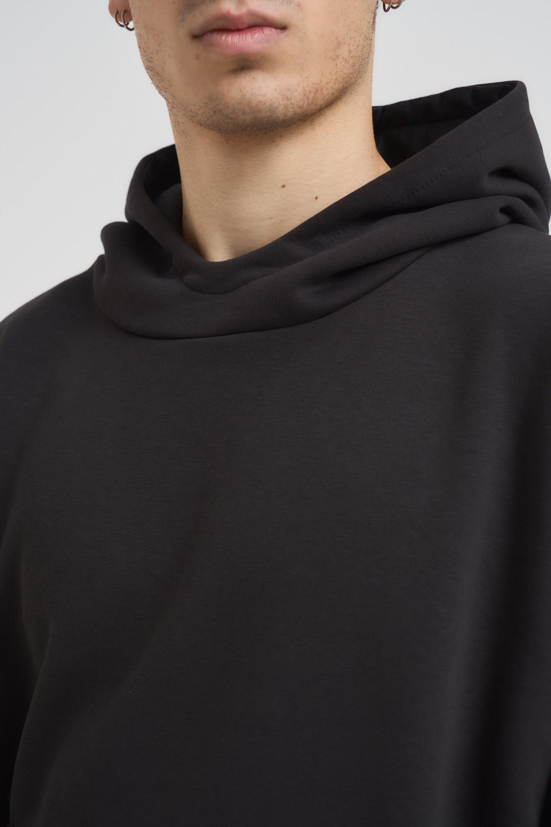 BERNA Felpa uomo con cappuccio grigio piombo. Modello boxy fit a manica lunga con dettagli a costine, stampa brand in bianco sulla manica a sinistra. Composizione: 100% Cotone. Il modello è alto 190cm e indossa la taglia L.